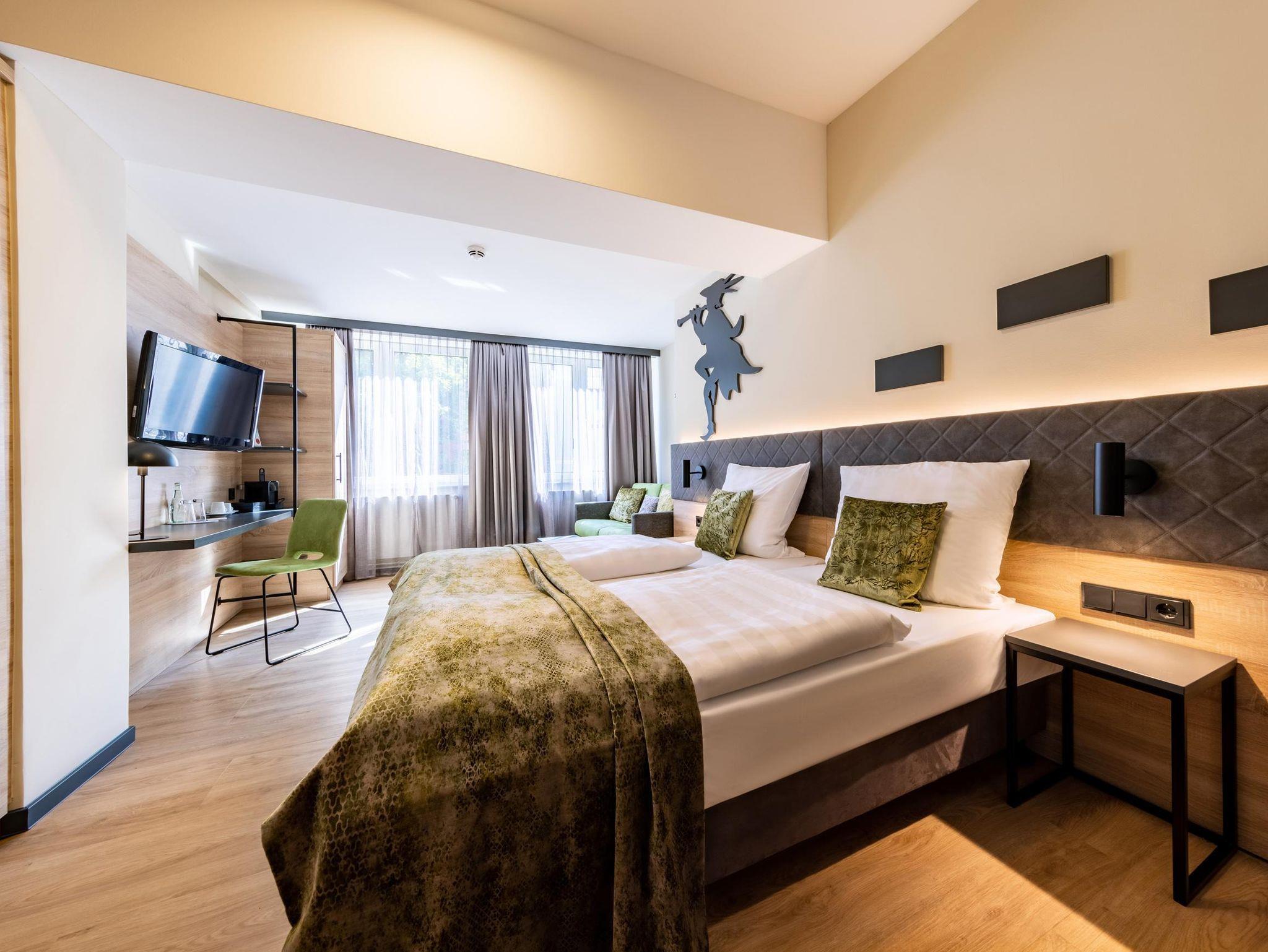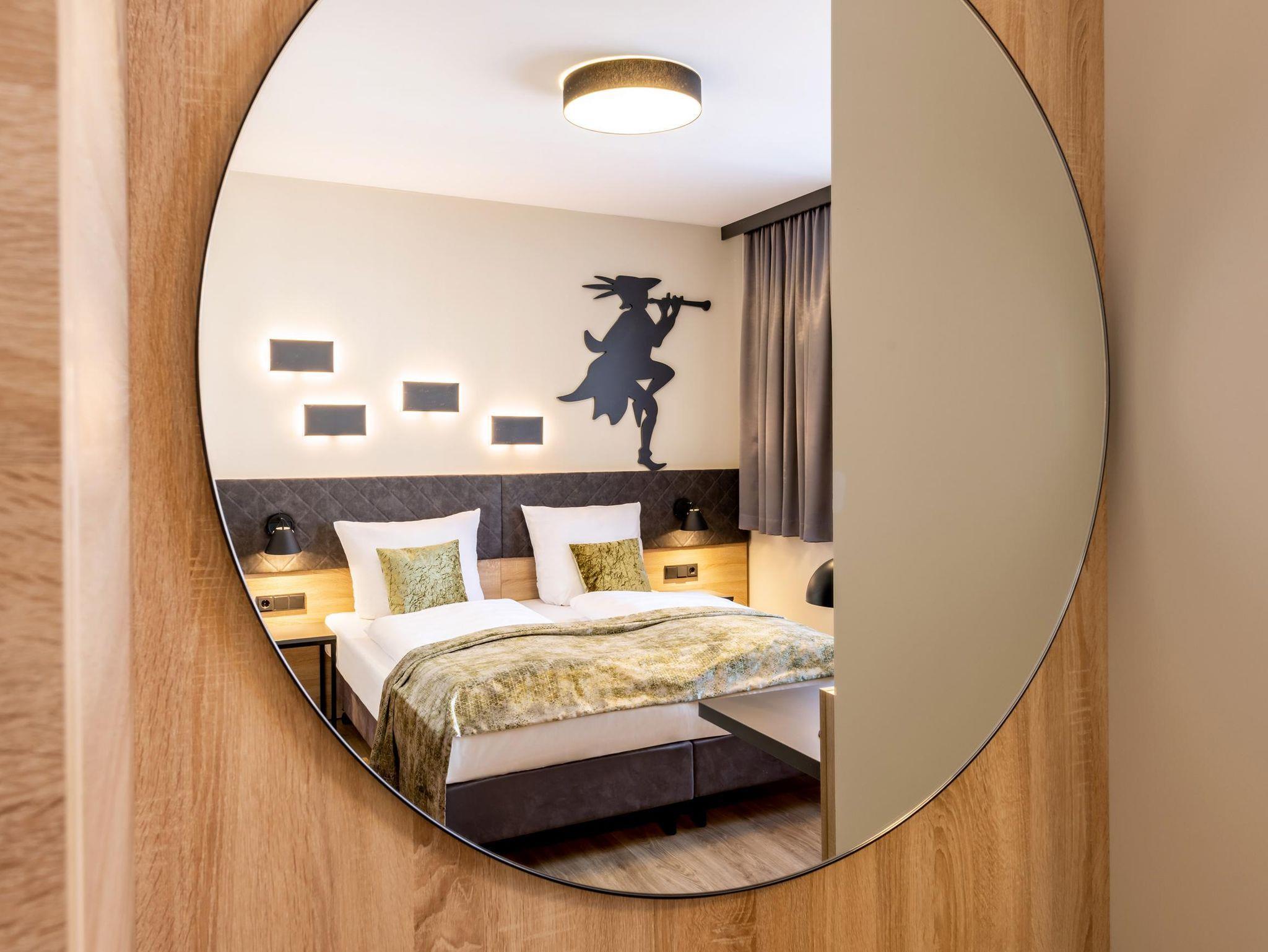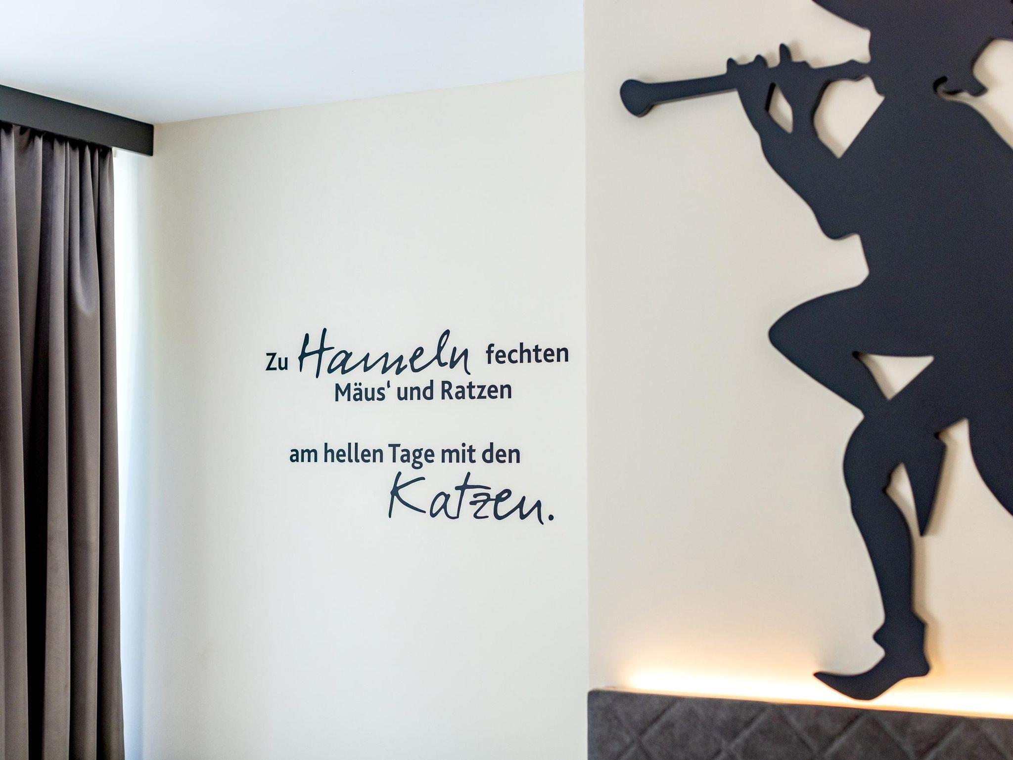 Mit vielen liebevollen Details haben wir die berühmte Rattenfängersage für Sie wieder aufleben lassen. Die Deluxe-Kategorie empfängt Sie mit einem gemütlichen Boxspringbett, einer Nespresso-Kaffeemaschine und Vorhängen zum Abdunkeln für die perfekte Nachtruhe. Unser Badezimmer ist mit einer großzügigen Ablagefläche ausgestattet und teilweise mit einer Walk-In Dusche.