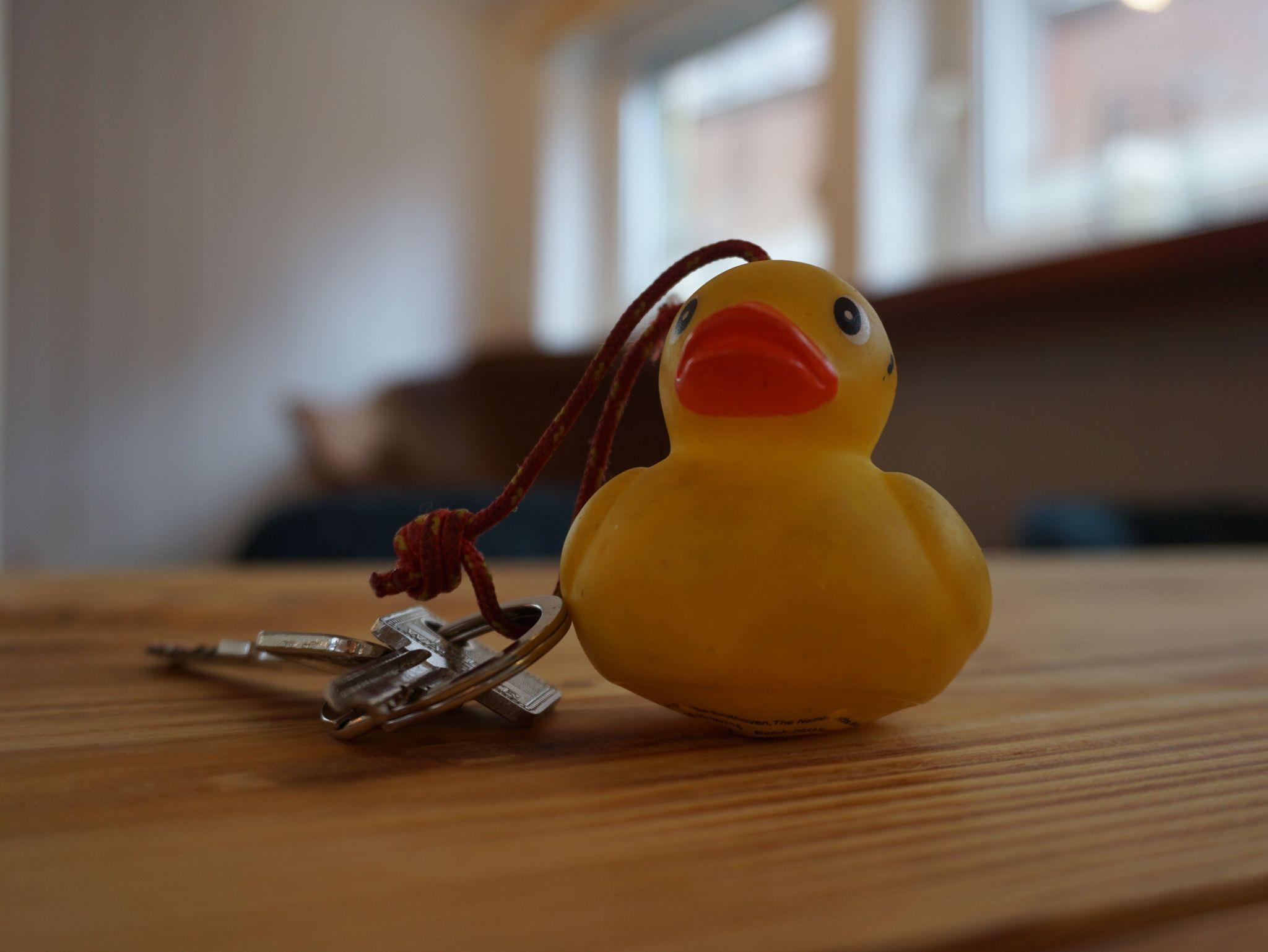 Und damit der Schlüssel des Kunstkudders nicht verloren geht, falls er mal ins Wasser fällt, wird er von einer Gummiente bewacht, die schwimmen kann. Mit dem bereitstehenden Kescher können die beiden dann wieder an Bord geholt werden.