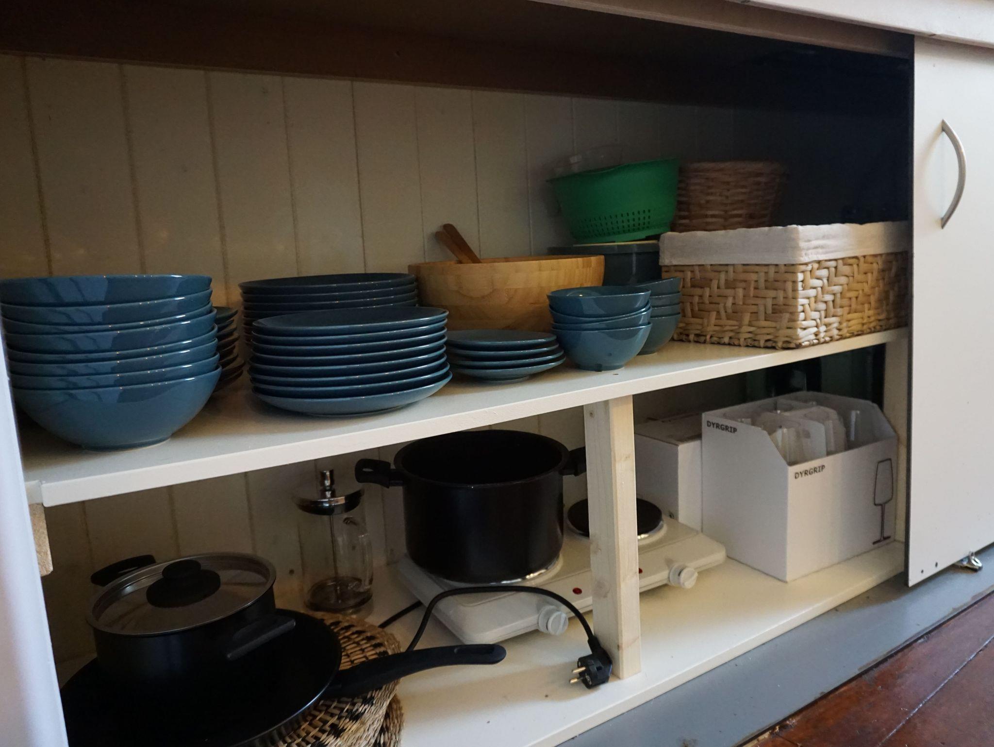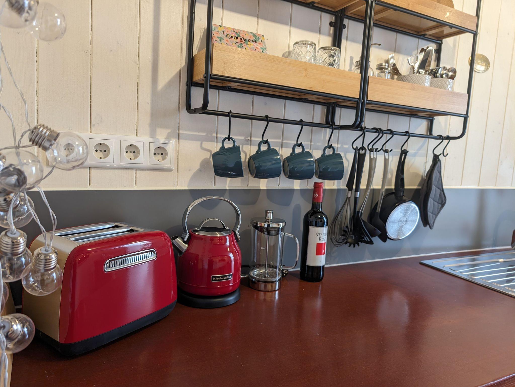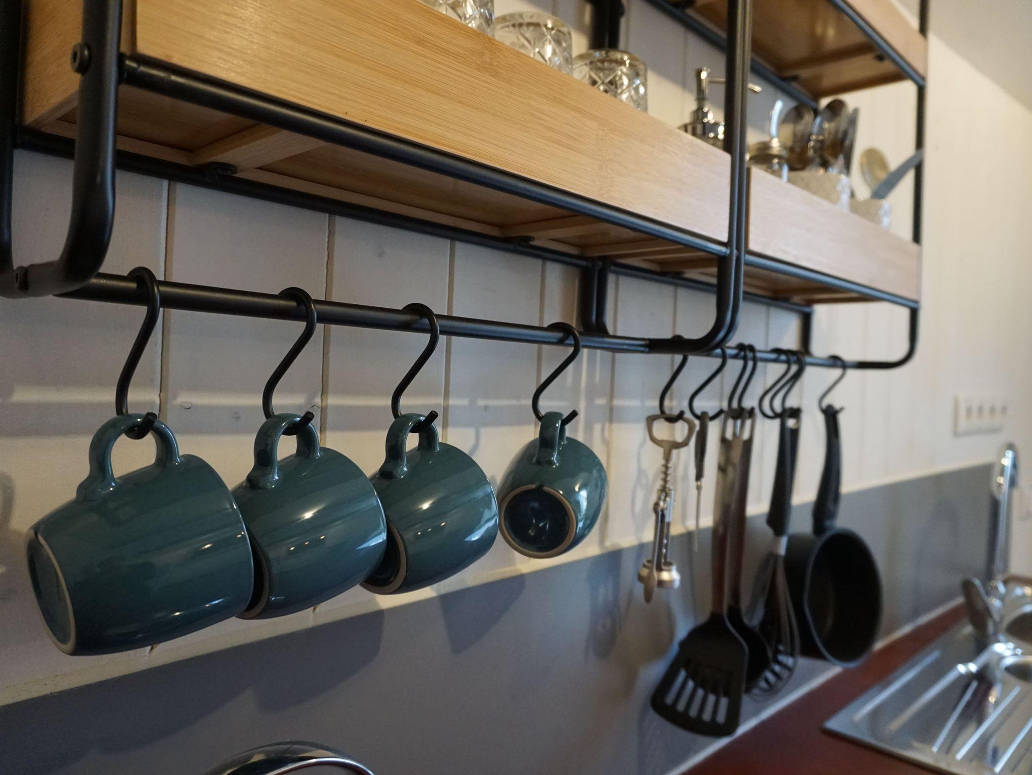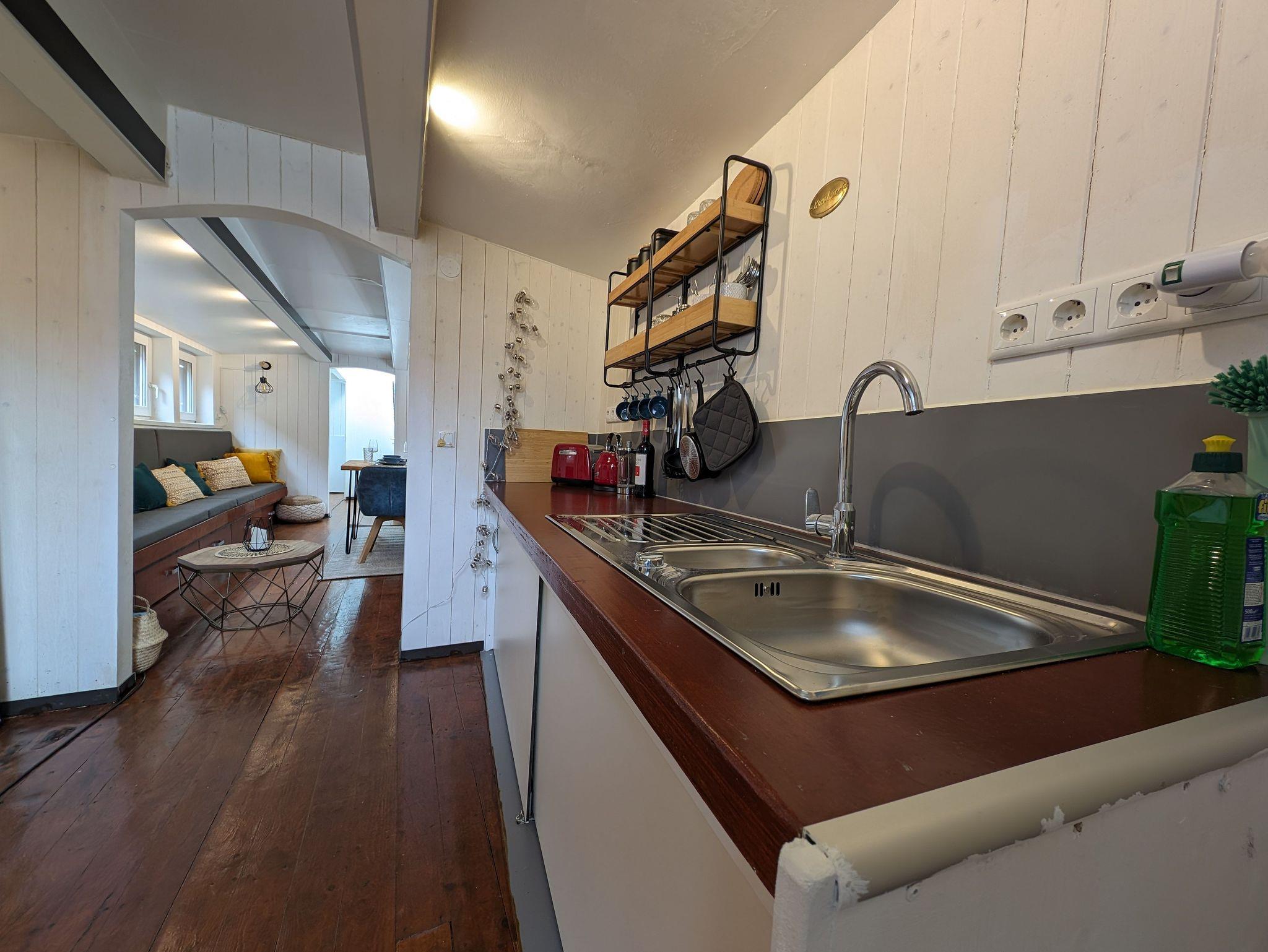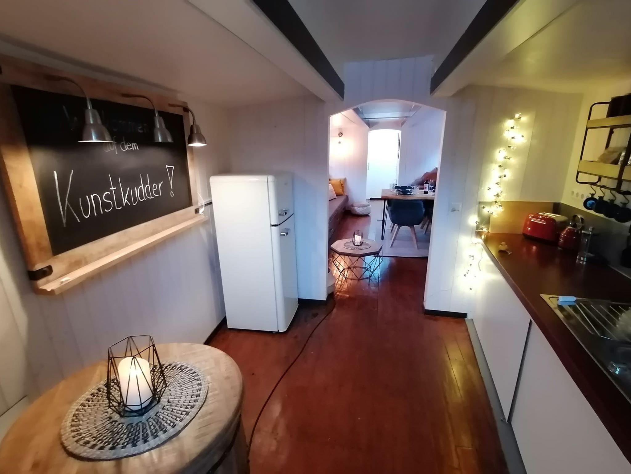 Beim Betreten des Kunstkudders durch die Eingangsklappe gelangt man über eine Treppe direkt in den Küchenbereich. Es gibt dort einen Heizkörper, ein Spülbecken mit fließendem Wasser, eine Doppelkochplatte, eine französische Kaffeepresse und einen Kühlschrank, einen Toaster sowie einen Wasserkocher im Retro-Stil. Im Einbauschrank und im Regal befinden sich Töpfe, Pfanne, Geschirr und Besteck. Ein Barfass mit Gläsern vervollkommnet den rustikalen Look des maritimen Feriendomizils und kann zum Lagern von Flaschen verwendet werden.