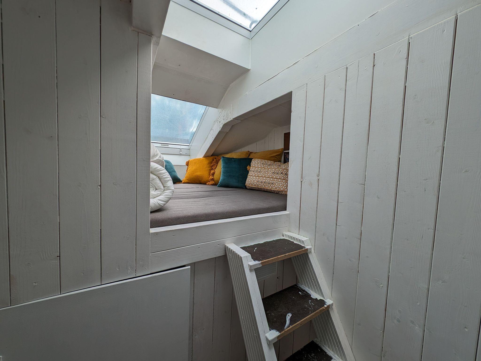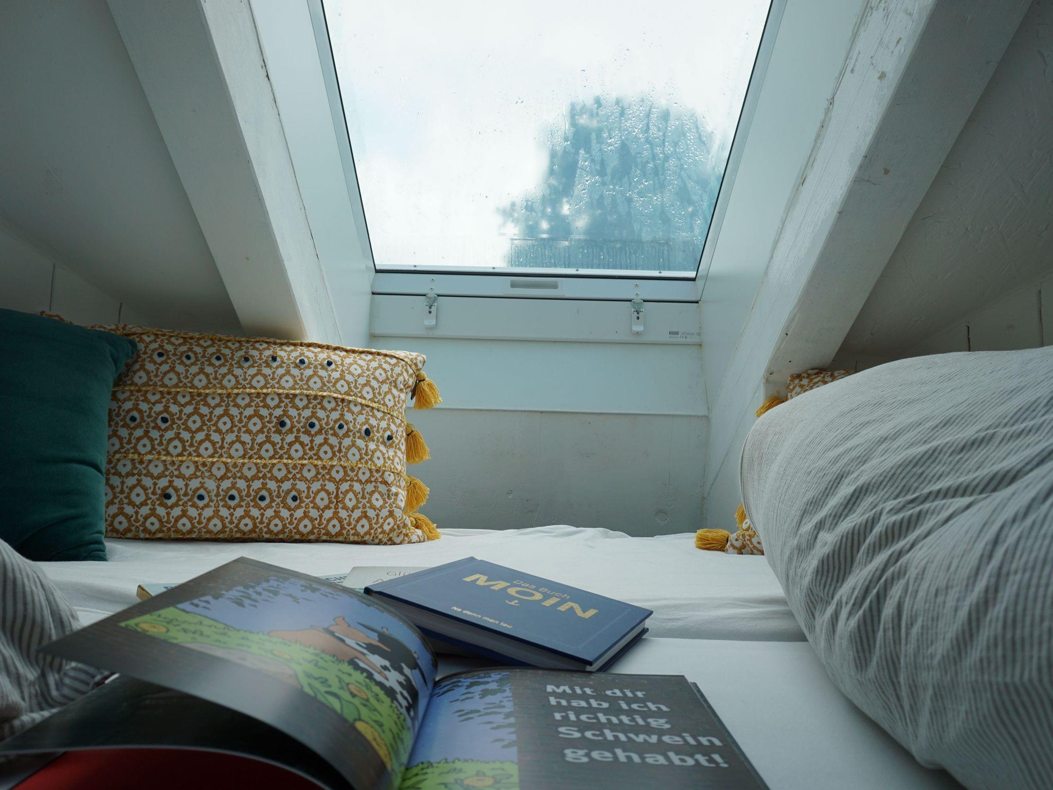 An den Wohnraum schließt sich ein kleiner Flur an. Hier gibt es eine Garderobe und den Zugang zur Schlafkoje, die man über eine Treppe erreicht. Hier gibt es zwei große Fenster, sodass man vom Bett in den Himmel blicken kann.