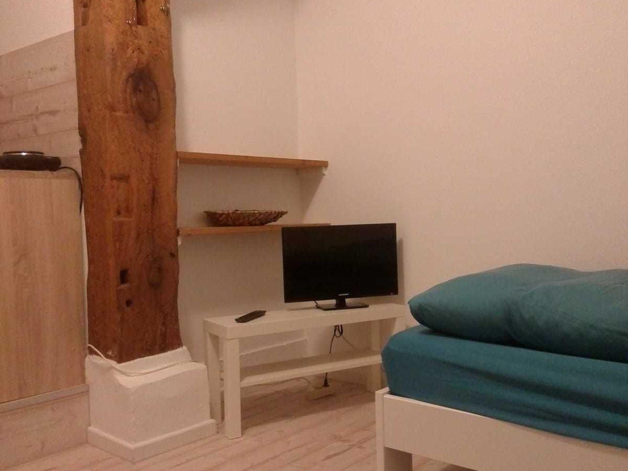 Die Ferienwohnung 2 besteht aus einem kombinierten Wohn-/Schlafzimmer (ca. 15 qm) mit einem Bett, einer integrierten Kochnische und einem WC/Duschbad. Zu der Kochnische gehören neben zwei Kochplatten eine Kaffeemaschine, ein Wasserkocher und ein Toaster. Im Wohn-/Schlafbereich steht ein Fernseher mit Flachbildschirm zur Verfügung. Ein bequemer Fernsehsessel mit Leseleuchte lädt zum entspannten Fernsehen oder Lesen ein. WLAN ist selbstverständlich vorhanden.
