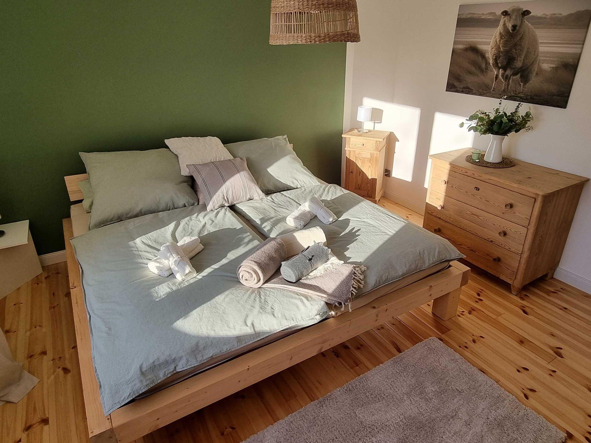 Ganz neu ausgebaute, helle Wohnung, modern eingerichtet. Offene, komplett ausgestattete Küche und ein Schlafzimmer mit großem Doppelbett. Wohn- / Esszimmer mit zusätzlicher Schlafcouch, dazu ein Badezimmer mit WC und Dusche. Die Ferienwohnung hat einen separaten Eingang, einen PKW-Stellplatz auf dem umzäunten Grundstück und vor der Küche befindet sich eine Sonnenterrasse mit Garten- und Grillgarnitur. Es handelt sich um eine reine Nichtraucherwohnung mit Holz- bzw. Fliesenböden, hohen Zimmern in sehr ruhiger Lage an einer Anwohnerstraße direkt am Elbdeich.