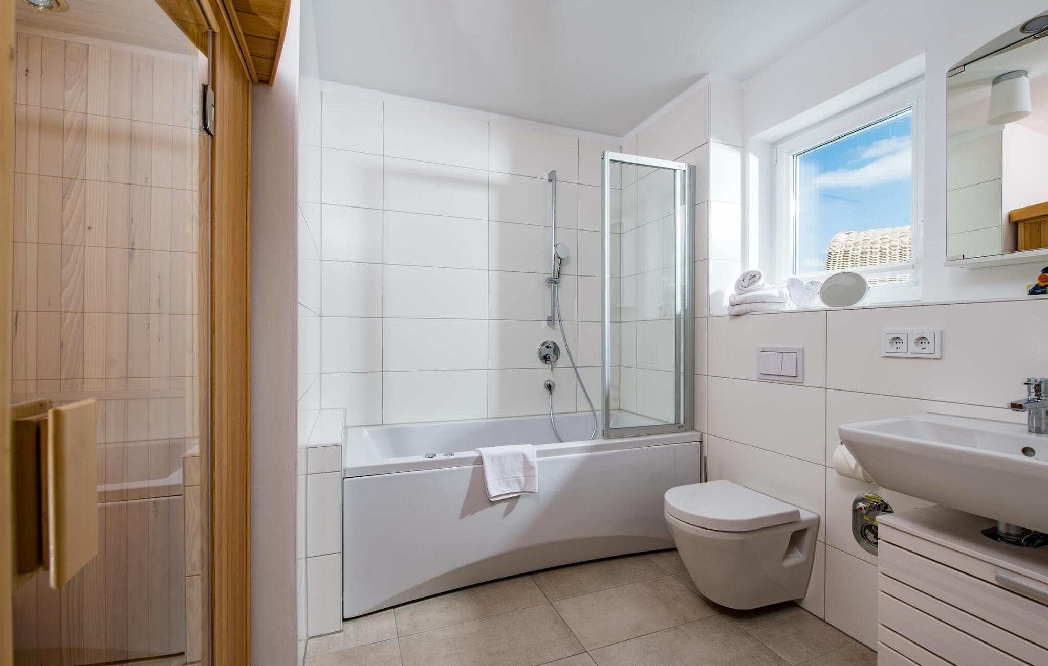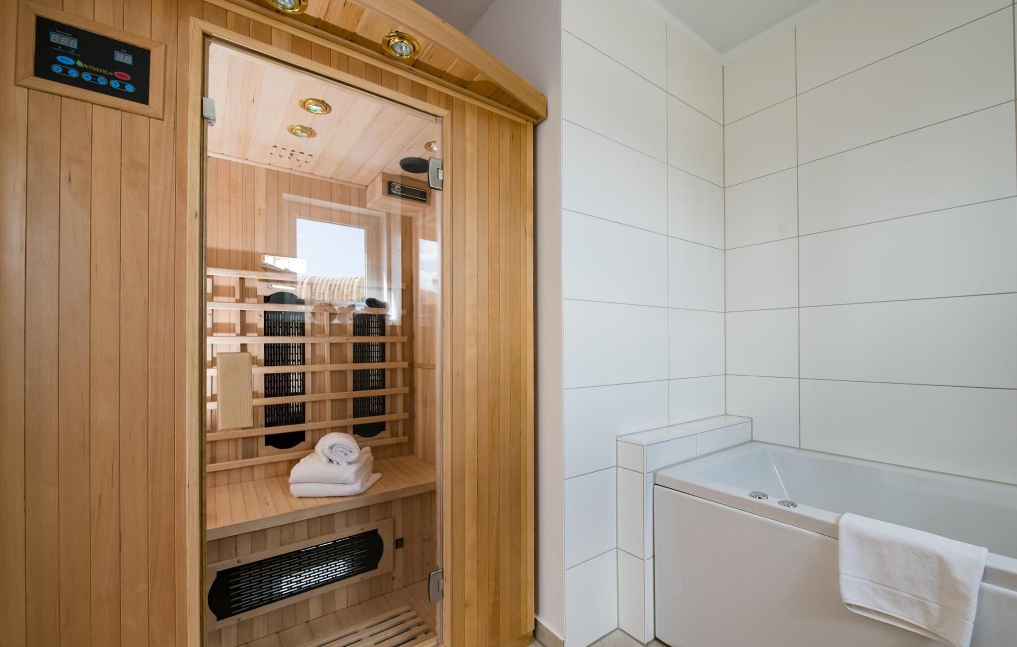 Udover et badekar har badeværelset også en varme-infrarød kabine.