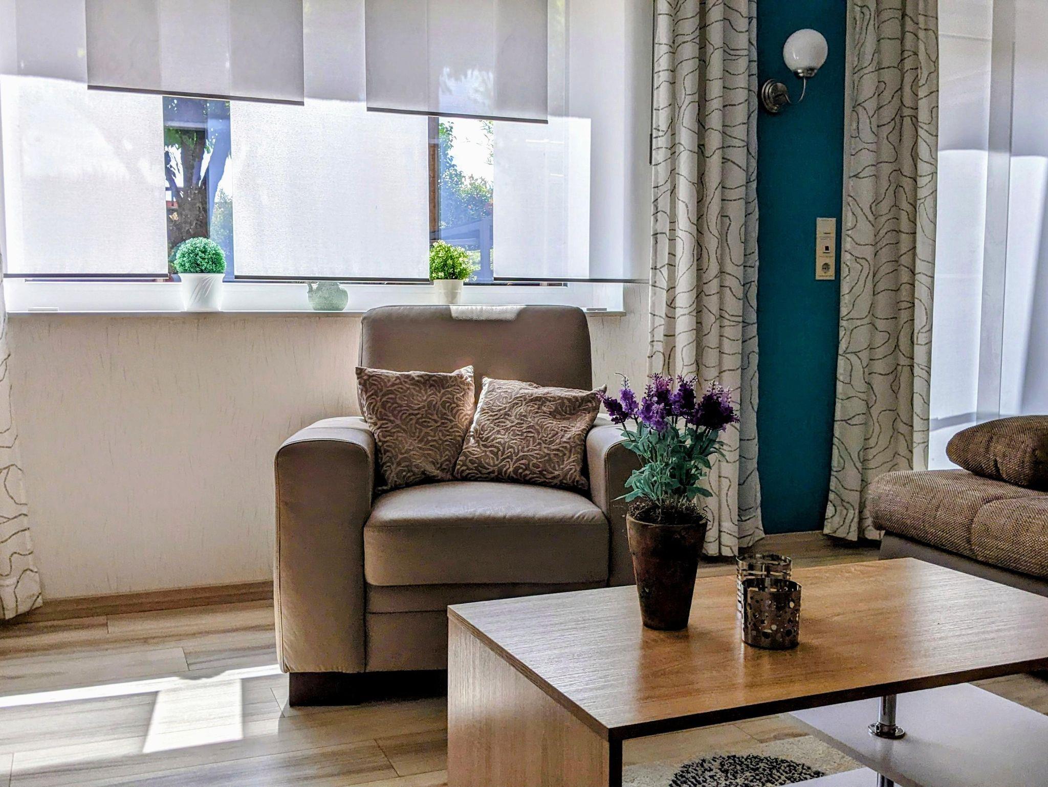 Dort können Sie Ihren Aufenthalt mit einem Buch oder Gläschen Wein genießen. Die ruhige Lage der Wohnung mit eigenem Eingang lässt Sie entspannen und entschleunigen.