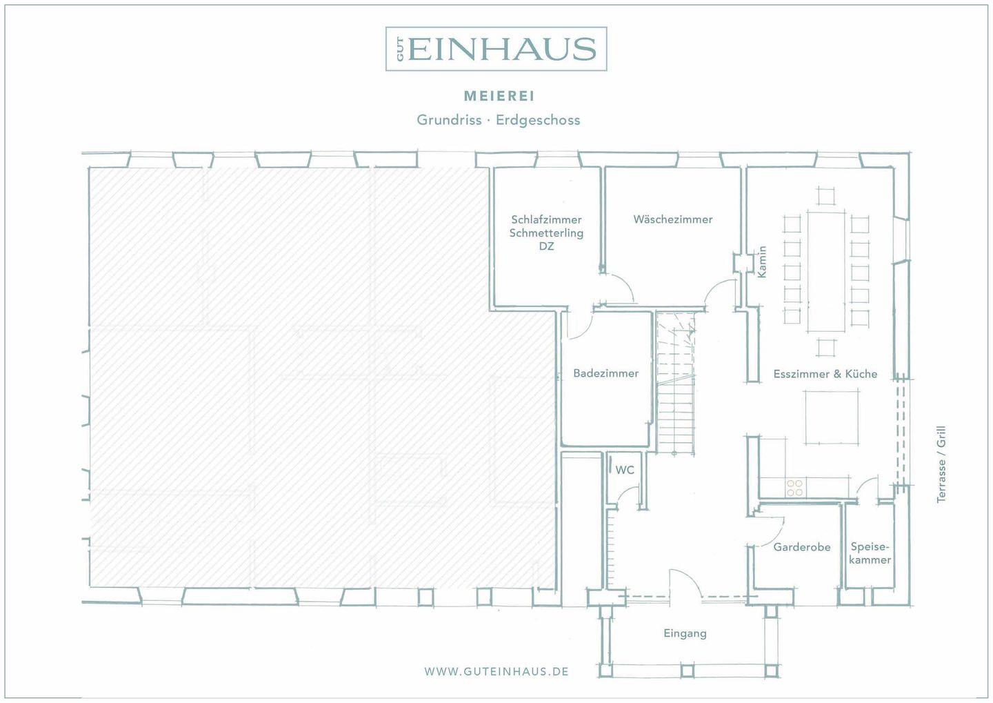 Eingebettet in die Hofanlage von Gut Einhaus umgeben von Natur und Parkanlagen genießt die Meierei Ruhe und Alleinlage. Der Tennisplatz, der beheizte Pool und zahlreiche Spazierwege in der Umgebung versprechen einzigartige Freizeiterlebnisse. Es können sich bequem 12 Personen bewegen und entspannen. Das weitläufige Wohnzimmer und die großzügige Küche mit offenem Kamin schaffen eine gemütliche Atmosphäre für geselliges Beisammensein und Erholung.