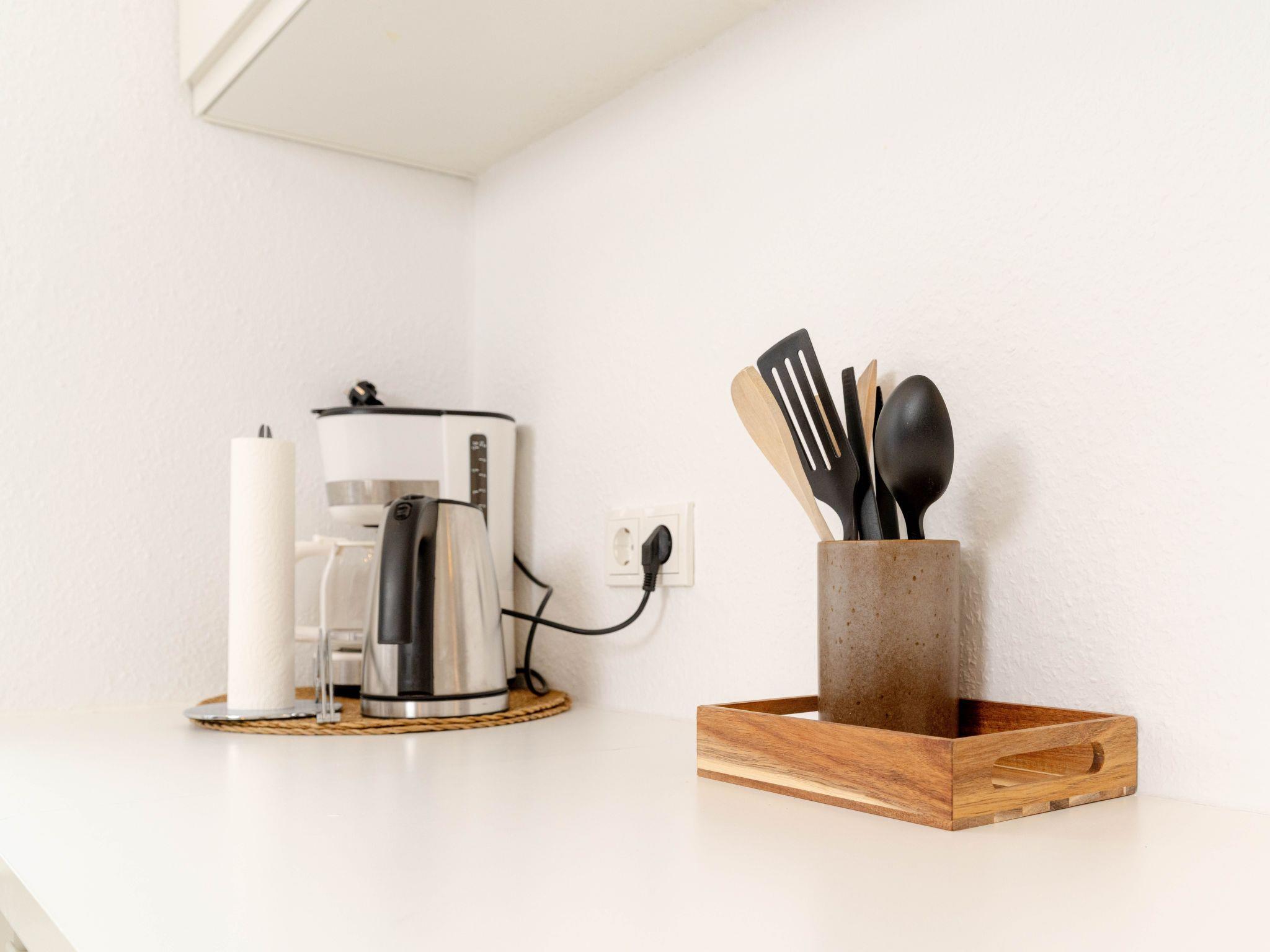 The flat is located on the first floor and is comfortably furnished to make your stay as pleasant as possible. It has a bedroom and a bathroom with shower. Practical amenities such as a washing machine and tumble dryer are available for your exclusive use, so you can feel at home even during longer stays. In the kitchenette, you will find everything you need, including a filter coffee machine, kettle and dishwasher, to make your stay even more comfortable.