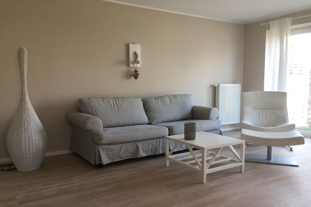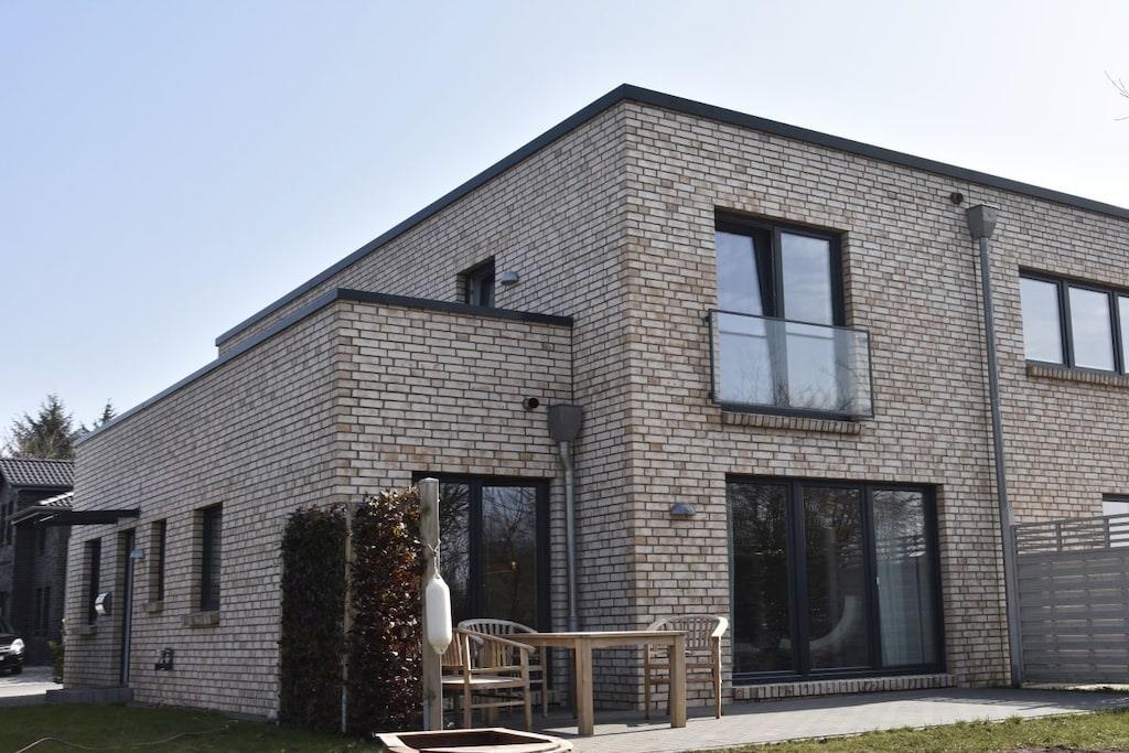 The holiday home is located in a quiet residential area and boasts modern architecture and bright, spacious rooms spread over two floors. 120 square meters offer space for a large, modern, and comfortable living room-kitchen area, two bedrooms, a bathroom with underfloor heating and a shower, a balcony, and a terrace. The garden offers unobstructed views of fields and nature.