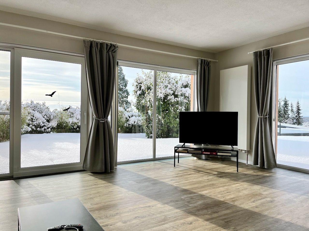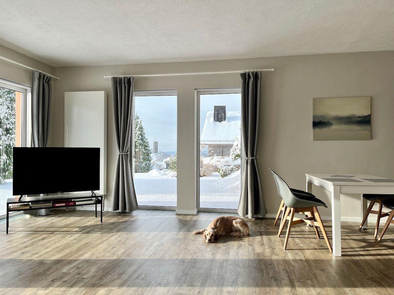 Die Ferienwohnung, insbesondere der Wohn-Eßbereich, ist durch die großen Fensterflächen hell und modern ausgestattet.