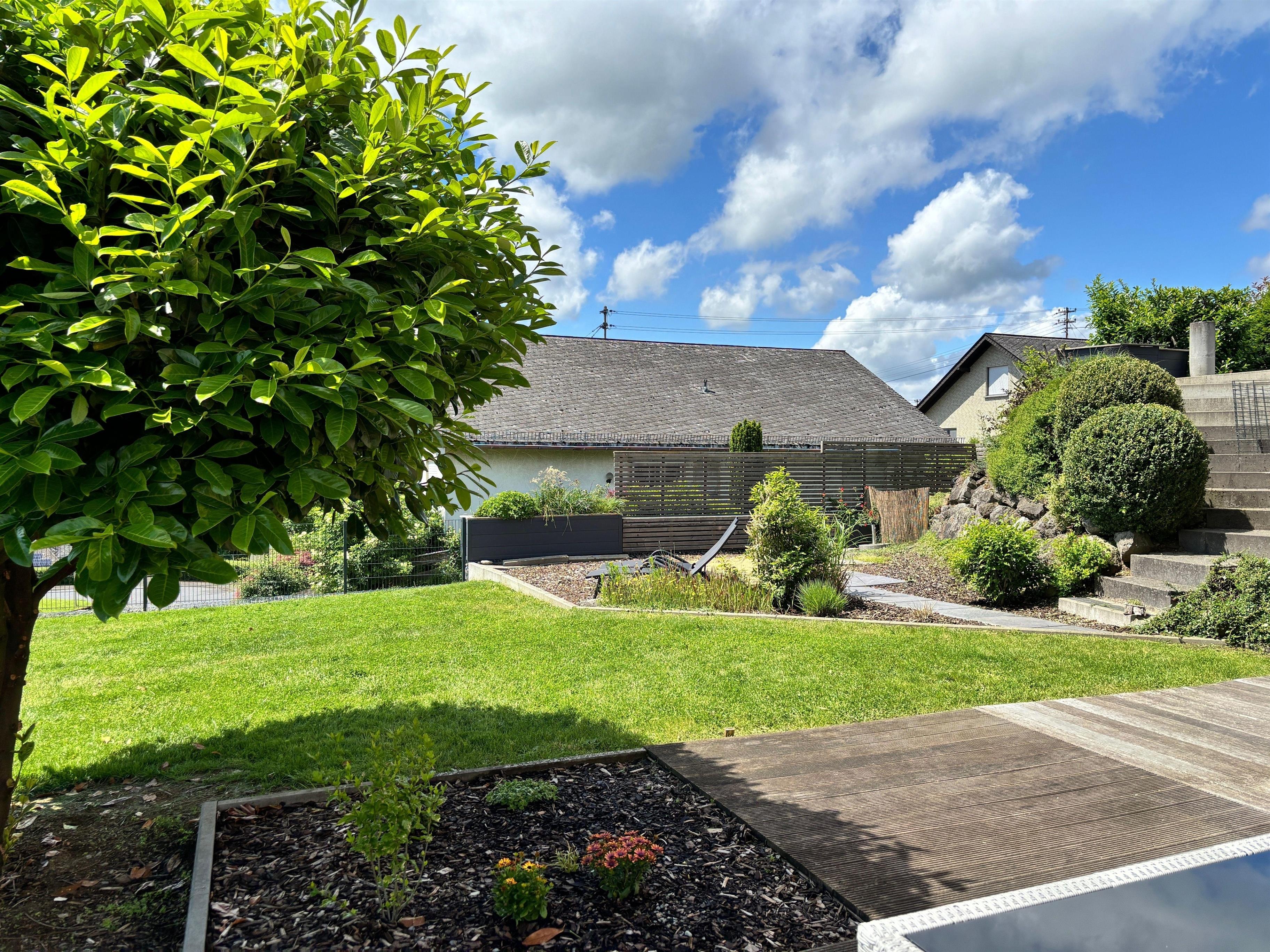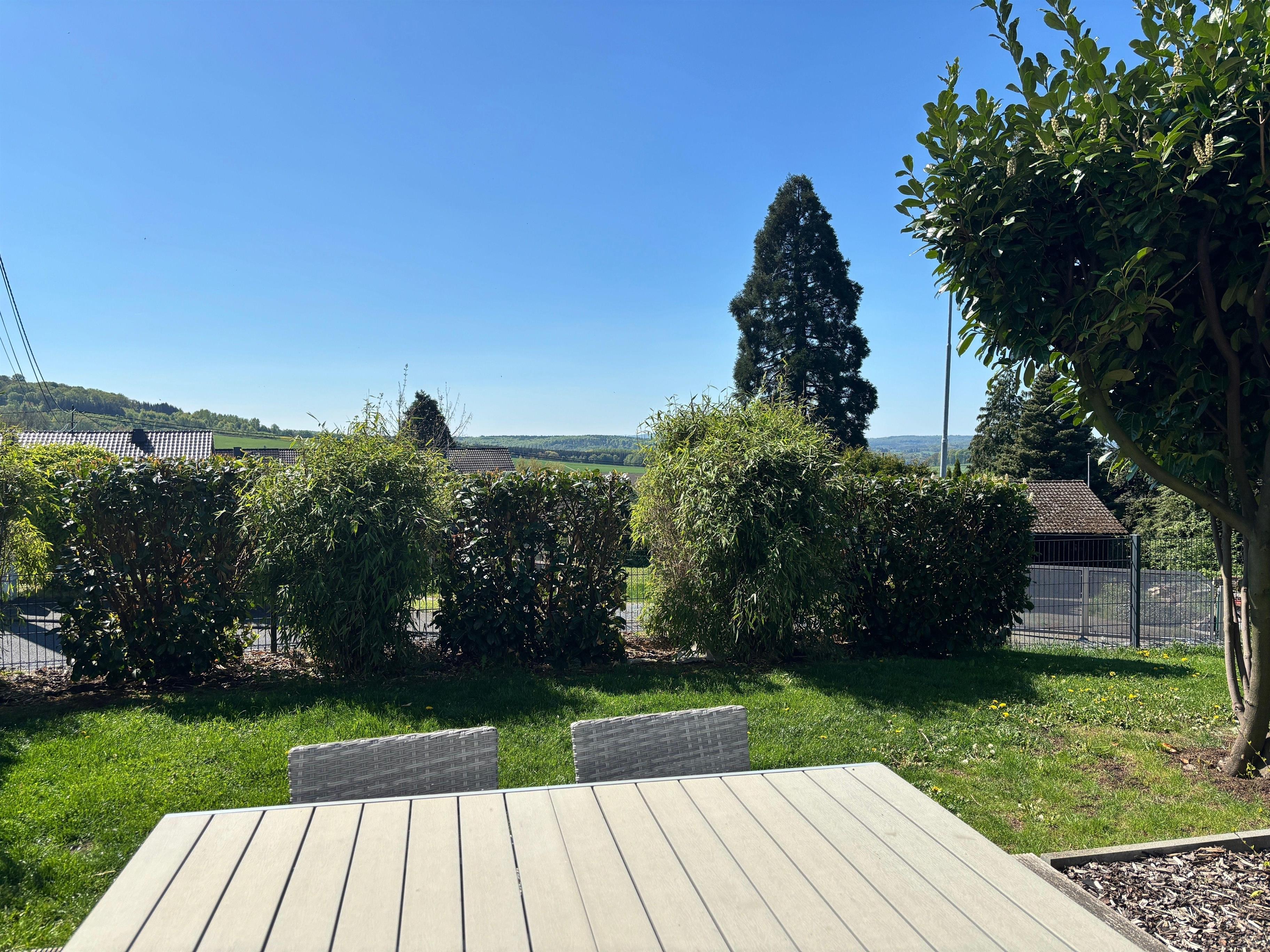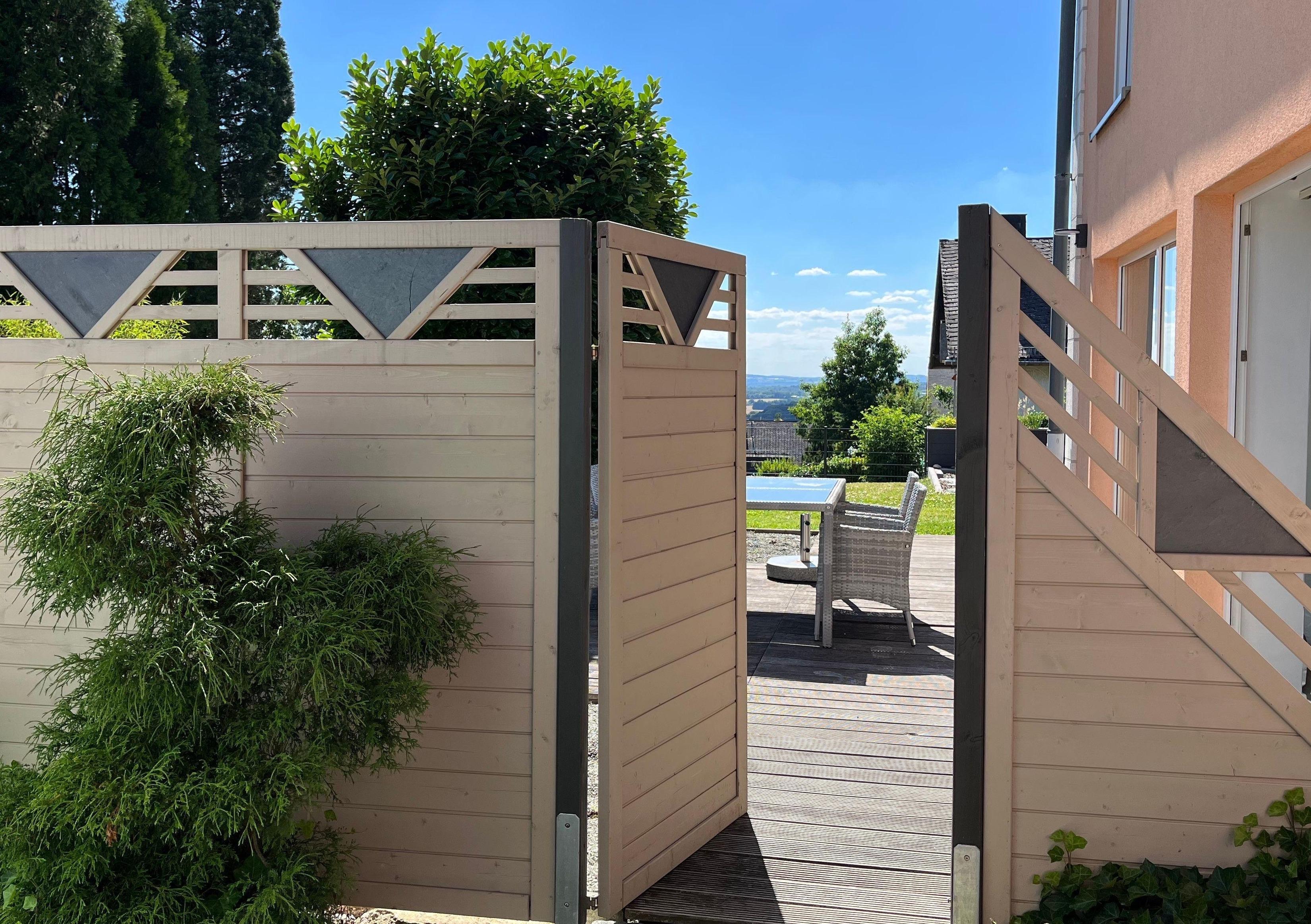 Die umlaufende Terrasse bietet sonnige und schattige Bereiche von Sonnenaufgang bis Sonnenuntergang. Die Terrasse ist mit einer Sitzgruppe, Sonnenschirmen und zwei Liegen ausgestattet. Der Blick nach Süden reicht bis zum 20 Km entfernten Aussichtsturm Köppel. Ein Panoramablick wird nur durch wenige Bäume unterbrochen. Der Garten ist hundefreundlich eingezäunt.