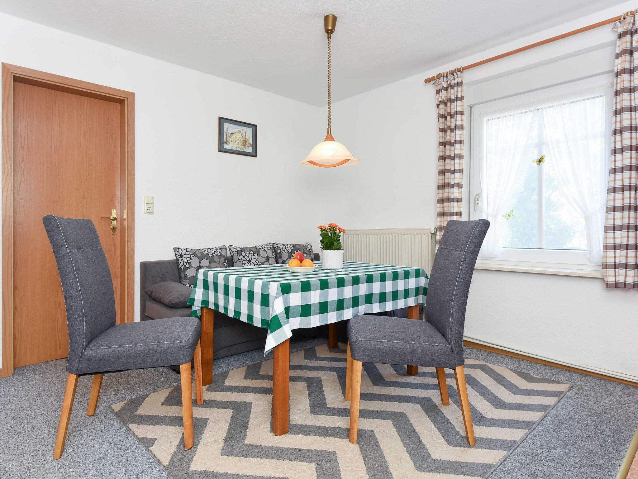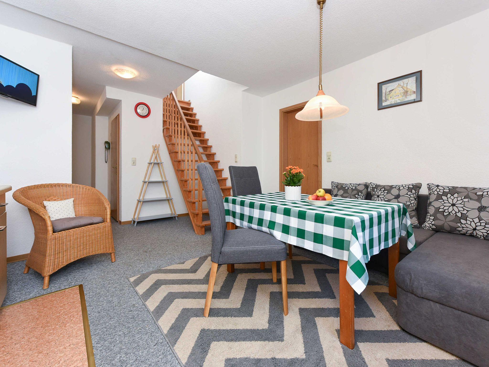 Größe ca. 50 Quadratmeter, Wohnraum mit integrierter Küche, Schlafzimmer, Kinderzimmer, Badezimmer mit Dusche, Waschtisch und WC, Obergeschoss, Garten, optimal für 2 bis 4 Personen.