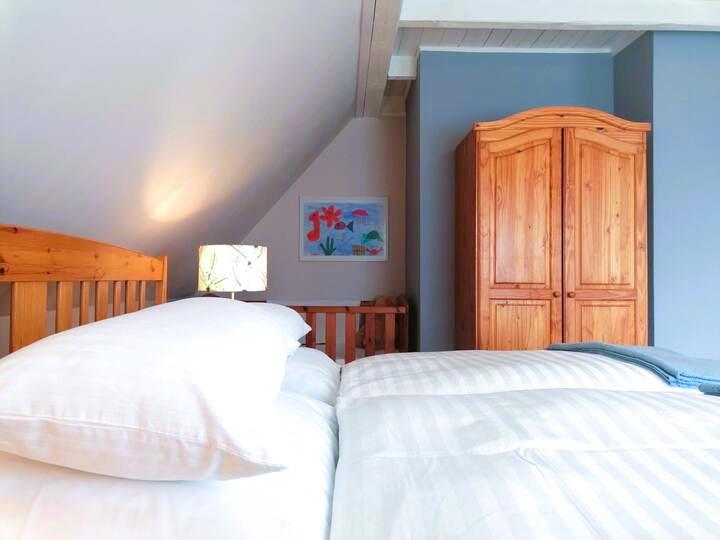 Kinder sind herzlich willkommen, hierfür stehen bis zum Alter 2 Jahre kostenfrei ein Babybett, ein Babystuhl sowie entsprechendes Geschirr zur Verfügung. Darüber hinaus kann ein weiteres Kind bzw. Erwachsene/r in dem Einzelbett im gemeinsamen Schlafzimmer übernachten.