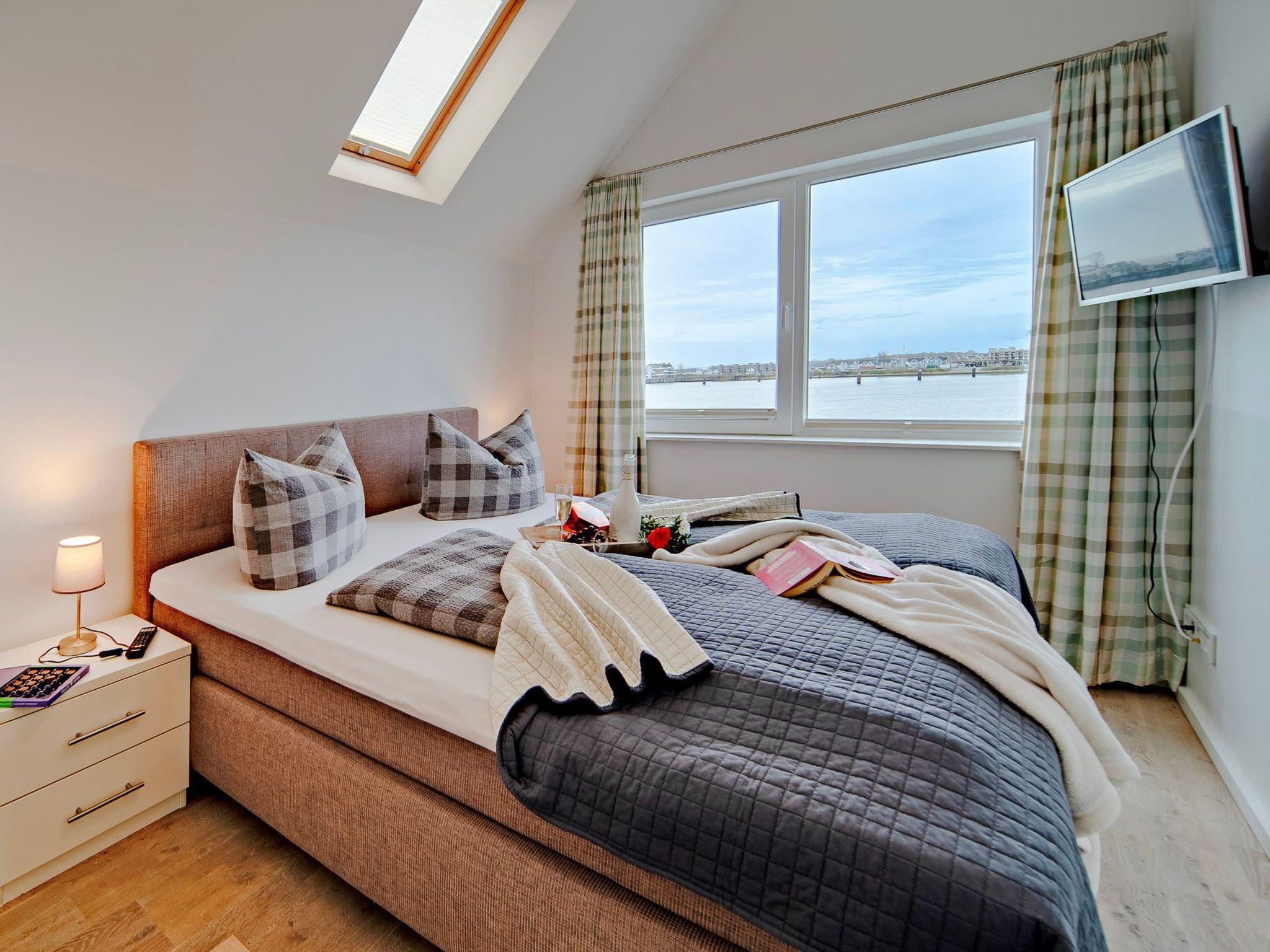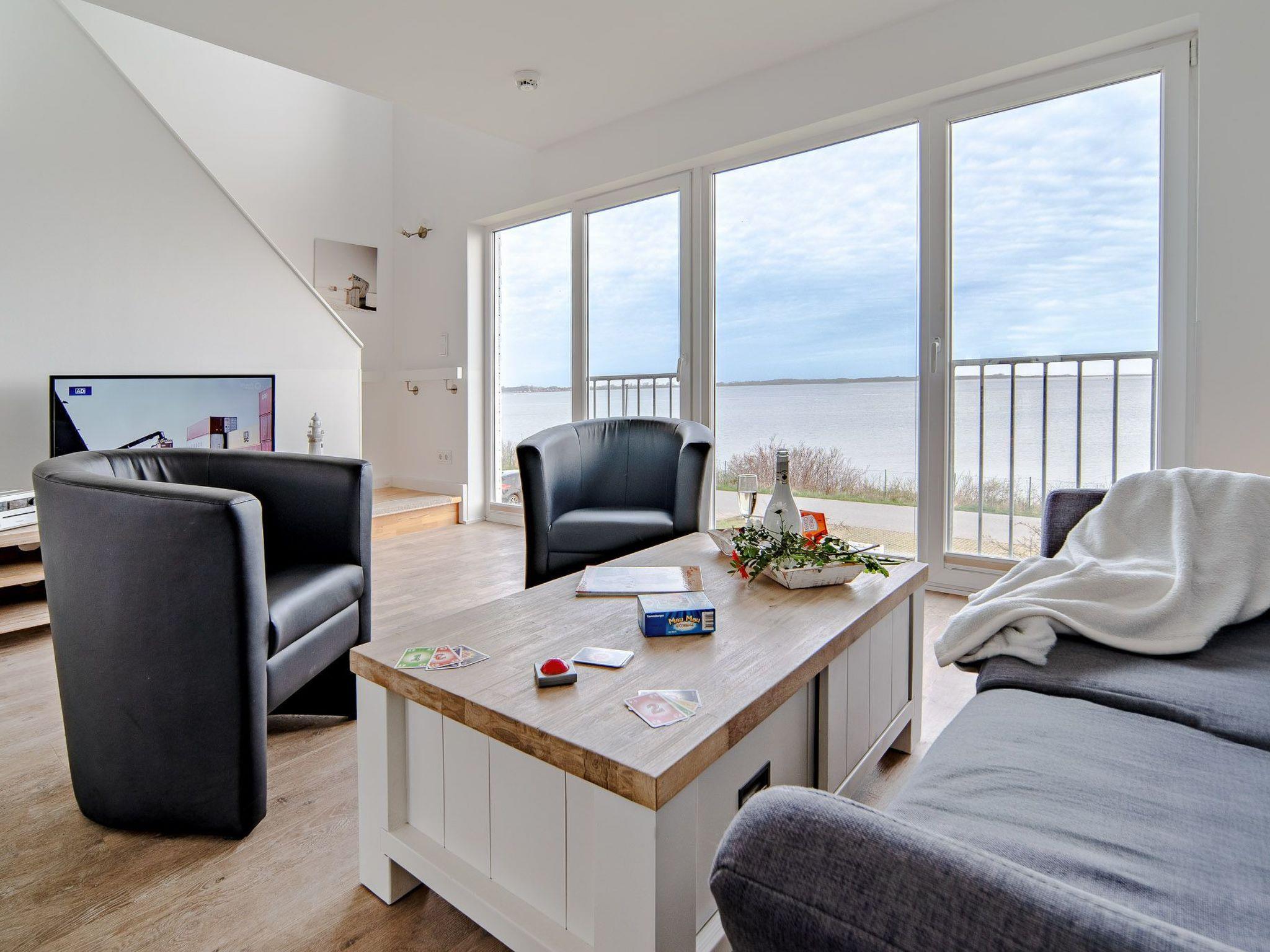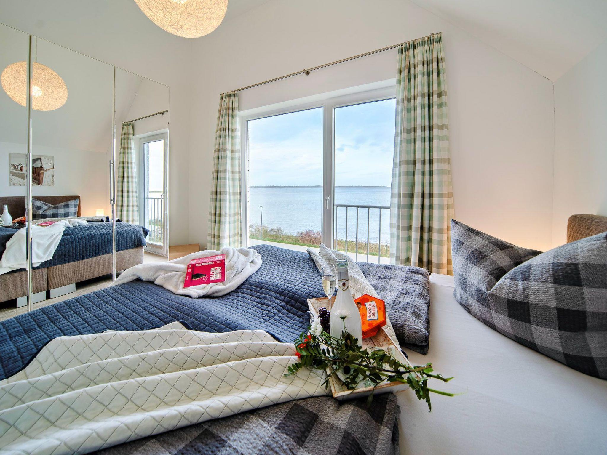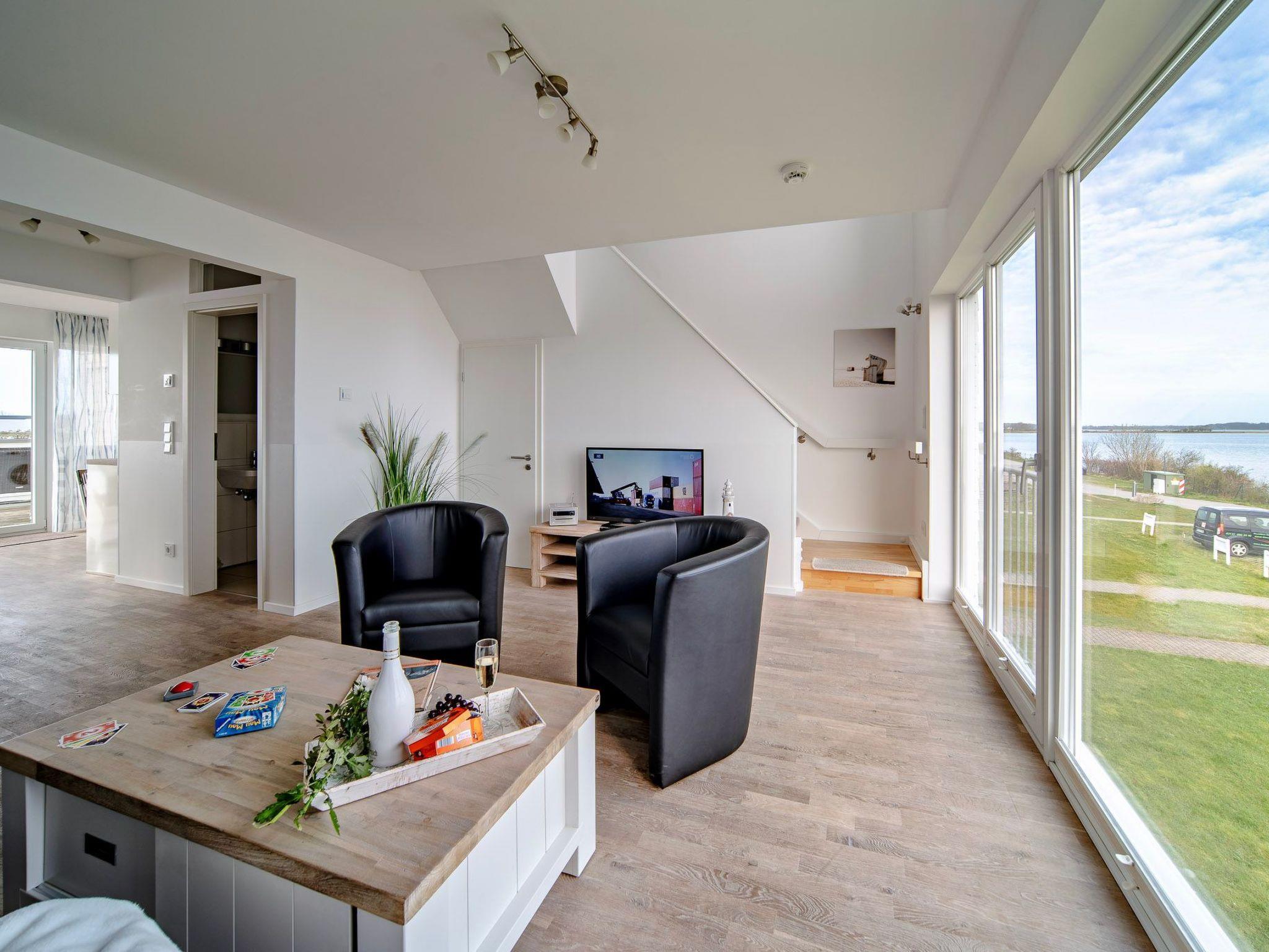 Holiday flat Kaptein`s Lounge by Seeblick Ferien ORO for 2-6 persons on two levels on the upper floor + attic with 180 degree panoramic view of both the harbour of Port Olpenitz in the south and the Schlei with the many passing sailing ships, Maasholm and Schleimünde in the north! Kapteins Lounge by Seeblick Ferien Olpenitz The view from this maisonette flat on two levels on the upper and top floor of the harbour house on the quay in OstseeResort Olpenitz with 93 sqm of living space is truly indescribable! The large windows allow plenty of light into the flat, so that it is always bright and inviting - and you almost feel more like you are on the "bridge" of a (cruise) ship than in a holiday flat! The centrepiece of this loft-style holiday home is the entrance level on the first floor, where the rooms flow almost seamlessly into one another. The spacious and inviting living room has an indescribable view of the Schlei and is the ideal meeting place for the whole family, even in cooler seasons, when the built-in fireplace crackles. The adjoining dining area with open-plan kitchen leads to the large south-facing terrace with a 180-degree panoramic view over the entire harbour. This floor is rounded off with a guest WC and shower. A comfortable staircase takes you from the living area to the top floor to the two bedrooms and the spacious wellness bathroom with shower, large bathtub with whirlpool functions and an infrared sauna. Here, too, there is an incomparable view of the harbour and Schlei. A new holiday resort called "OstseeResort Olpenitz" is being built directly on the Baltic Sea in Eckernförde Bay on the site of a former naval base near Kappeln on the Schlei. Almost nowhere else will you have a better view of the water than in this exceptional holiday property: To the north from the living room and bedroom of Schlei and the passing sailing ships, the Baltic Sea and the lighthouse of Schleimünde, and to the south from the dining area and large panoramic terrace of the entire harbour area of Port Olpenitz! This flat really is an ABSOLUTE HIGHLIGHT.
