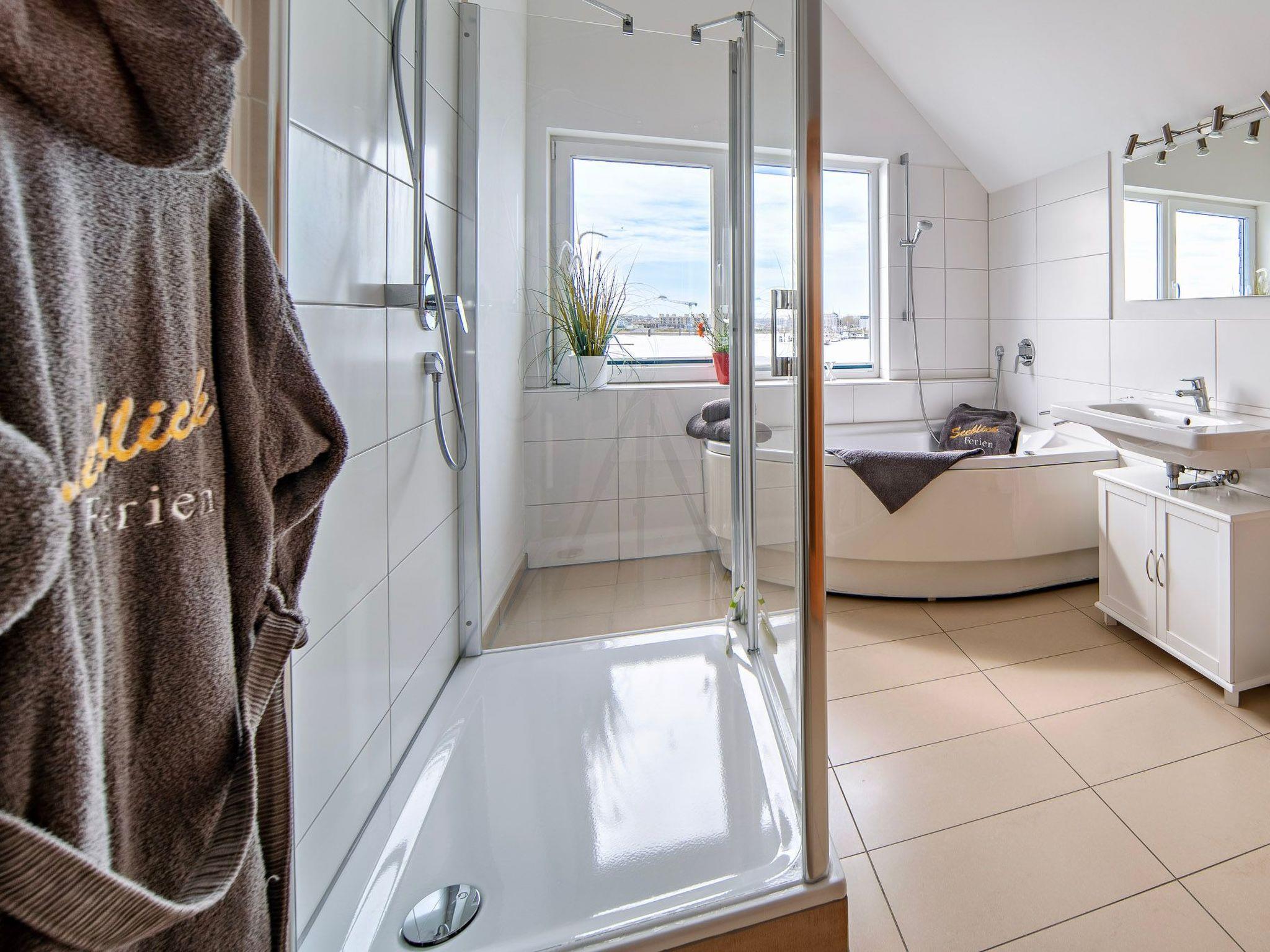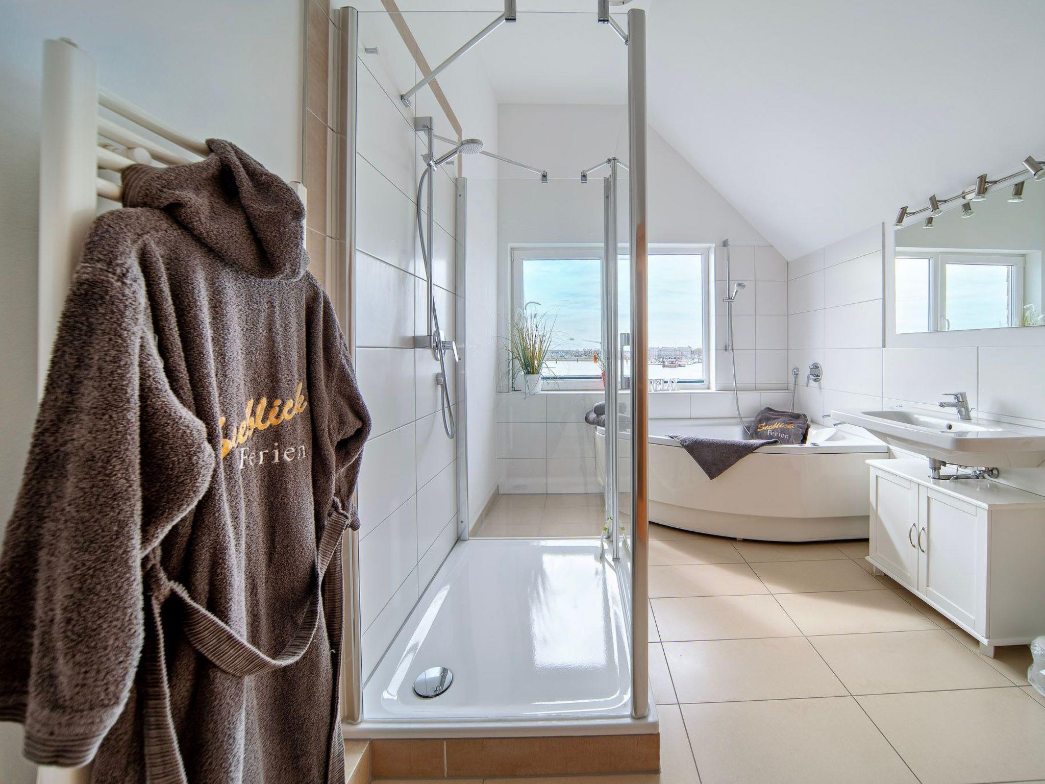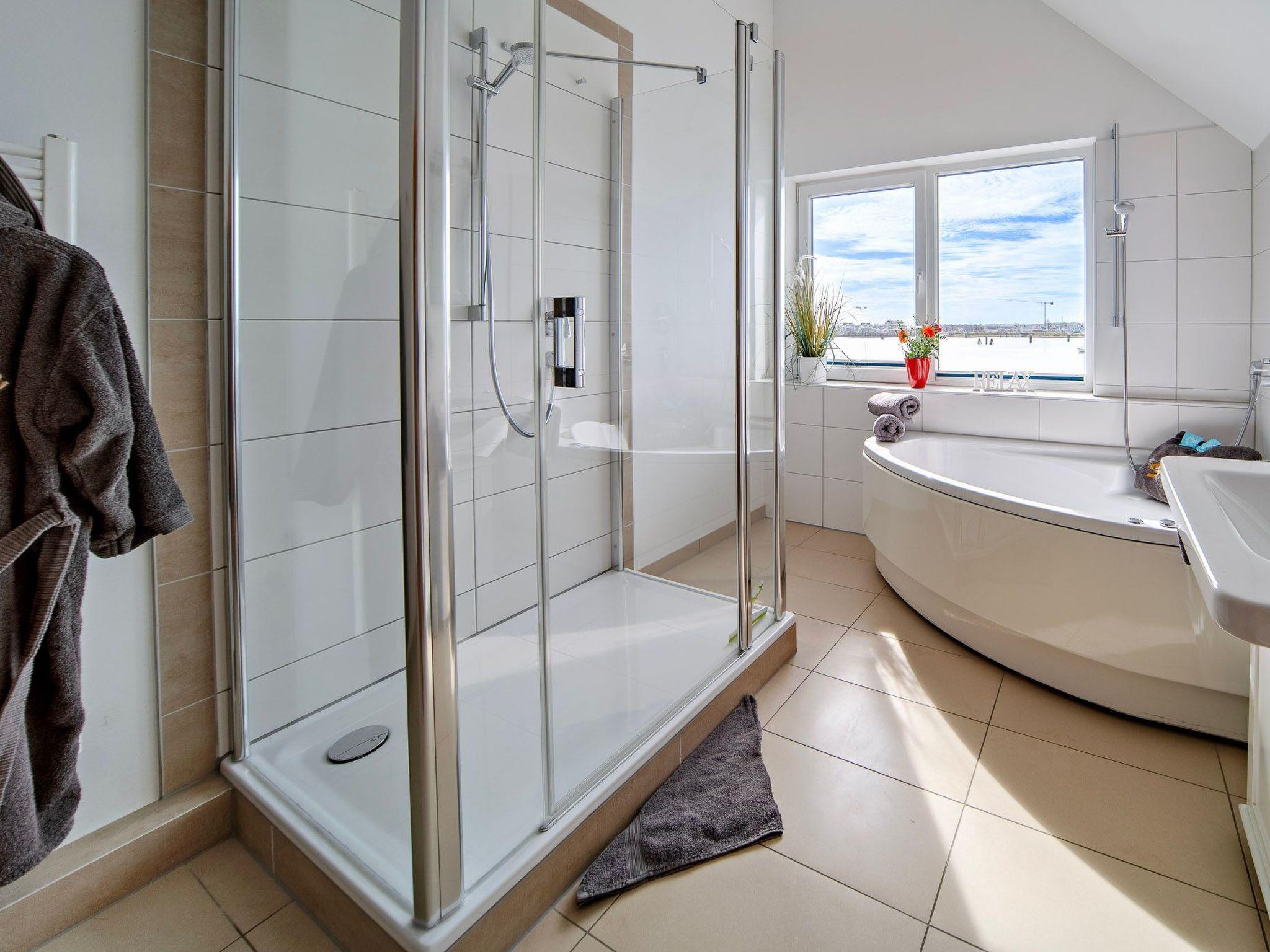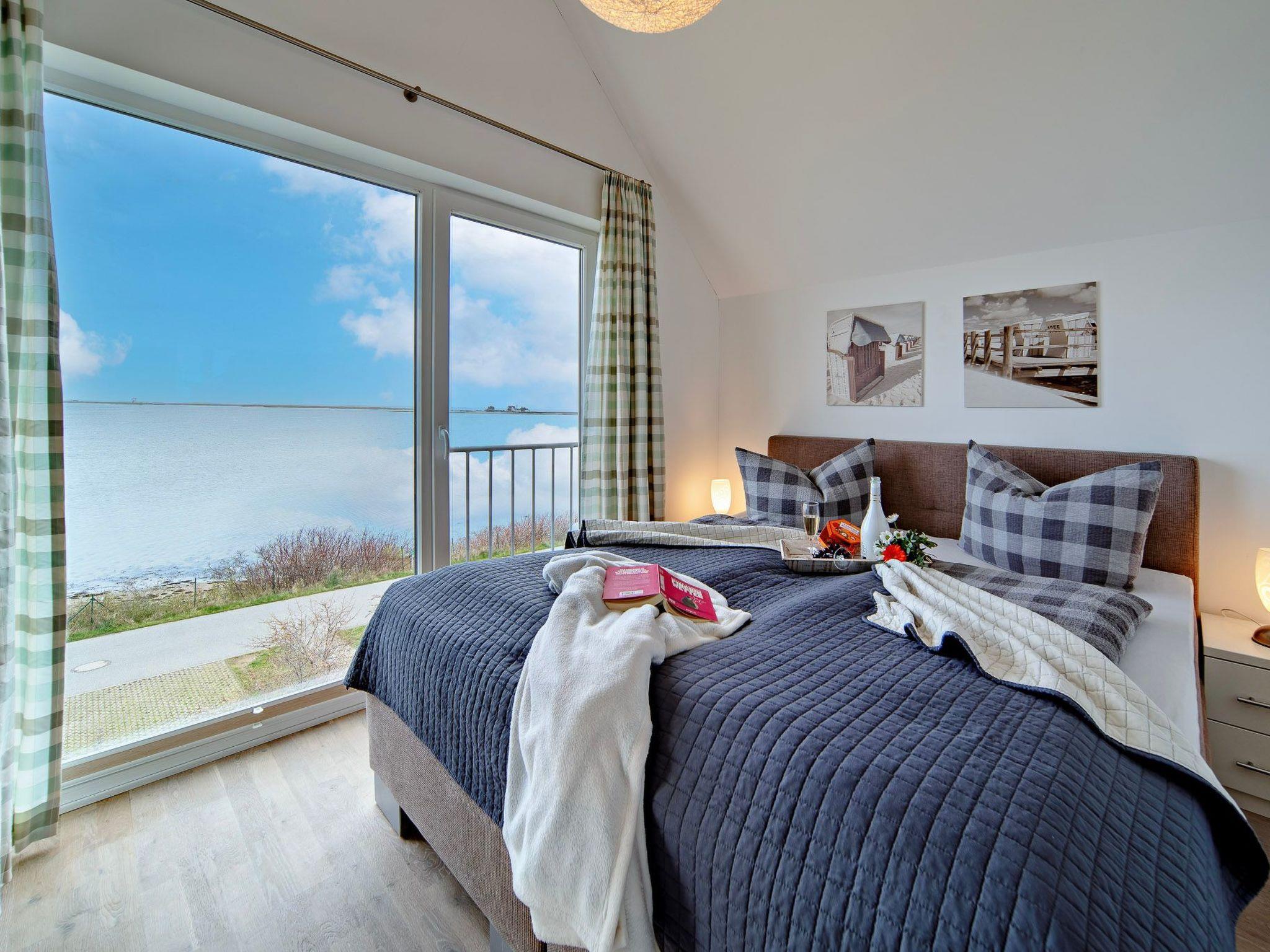 Holiday flat Kaptein`s Lounge by Seeblick Ferien ORO for 2-6 persons on two levels on the upper floor + attic with 180 degree panoramic view of both the harbour of Port Olpenitz in the south and the Schlei with the many passing sailing ships, Maasholm and Schleimünde in the north! Kapteins Lounge by Seeblick Ferien Olpenitz The view from this maisonette flat on two levels on the upper and top floor of the harbour house on the quay in OstseeResort Olpenitz with 93 sqm of living space is truly indescribable! The large windows allow plenty of light into the flat, so that it is always bright and inviting - and you almost feel more like you are on the "bridge" of a (cruise) ship than in a holiday flat! The centrepiece of this loft-style holiday home is the entrance level on the first floor, where the rooms flow almost seamlessly into one another. The spacious and inviting living room has an indescribable view of the Schlei and is the ideal meeting place for the whole family, even in cooler seasons, when the built-in fireplace crackles. The adjoining dining area with open-plan kitchen leads to the large south-facing terrace with a 180-degree panoramic view over the entire harbour. This floor is rounded off with a guest WC and shower. A comfortable staircase takes you from the living area to the top floor to the two bedrooms and the spacious wellness bathroom with shower, large bathtub with whirlpool functions and an infrared sauna. Here, too, there is an incomparable view of the harbour and Schlei. A new holiday resort called "OstseeResort Olpenitz" is being built directly on the Baltic Sea in Eckernförde Bay on the site of a former naval base near Kappeln on the Schlei. Almost nowhere else will you have a better view of the water than in this exceptional holiday property: To the north from the living room and bedroom of Schlei and the passing sailing ships, the Baltic Sea and the lighthouse of Schleimünde, and to the south from the dining area and large panoramic terrace of the entire harbour area of Port Olpenitz! This flat really is an ABSOLUTE HIGHLIGHT.