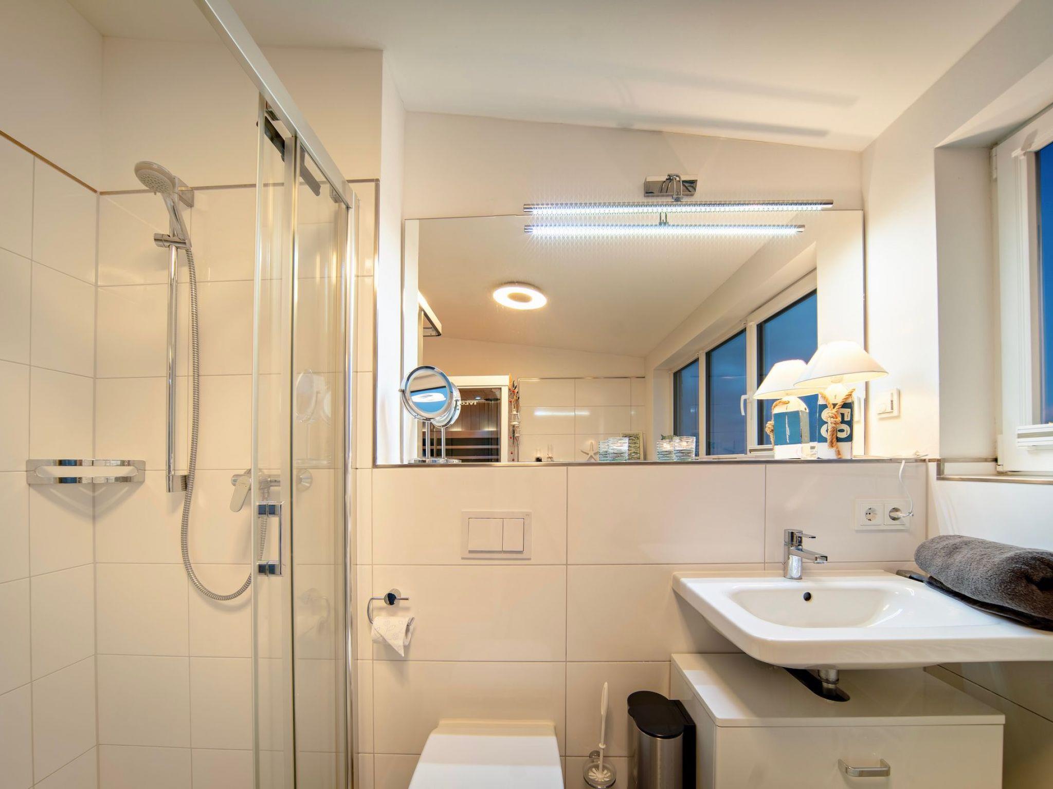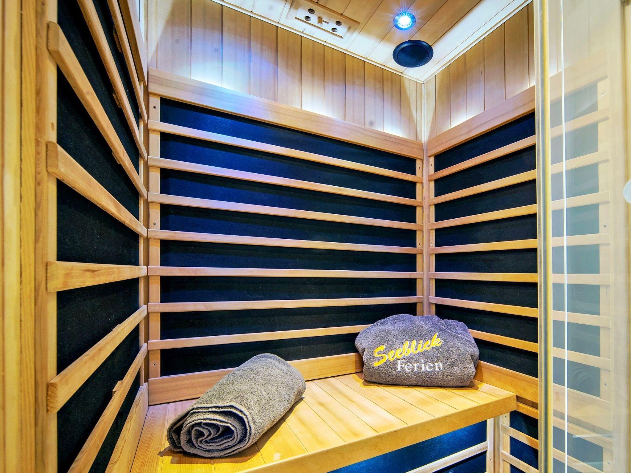 The upper floor also offers a fully equipped bathroom with whirlpool bath, walk-in shower, infrared sauna cabin with LED colour light therapy and hi-fi system with connection for MP3 player, USB, radio and speakers - a true wellness area with a view of the water and with velvety soft water, as the house has a decalcification system.
