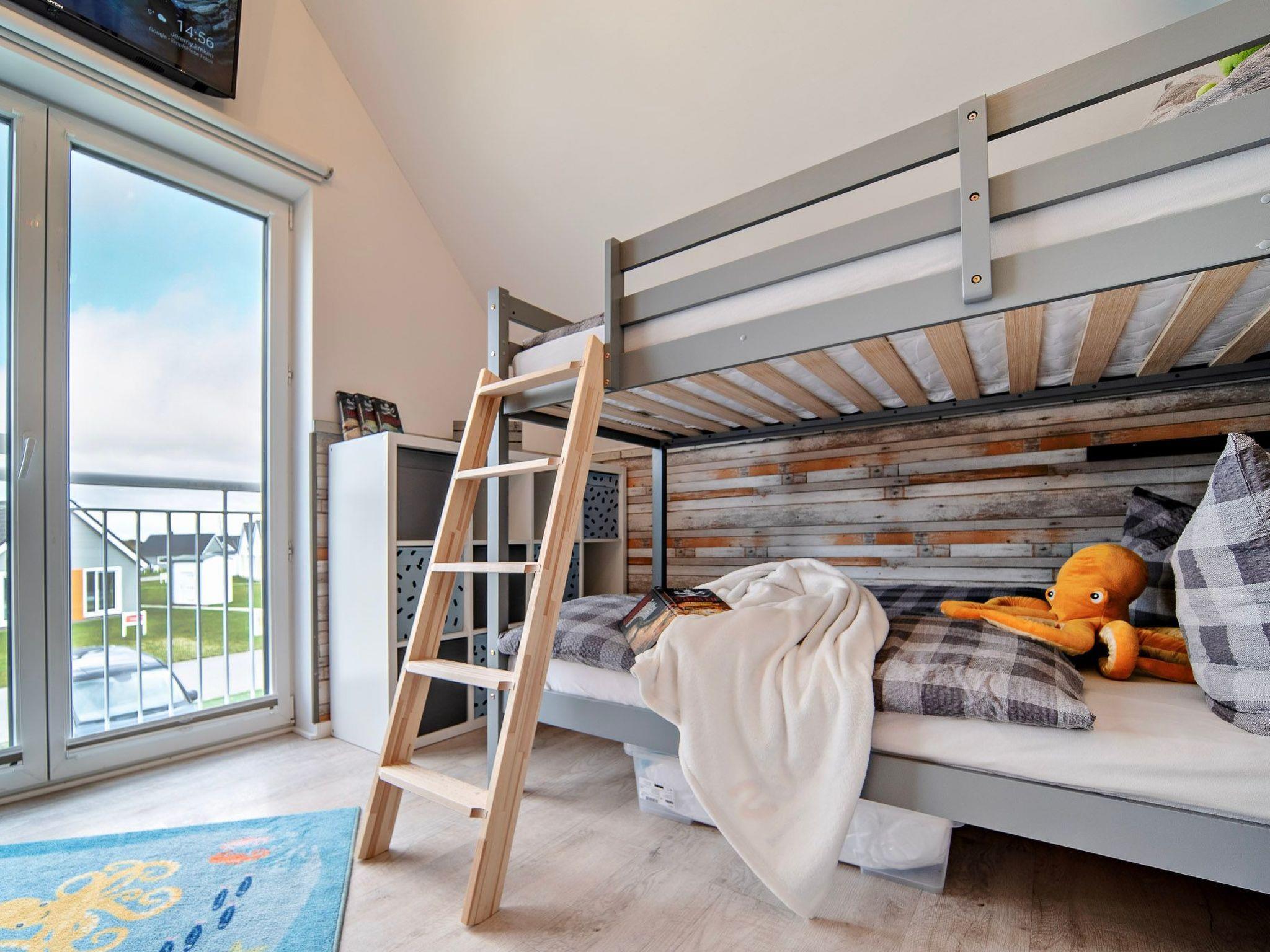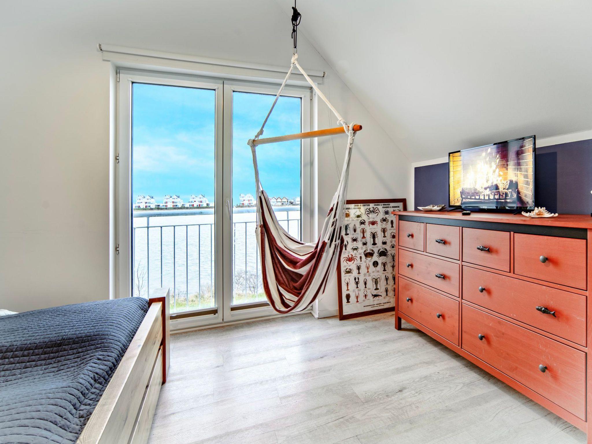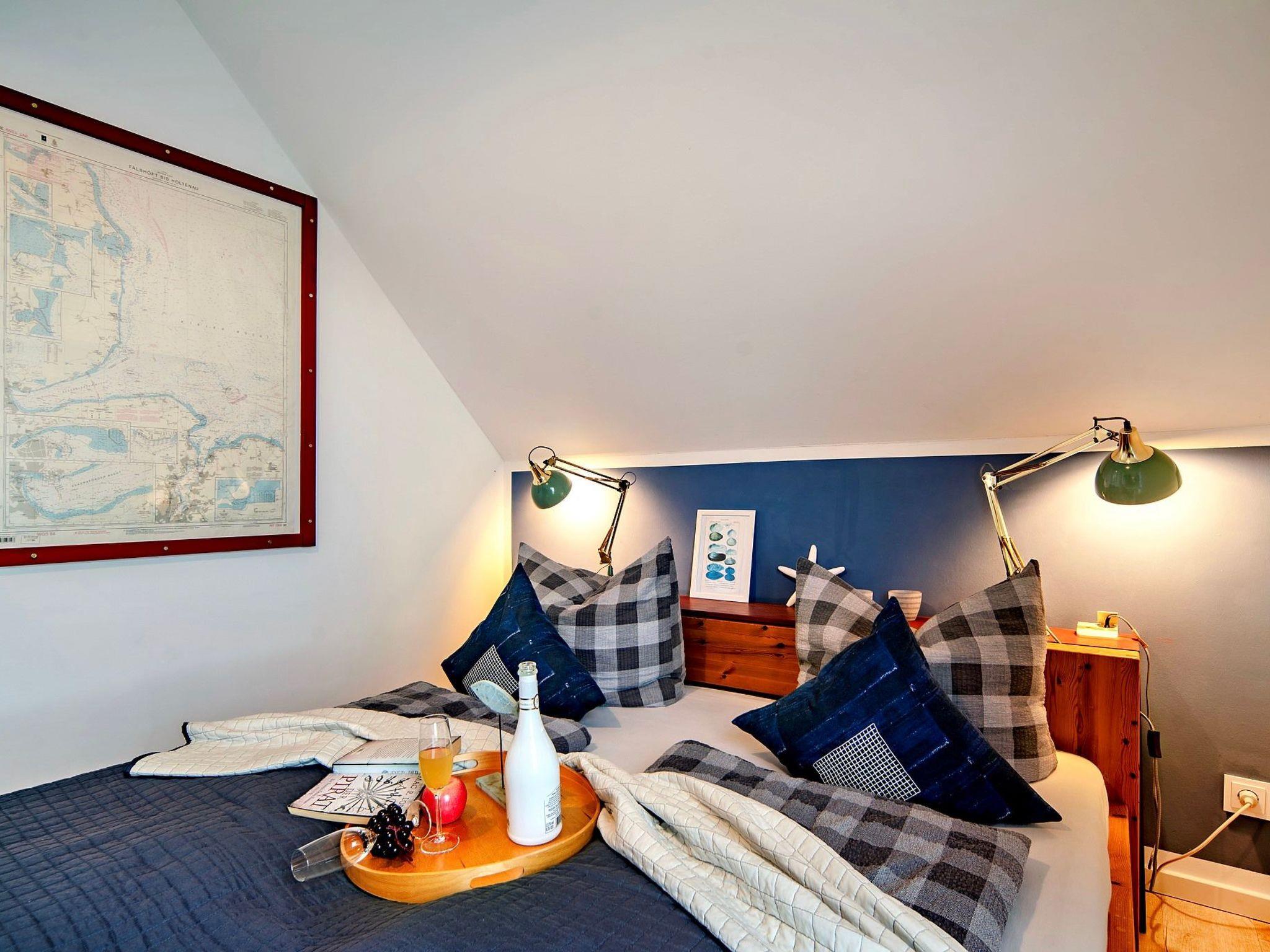 On the upper floor of the holiday home, you will find two bedrooms that invite you to dream. The master bedroom spoils you with a comfortable double bed and a breathtaking, direct view of the water. Start the day with a CD player for your favourite music. The second bedroom has two single beds, which can be converted into a double bed if required, as well as a high-quality wardrobe bed.