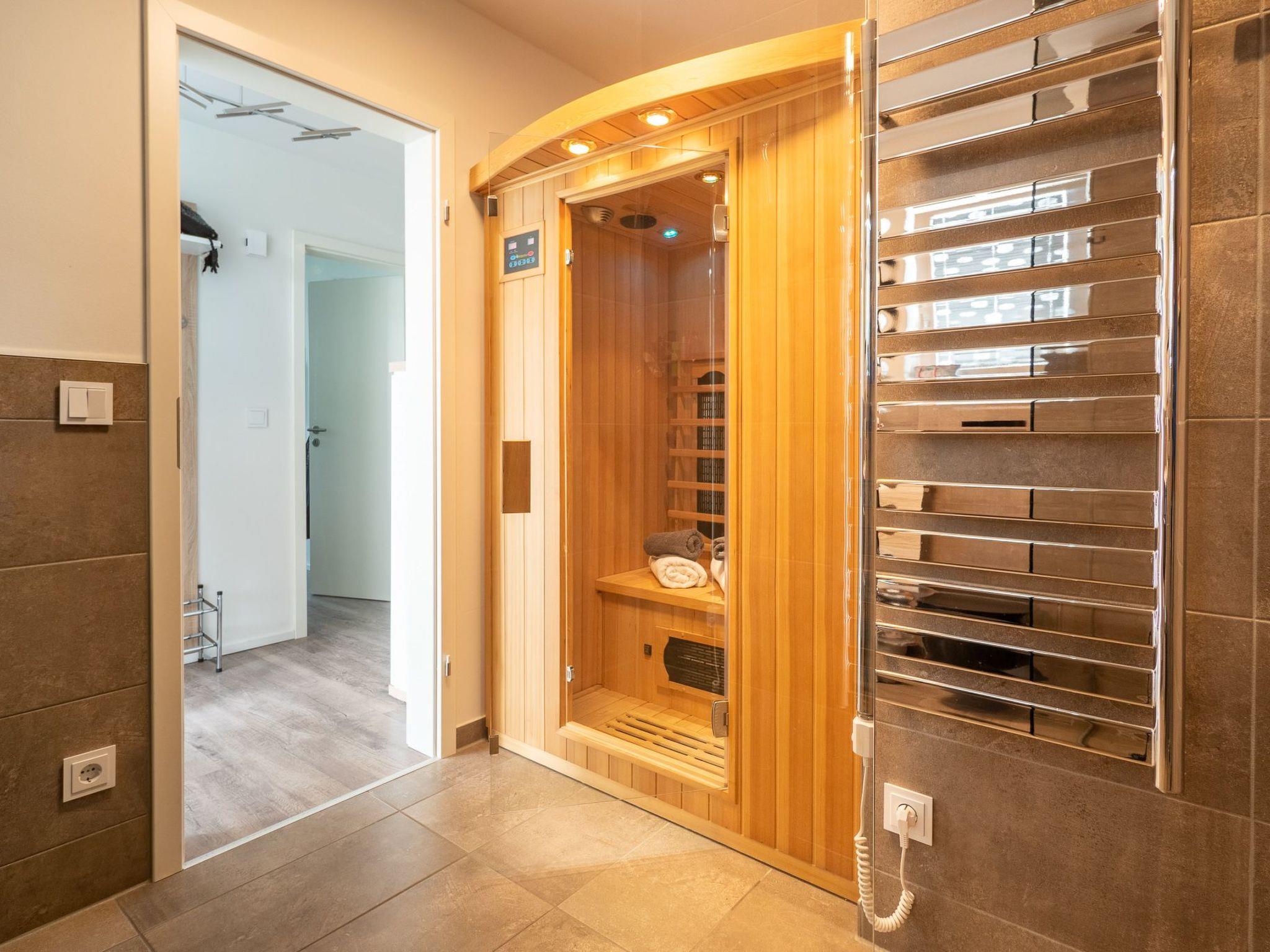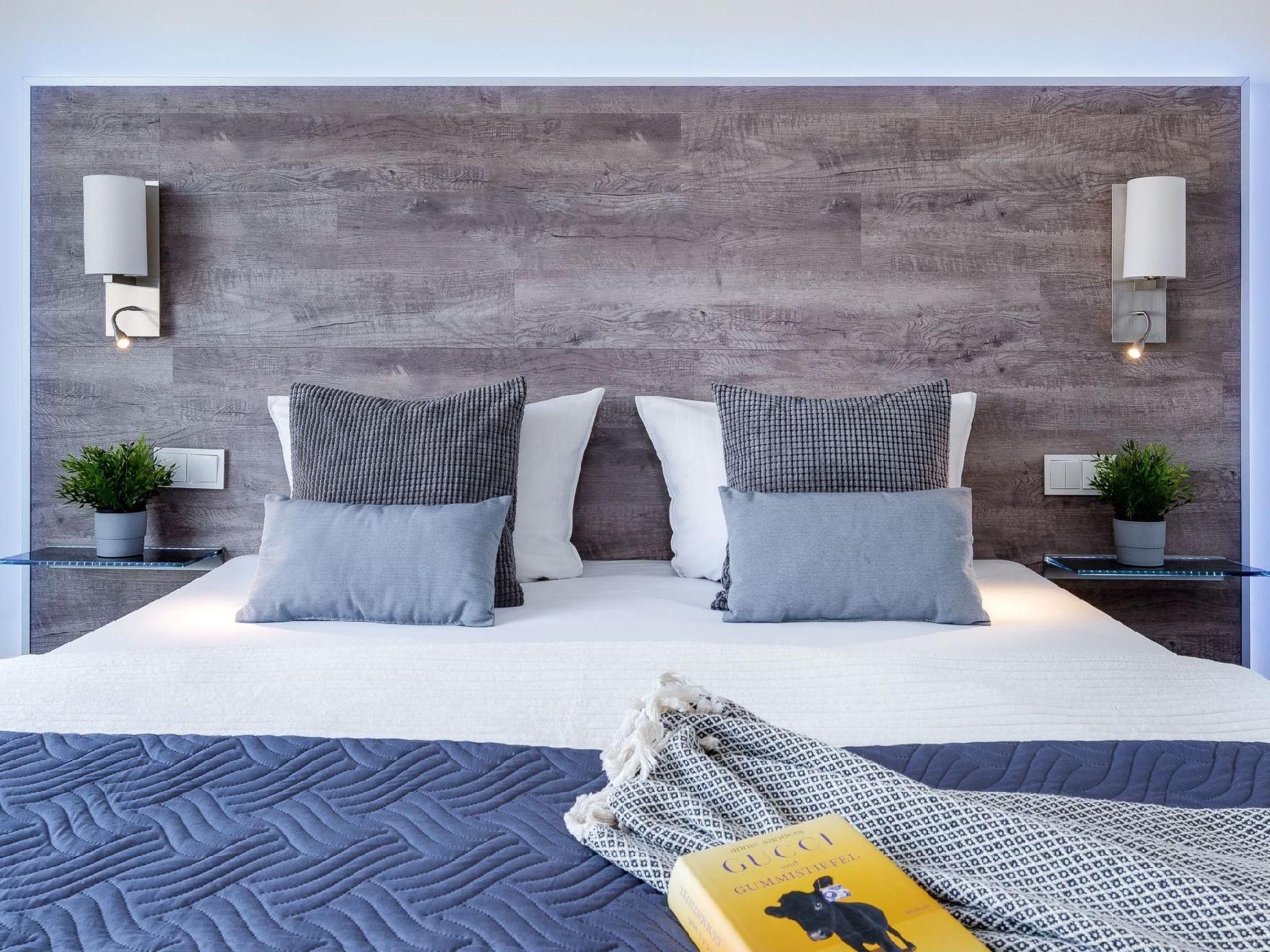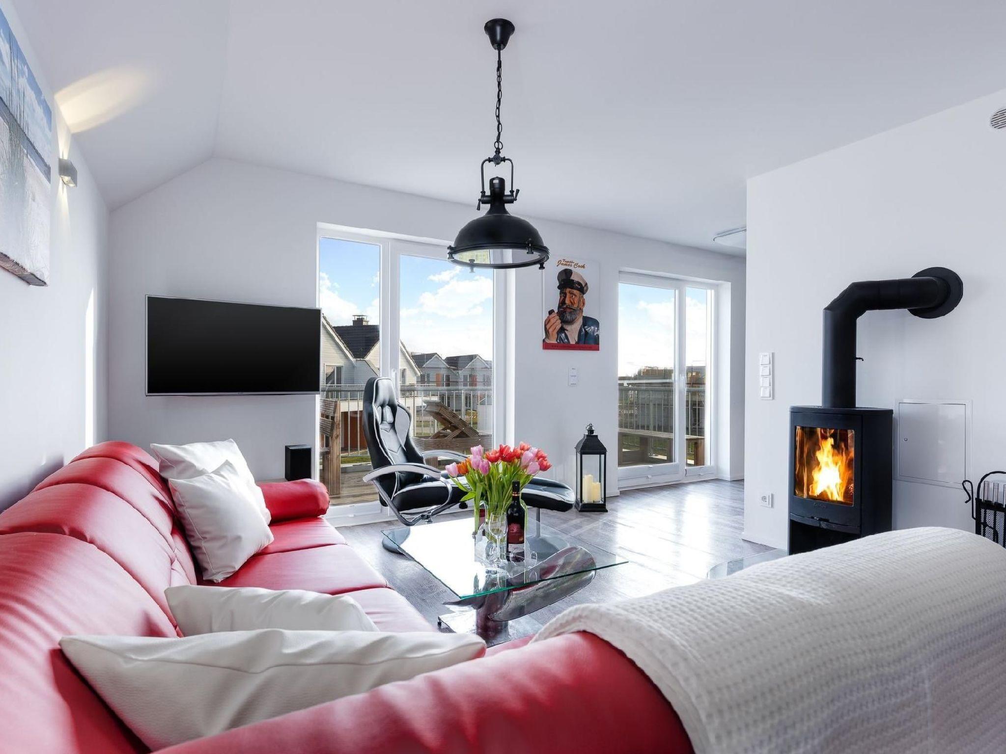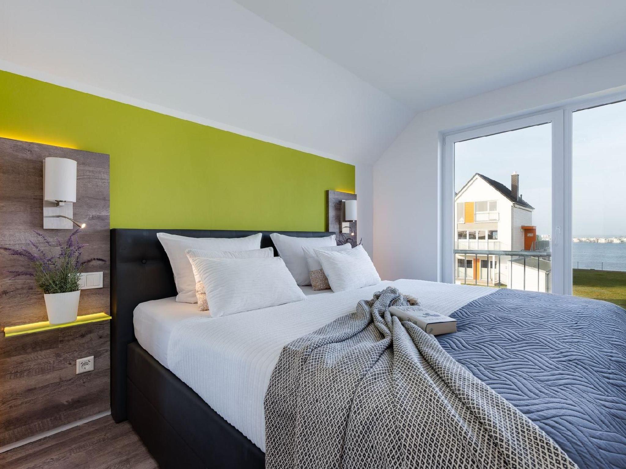 You enter the Captain James Cook Olpenitz holiday flat via an external staircase to the covered first balcony (10m²), which allows you to stay out in the fresh air even when it rains. The entrance area leads past a beautiful bathroom, which makes wellness hearts beat faster, as it has a floor-level XXL shower and a sauna (infrared cabin) with coloured light therapy. On the other side are two well-designed bedrooms with space for four adults and a marvellous view of the water. The master bedroom has a waterbed with a medium mattress (1.80 x 2.20), while a box-spring bed (1.80 x 2.00) awaits you in the second bedroom with an additional flat-screen TV. A fifth person is possible on request, the sleeping accommodation would be on the large sofa which has a bed function. However, the focus is on the perfectly realised, light-flooded living and dining area with a wood-burning stove and floor-to-ceiling windows that connect the living area with nature. The integration of the open-plan kitchen with its excellent equipment and functional design means that nothing stands in the way of cosy get-togethers, even when preparing all kinds of delicacies. The round wood-burning stove between the living room and dining area lends the room a special atmosphere. Equipment: Kitchen: filter coffee machine, Dolce Gusto capsule coffee machine, tea maker (Bodum), induction hob, oven, toaster, microwave, kettle, fridge, dishwasher, washer-dryer, crockery, kitchen utensils, underfloor heating. Bedroom 1: Waterbed, medium comfort at approx. 28 degrees, 1.80 m x 2.20 m, wardrobe, 32-inch flat-screen TV, socket near the bed with USB, underfloor heating. Bedroom 2: box-spring bed 1.80 m x 2.00 m, wardrobe, 32-inch flat-screen TV, USB socket near the bed, underfloor heating. Bathroom: floor-level XXL walk-in shower 1.30m x 0.80m, wall-hung toilet, countertop washbasin, shower stool, hairdryer, make-up mirror, infrared sauna cabin with colour light therapy, towel heating, underfloor heating. Living area: dining table with chairs, chests of drawers, sitting area with sofa and sofa bed, 42-inch flat-screen TV, WiFi, telephone, Bluetooth music centre, books, various games, children's toys, wood-burning fireplace, underfloor heating, balcony: garden furniture. General: iron, ironing board, clothes horse, hall wardrobe, vinyl flooring, hoover, children's travel cot with pillow and blanket, free private car park with electric charging point in front of the house. Lockable bicycle shed.
