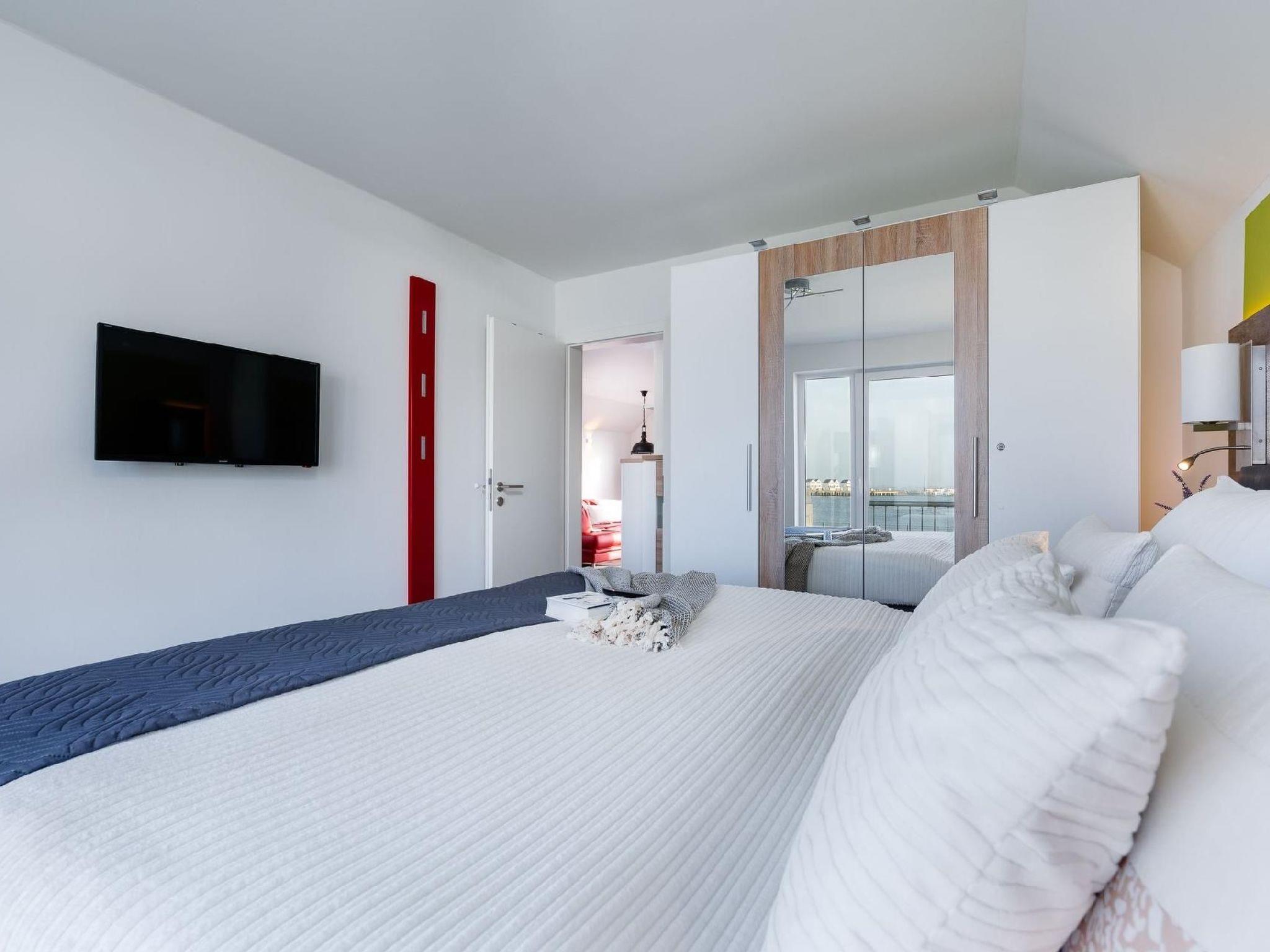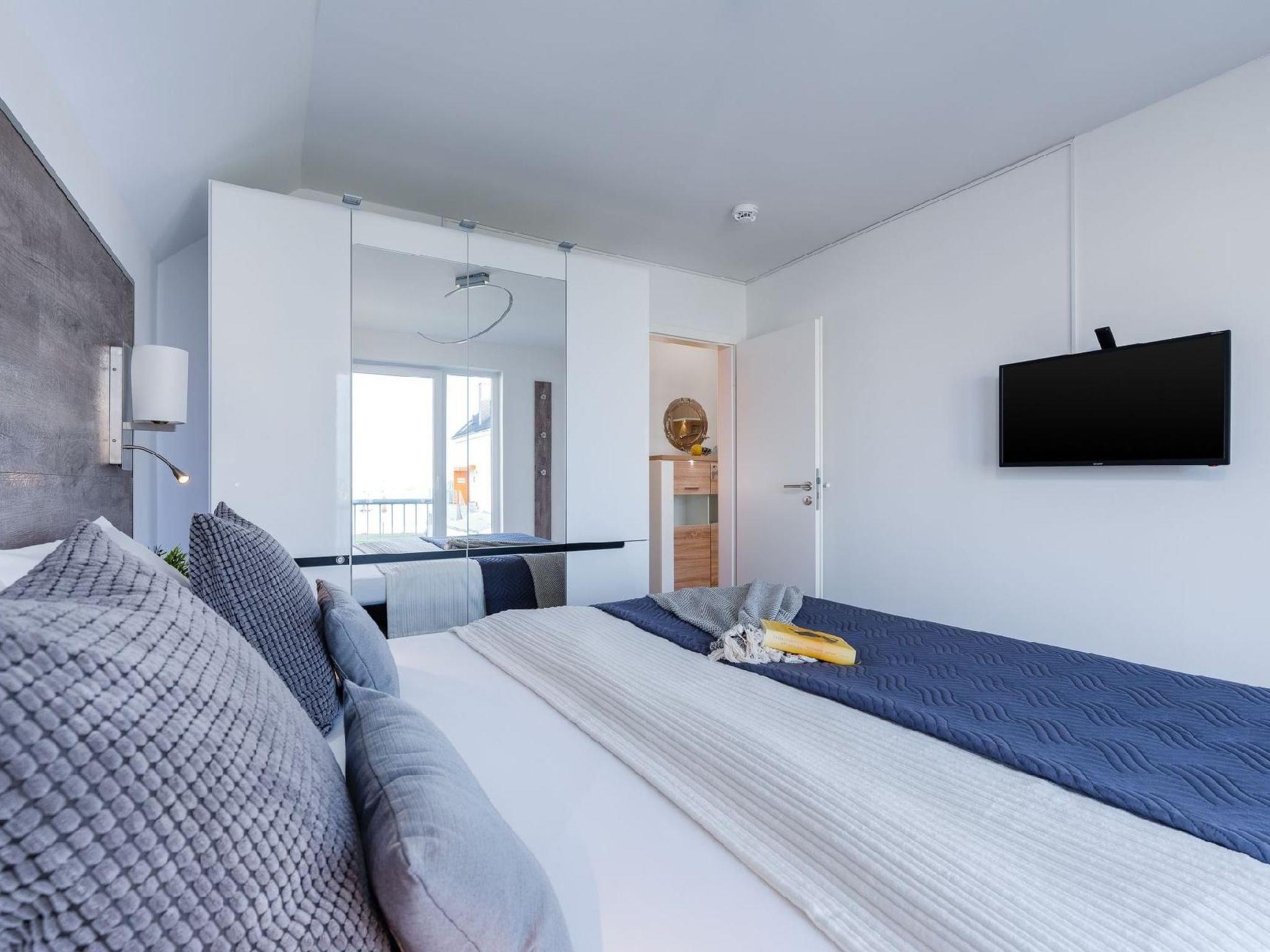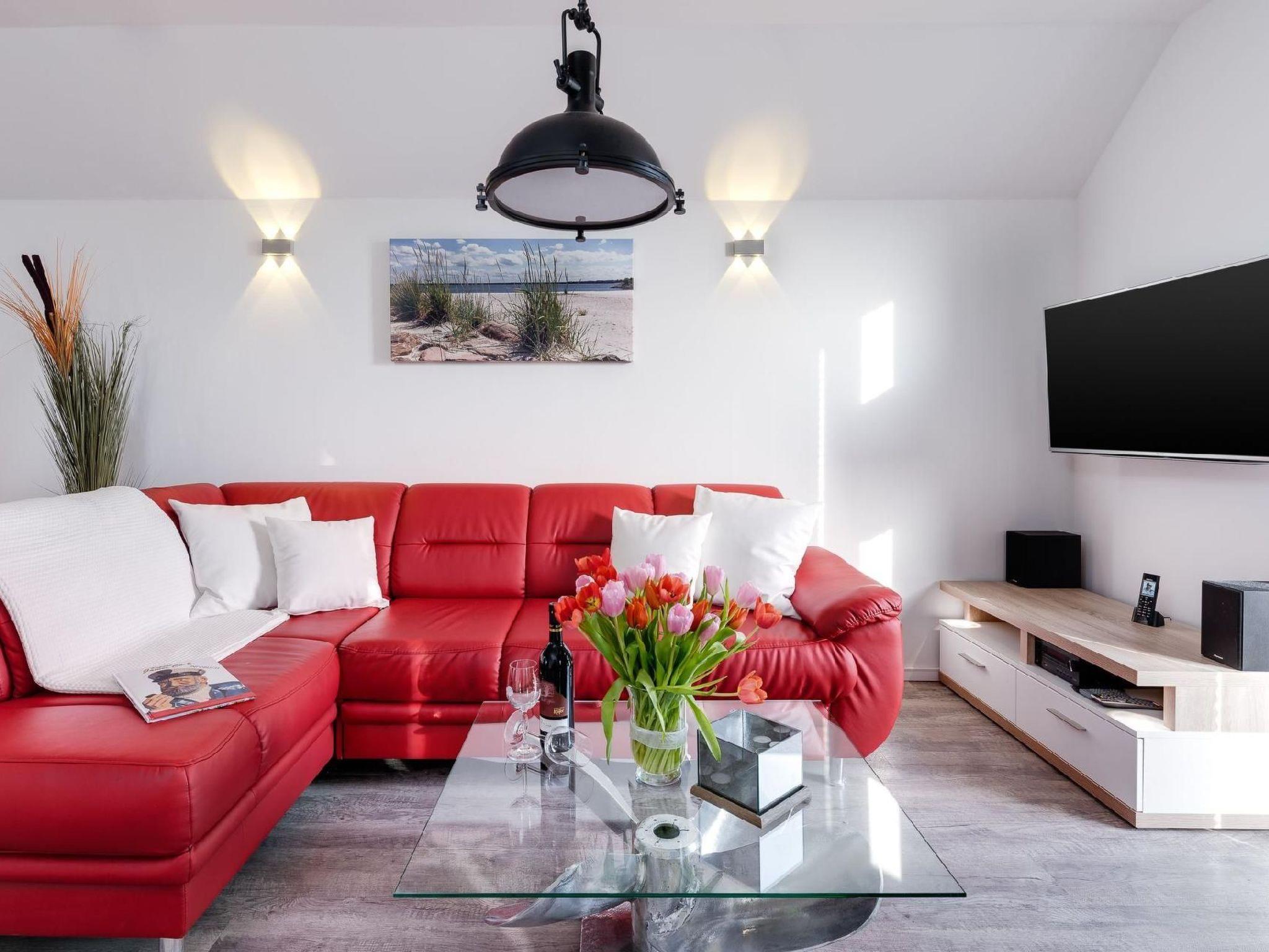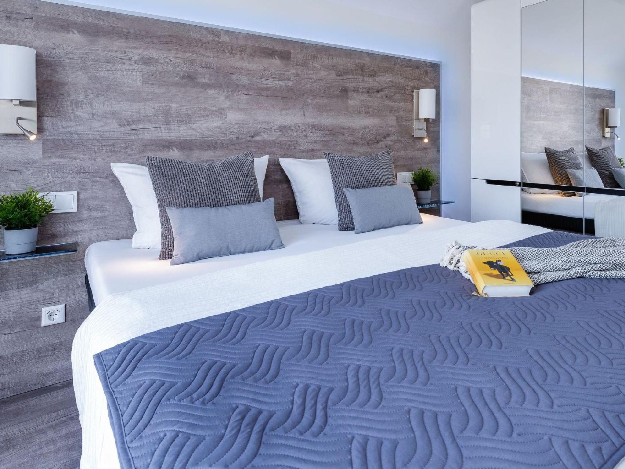 You enter the Captain James Cook Olpenitz holiday flat via an external staircase to the covered first balcony (10m²), which allows you to stay out in the fresh air even when it rains. The entrance area leads past a beautiful bathroom, which makes wellness hearts beat faster, as it has a floor-level XXL shower and a sauna (infrared cabin) with coloured light therapy. On the other side are two well-designed bedrooms with space for four adults and a marvellous view of the water. The master bedroom has a waterbed with a medium mattress (1.80 x 2.20), while a box-spring bed (1.80 x 2.00) awaits you in the second bedroom with an additional flat-screen TV. A fifth person is possible on request, the sleeping accommodation would be on the large sofa which has a bed function. However, the focus is on the perfectly realised, light-flooded living and dining area with a wood-burning stove and floor-to-ceiling windows that connect the living area with nature. The integration of the open-plan kitchen with its excellent equipment and functional design means that nothing stands in the way of cosy get-togethers, even when preparing all kinds of delicacies. The round wood-burning stove between the living room and dining area lends the room a special atmosphere. Equipment: Kitchen: filter coffee machine, Dolce Gusto capsule coffee machine, tea maker (Bodum), induction hob, oven, toaster, microwave, kettle, fridge, dishwasher, washer-dryer, crockery, kitchen utensils, underfloor heating. Bedroom 1: Waterbed, medium comfort at approx. 28 degrees, 1.80 m x 2.20 m, wardrobe, 32-inch flat-screen TV, socket near the bed with USB, underfloor heating. Bedroom 2: box-spring bed 1.80 m x 2.00 m, wardrobe, 32-inch flat-screen TV, USB socket near the bed, underfloor heating. Bathroom: floor-level XXL walk-in shower 1.30m x 0.80m, wall-hung toilet, countertop washbasin, shower stool, hairdryer, make-up mirror, infrared sauna cabin with colour light therapy, towel heating, underfloor heating. Living area: dining table with chairs, chests of drawers, sitting area with sofa and sofa bed, 42-inch flat-screen TV, WiFi, telephone, Bluetooth music centre, books, various games, children's toys, wood-burning fireplace, underfloor heating, balcony: garden furniture. General: iron, ironing board, clothes horse, hall wardrobe, vinyl flooring, hoover, children's travel cot with pillow and blanket, free private car park with electric charging point in front of the house. Lockable bicycle shed.