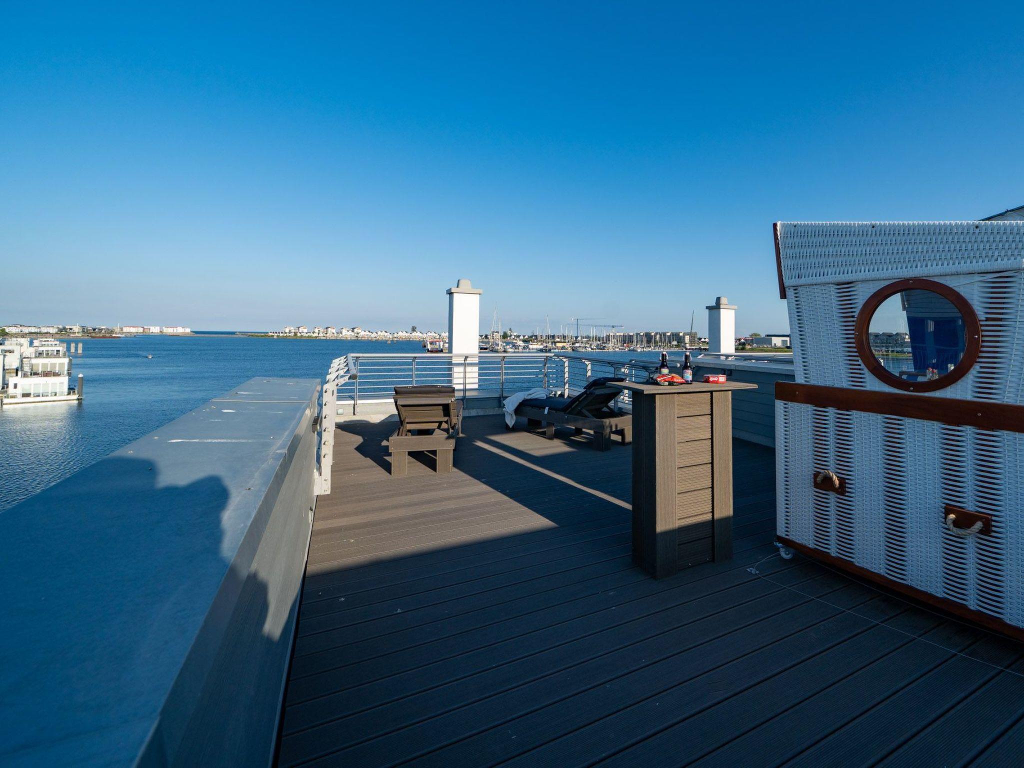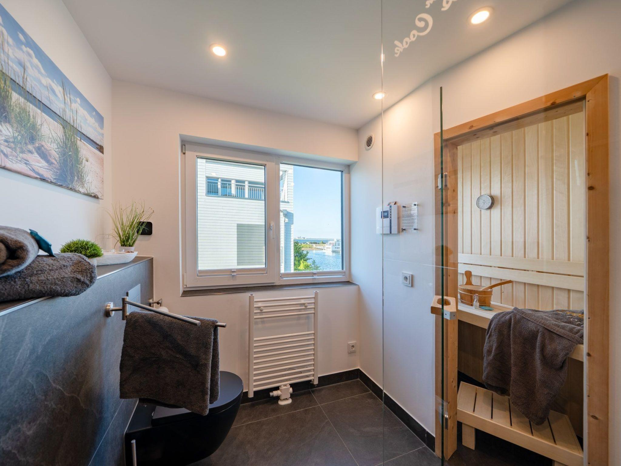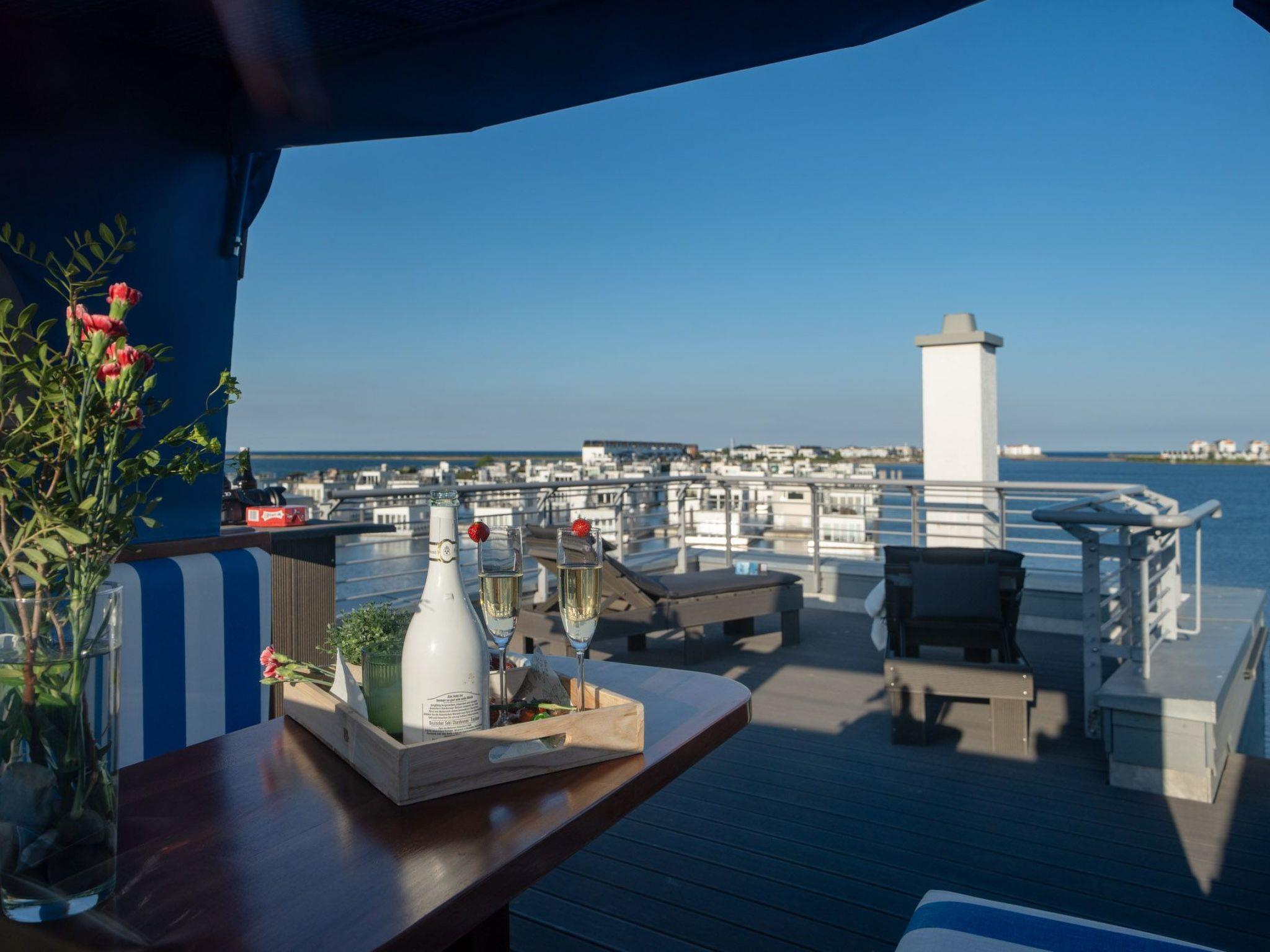 Spend cosy evenings in front of the crackling fireplace in the bright living room on the genuine leather sofa with sleeping function. Switch on the ambient lighting and let yourself be enchanted by the view of the harbour panorama.