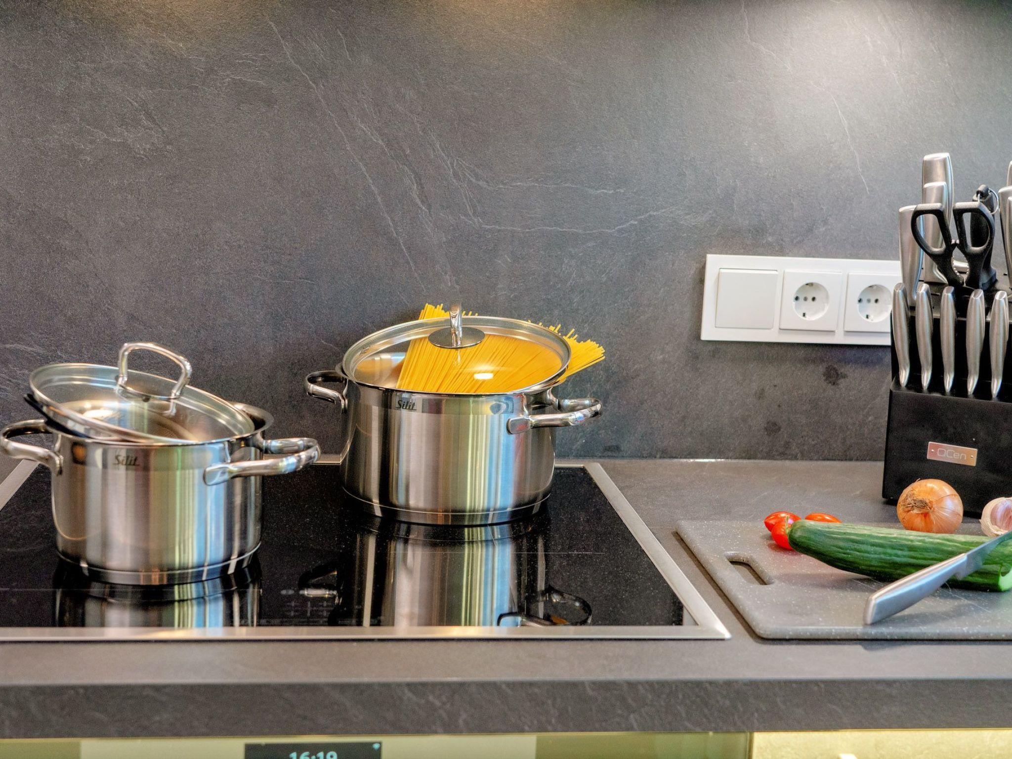 The fully equipped designer kitchen will delight amateur chefs with its many amenities. A dishwasher, induction hob, oven, microwave, fridge with freezer compartment and a Thermomix complete the ensemble and make the hearts of cooking enthusiasts beat faster. A special highlight is a fully automatic coffee machine without a milk system - ideal for coffee lovers who appreciate pure flavour. Experience pure relaxation in your holiday home.