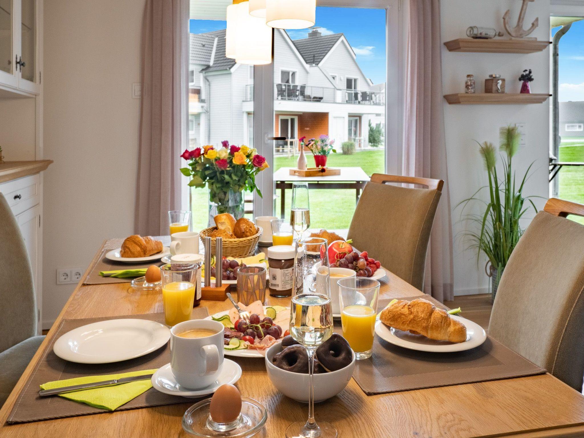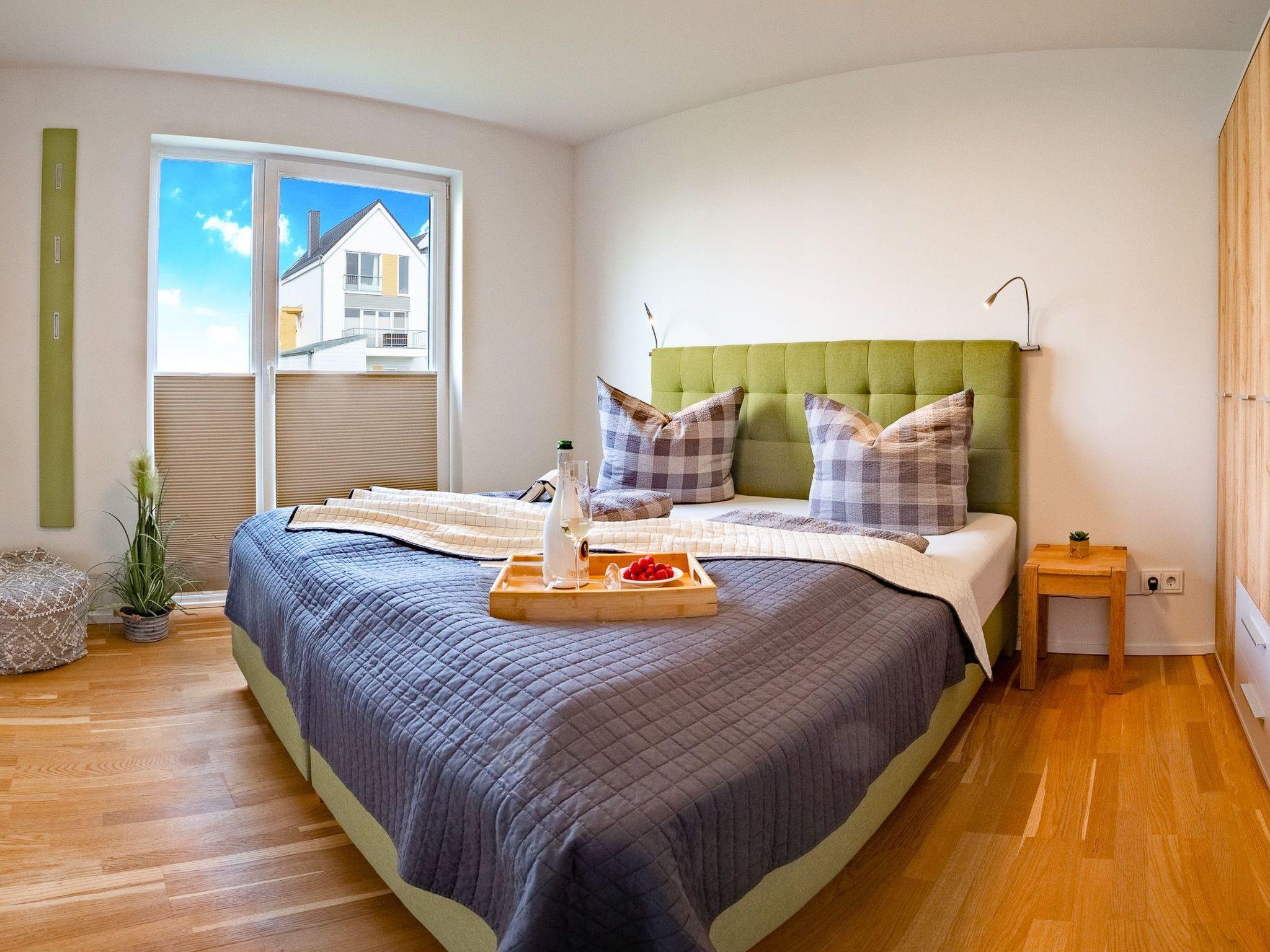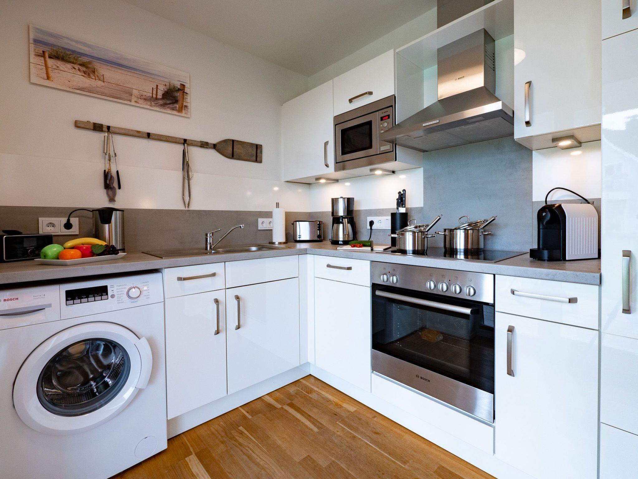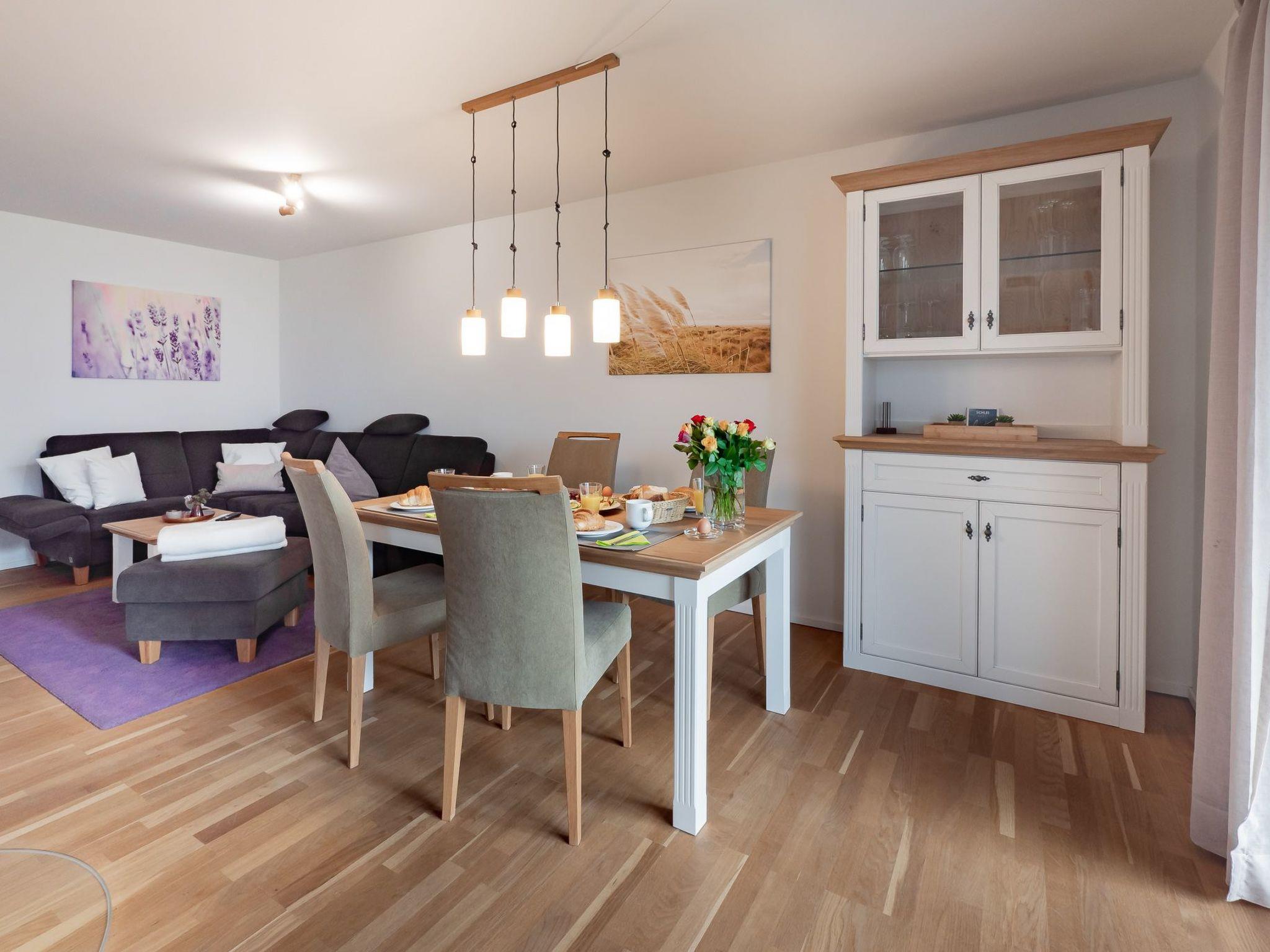 The open-plan kitchen with high-quality equipment leaves nothing to be desired, lovingly furnished down to the smallest detail, there is even children's crockery, and holiday meals can be enjoyed at the dining table. From here, the view falls through the floor-to-ceiling windows onto the adjoining terrace, which faces the Baltic Sea and promises fantastic hours of sunshine with its south-facing orientation, breakfast in the morning sun, a barbecue evening or a romantic candlelight dinner - unforgettable holiday moments are guaranteed here. That's holiday feeling with a sea view in the MEERwert holiday flat.