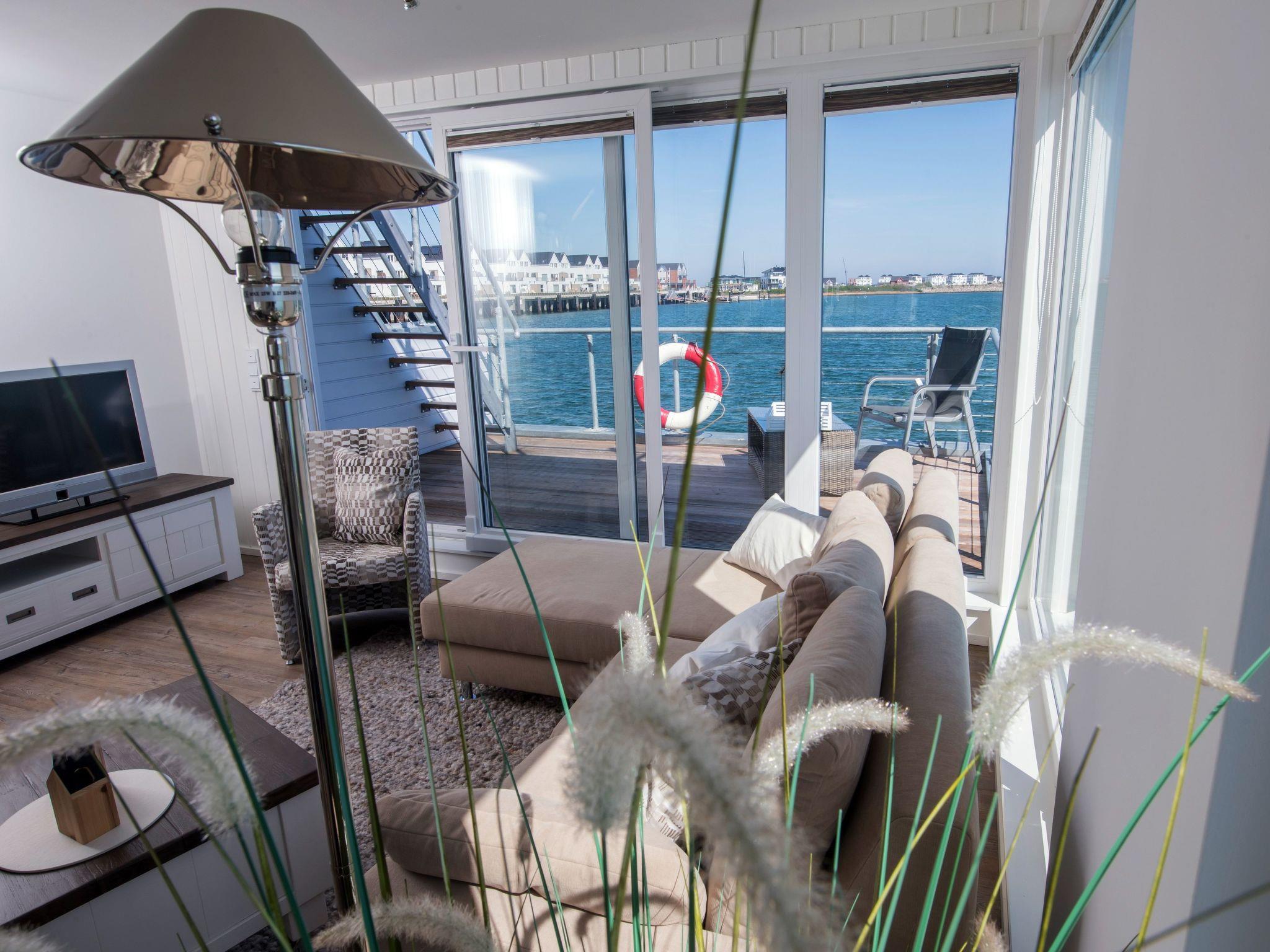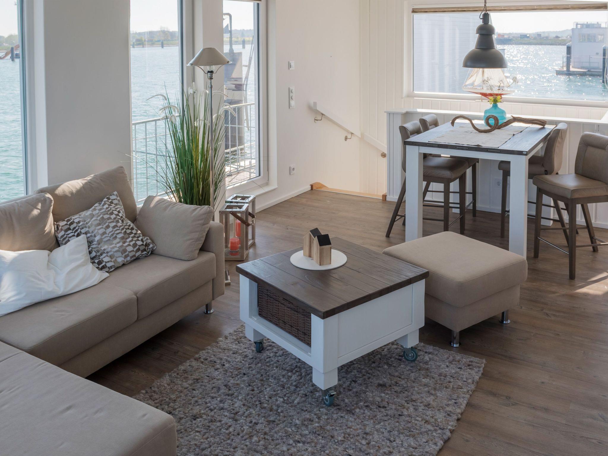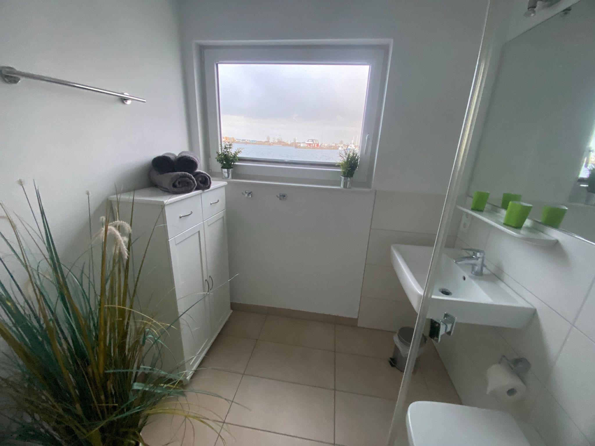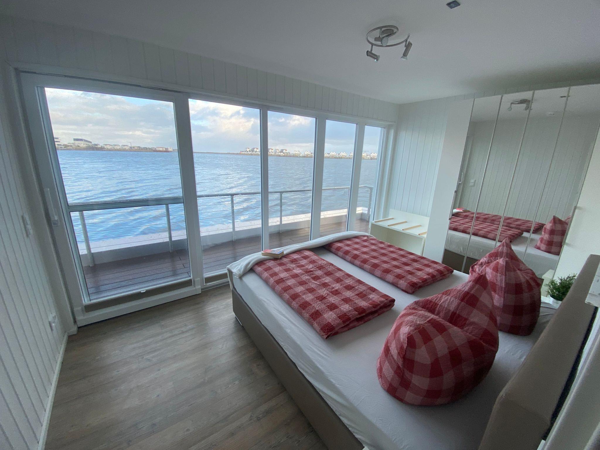 Here, too, the large window fronts offer a gigantic view of the harbour basin and harbour entrance! The open-plan kitchen, dining area and living area are integrated over an area of approx. 25 square metres. A dining table with five chairs is available in the dining area.