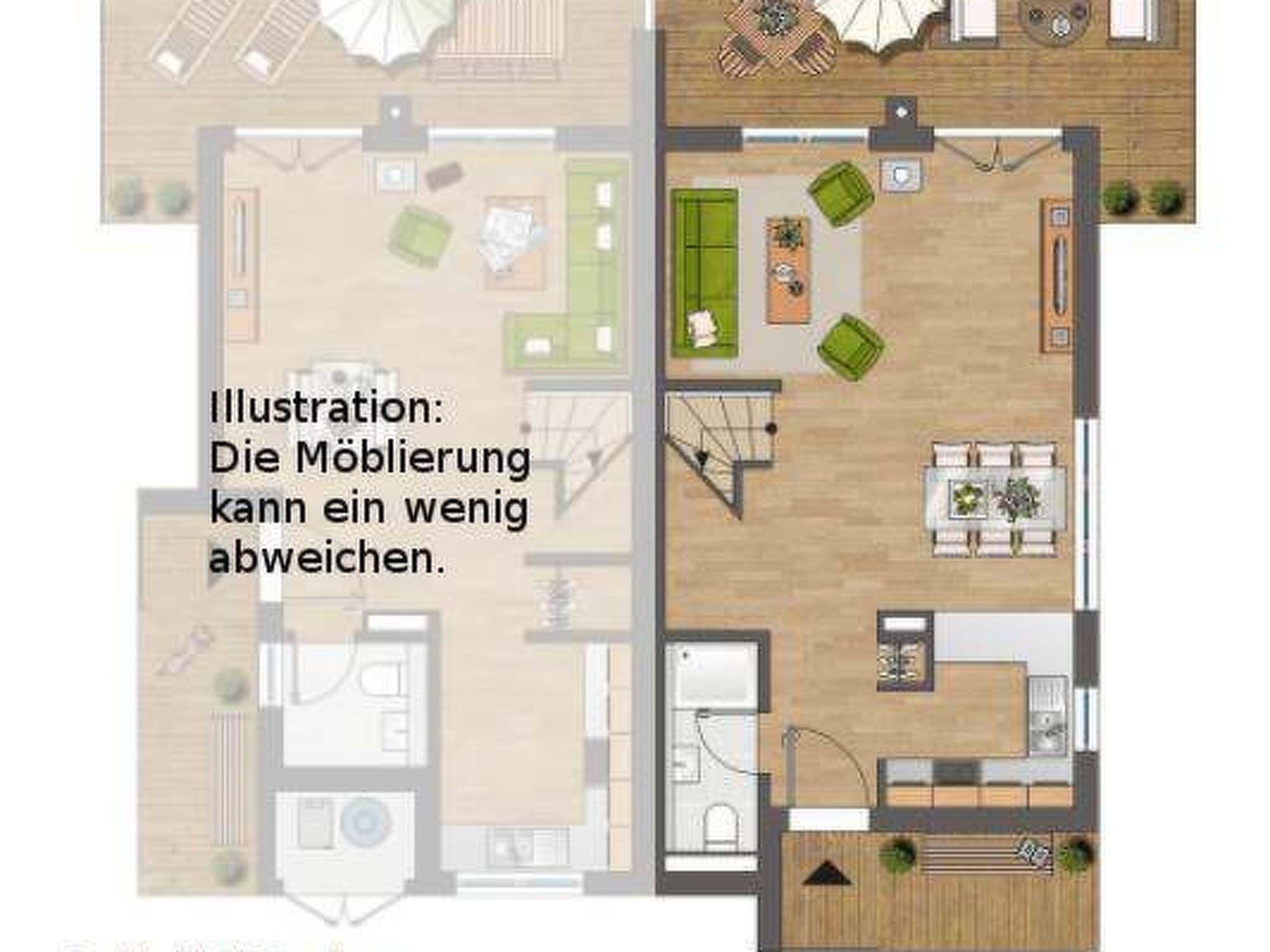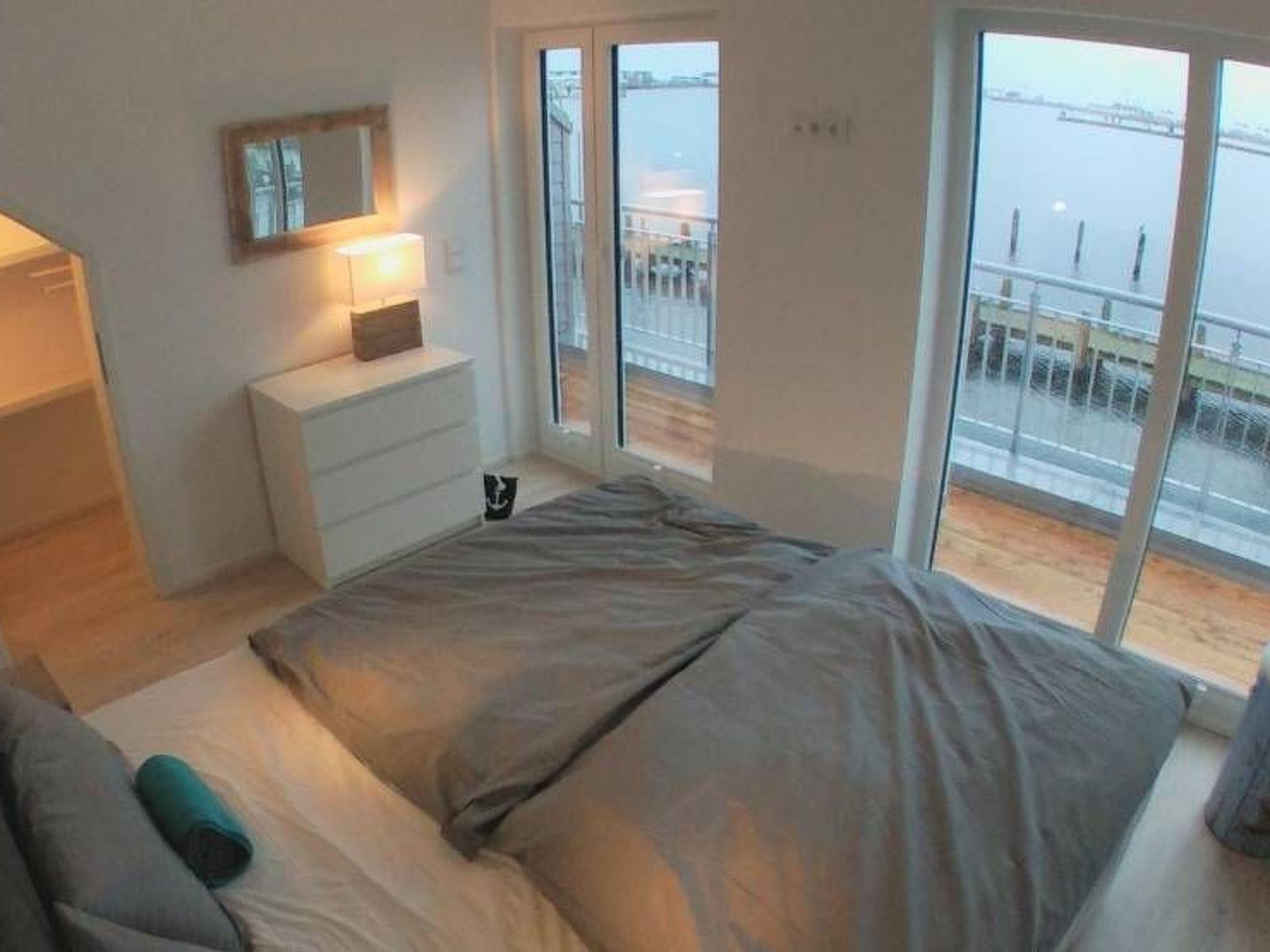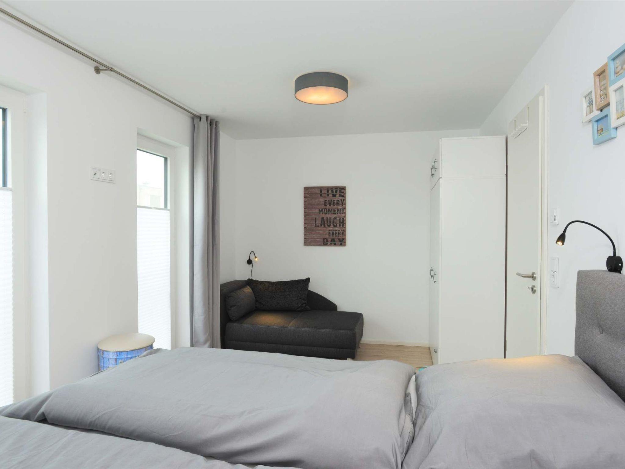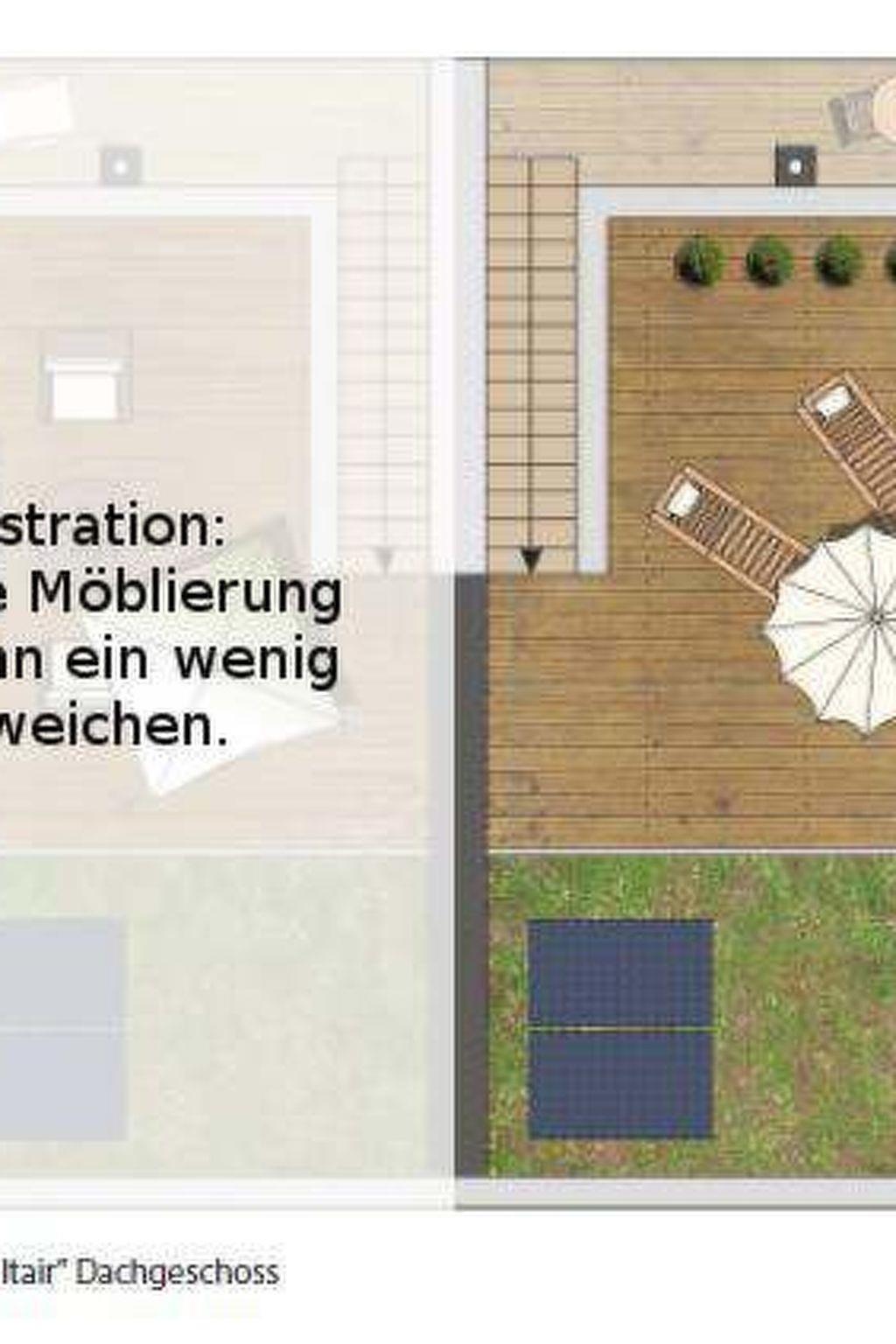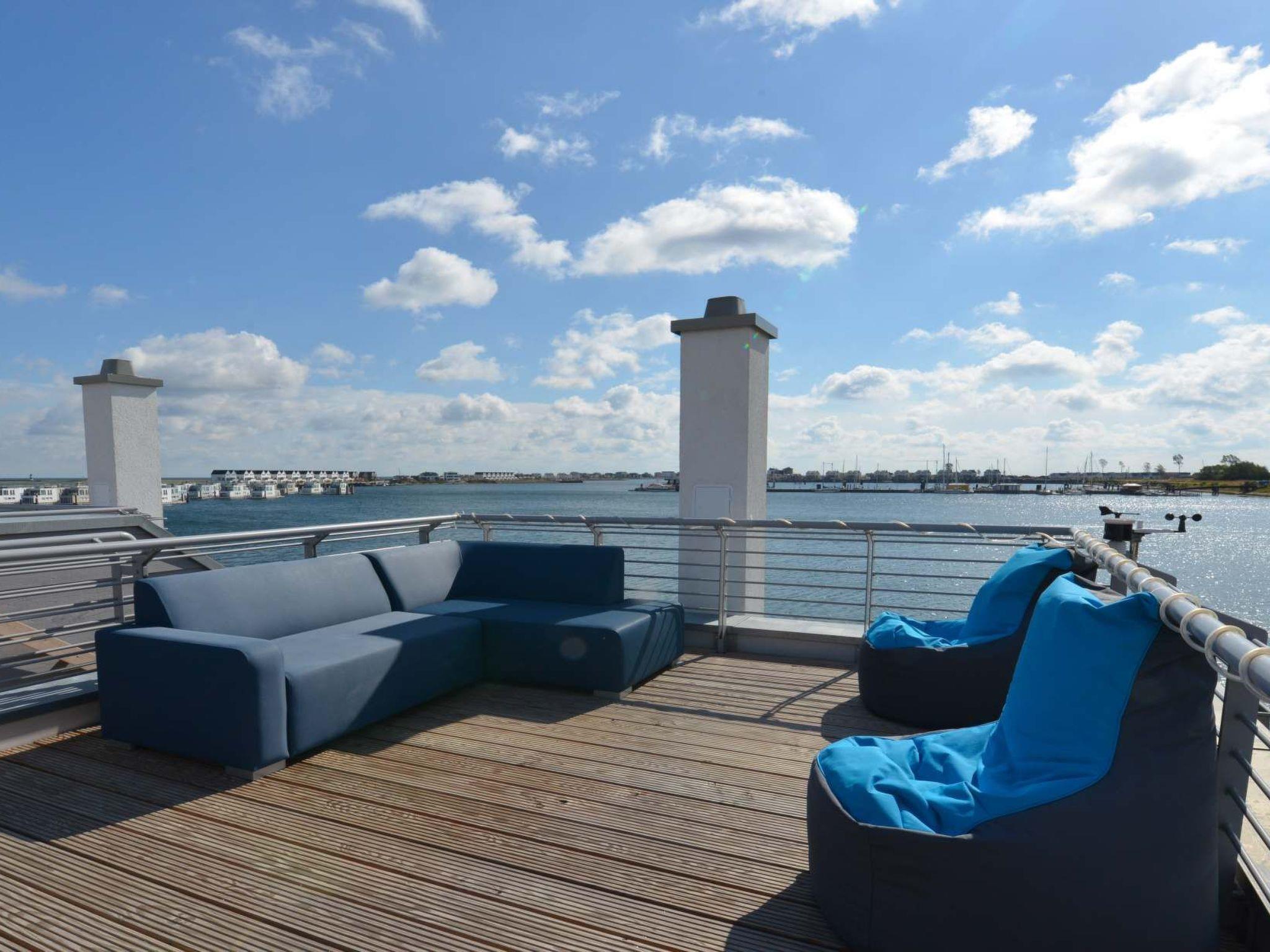 The holiday home, newly built by the end of 2017 and furnished to a high standard, offers a spacious and light-flooded living/dining area and a first-class equipped kitchen with access to the ground floor terrace and garden. A further balcony and a large roof terrace with all-round water views (west and east-facing and partly also north and south-facing) with sun loungers and a cosy lounge. You also have your own wellness area with shower, sauna and whirlpool (and WC) and another additional bathroom (also with WC and shower). Enjoy your morning coffee on the ground floor terrace and then sunbathe on the upper floor terrace and take your afternoon coffee on the roof terrace and enjoy the sunset. The choice is yours. The harbour promenade is only about 200m away (Edeka & Café opened in May 2018), the harbour is only 300m away (the beautiful 5km long sandy beach is only 1400m away.