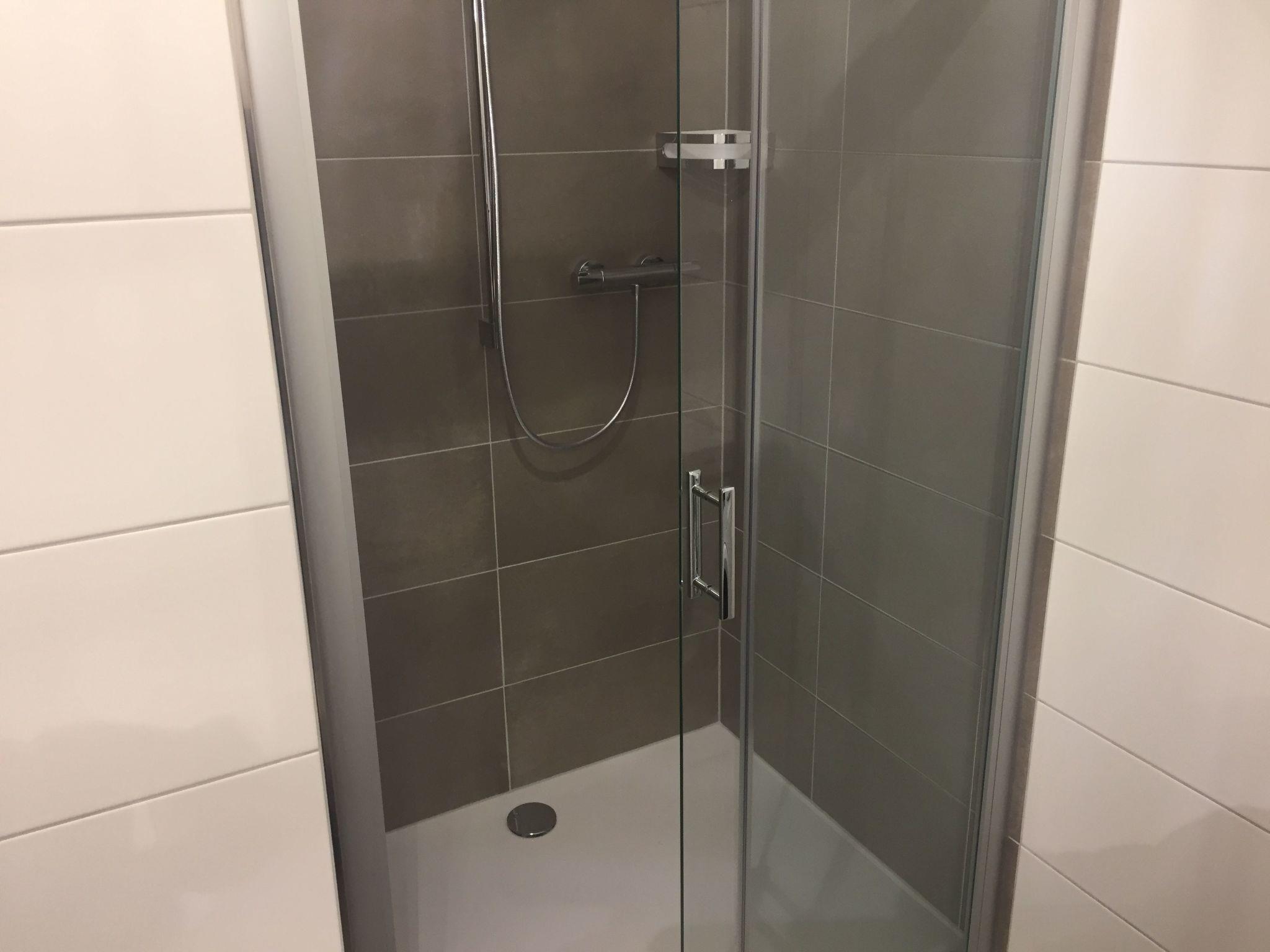 The interior of this charming harbour flat offers a spacious living, dining and kitchen area, a small balcony, hallway, bedroom and a bathroom with a large shower area.