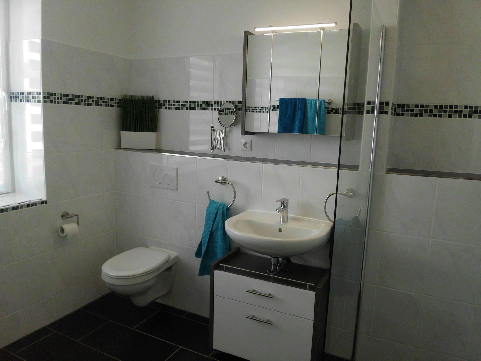 The apartment provides a big bedroom with a double bed (180 x 200cm) with very good foam mattresses and a big wardrobe. The very comfortable living room has an additional sofa bed, an armchair and a flatscreen TV with a DVD player. There is a dining space next to it for dining, sitting and playing games together. The kitchen is amply equipped with a fridge and freezer compartment, an electric hob and oven, a dishwasher, microwave, coffee machine, kettle and plenty of crockery, glasses, cutlery and cooking utensils. The generous shower room with a walk-in shower is functionally equipped and includes a cupboard with a mirror, a makeup mirror and a hairdryer.