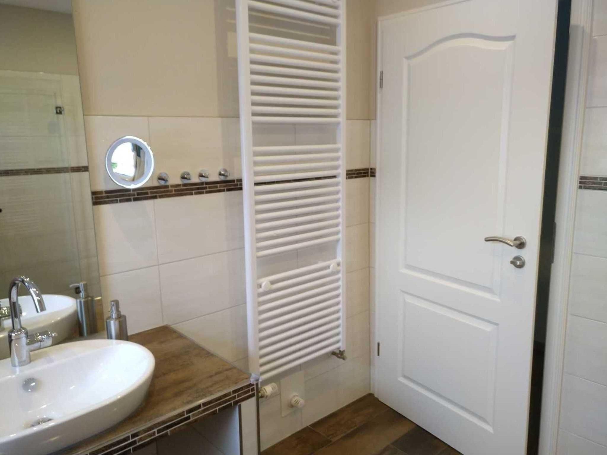 • Duschbad mit ebenerdiger Dusche, Duschhocker, Hänge-WC mit Bügeln, unterfahrbarer Waschtisch, Handtuchheizkörper und Fußbodenheizung; Handtücher inklusive