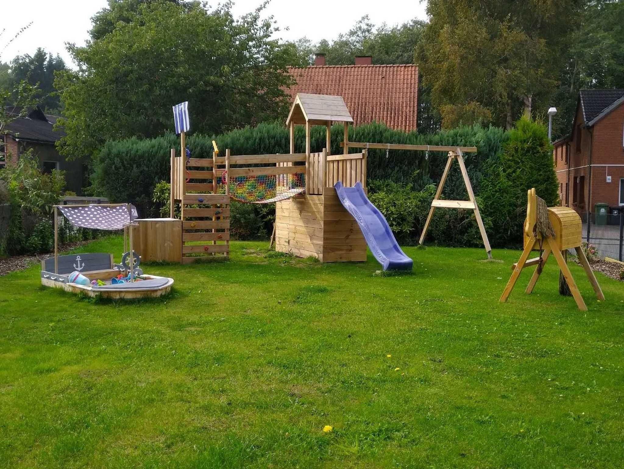 • Spielplatz mit Schaukel, Rutsche, Kletterwand, Sandkistenschiff und Holzpferd
