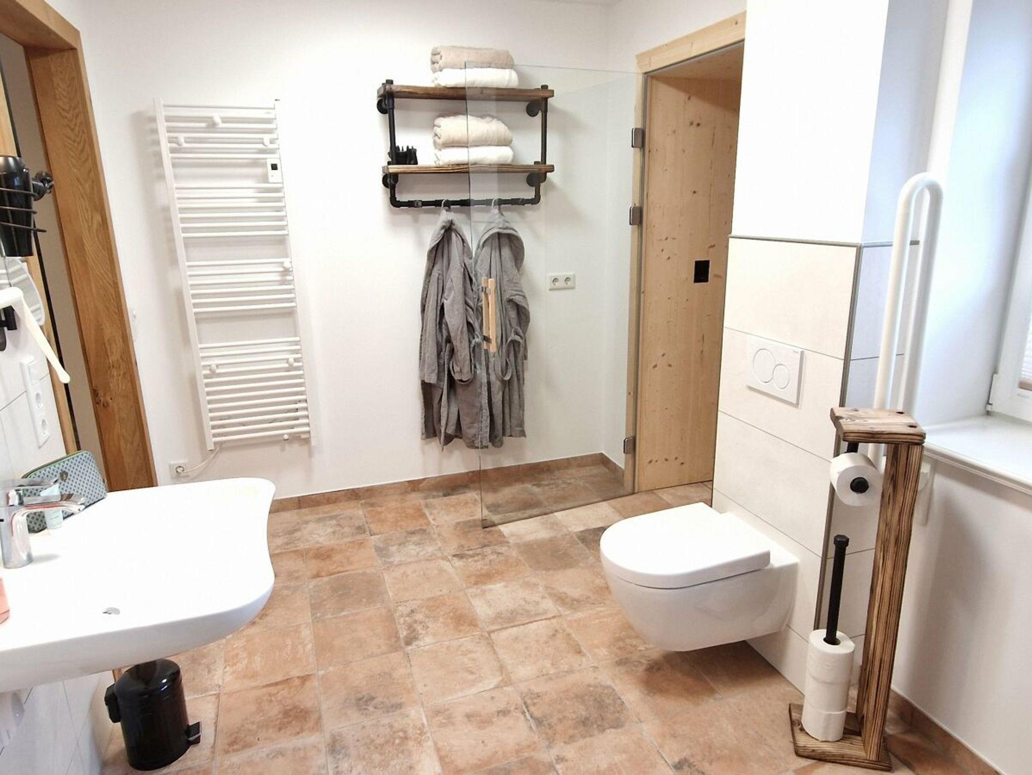 - Duschbad mit ebenerdiger Regendusche, Handtuchheizkörper und anliegender finnischer