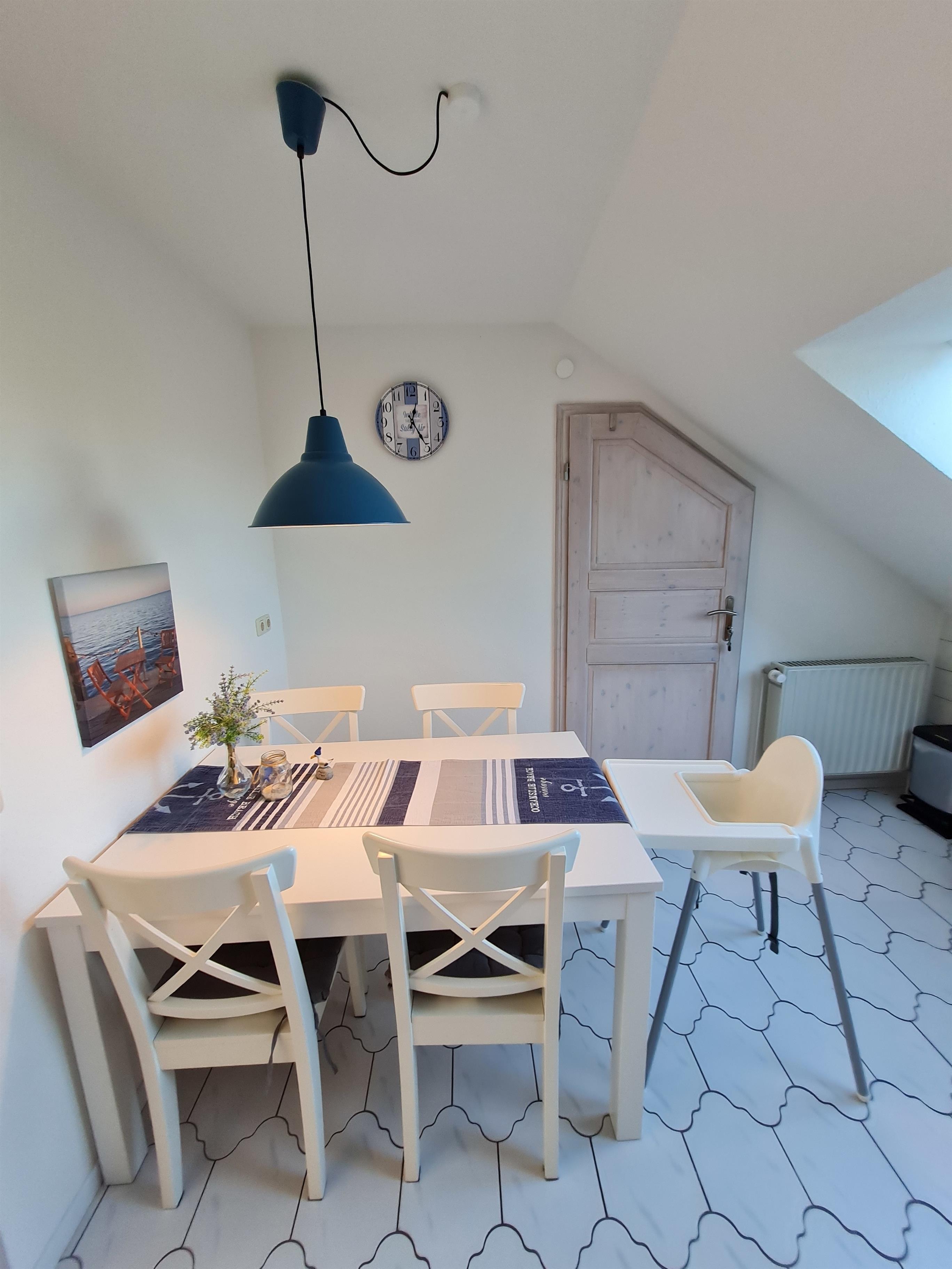 Die Ferienwohnung liegt in der ersten Etage und bietet Platz für 4 Personen und ein Kleinkind bis 3 Jahre (Kinderbett). Bei uns sind Kinder und Hunde willkommen. Auf Anfrage bieten wir Ihnen einen Transferservice gegen eine Gebühr an.