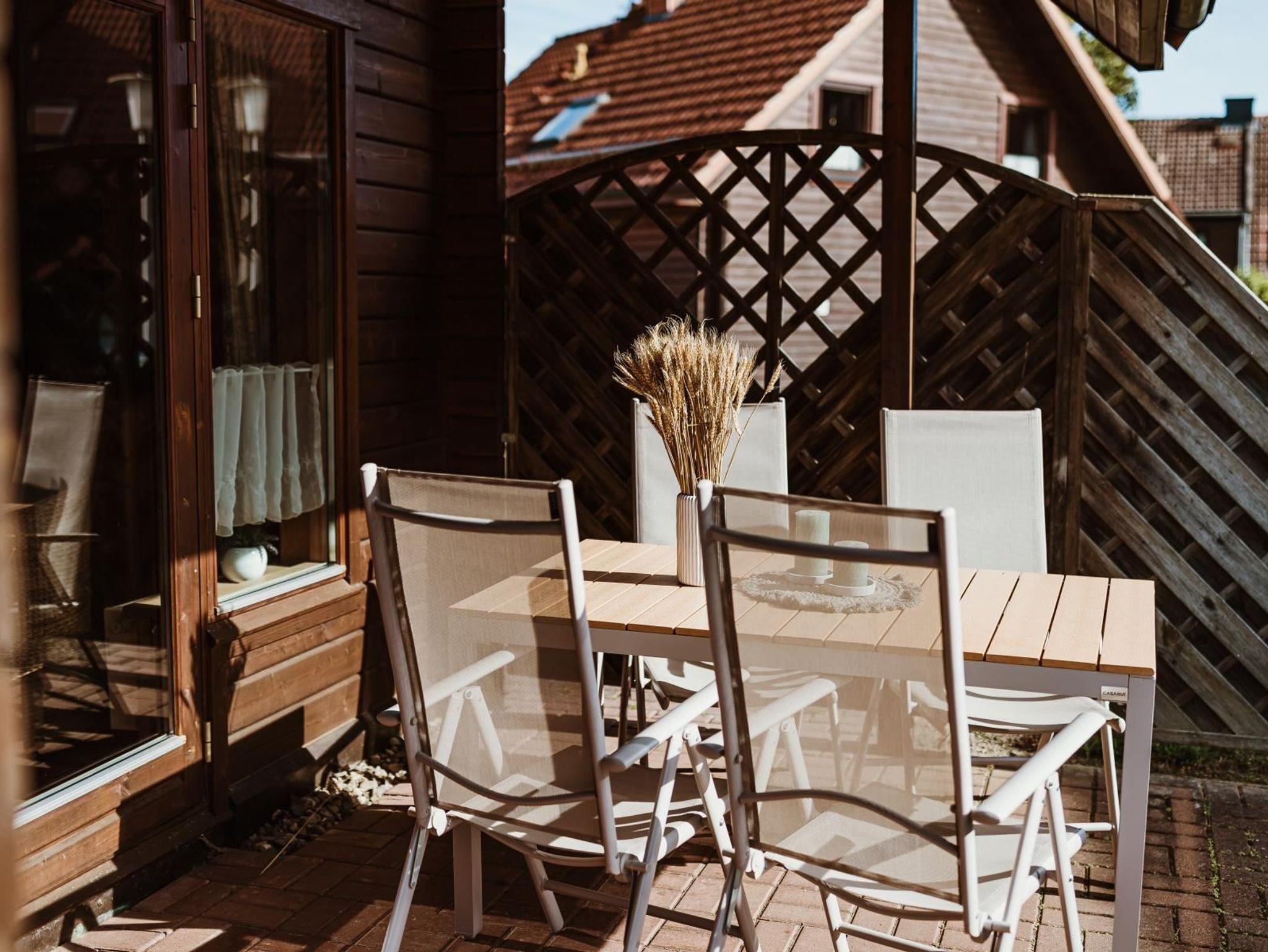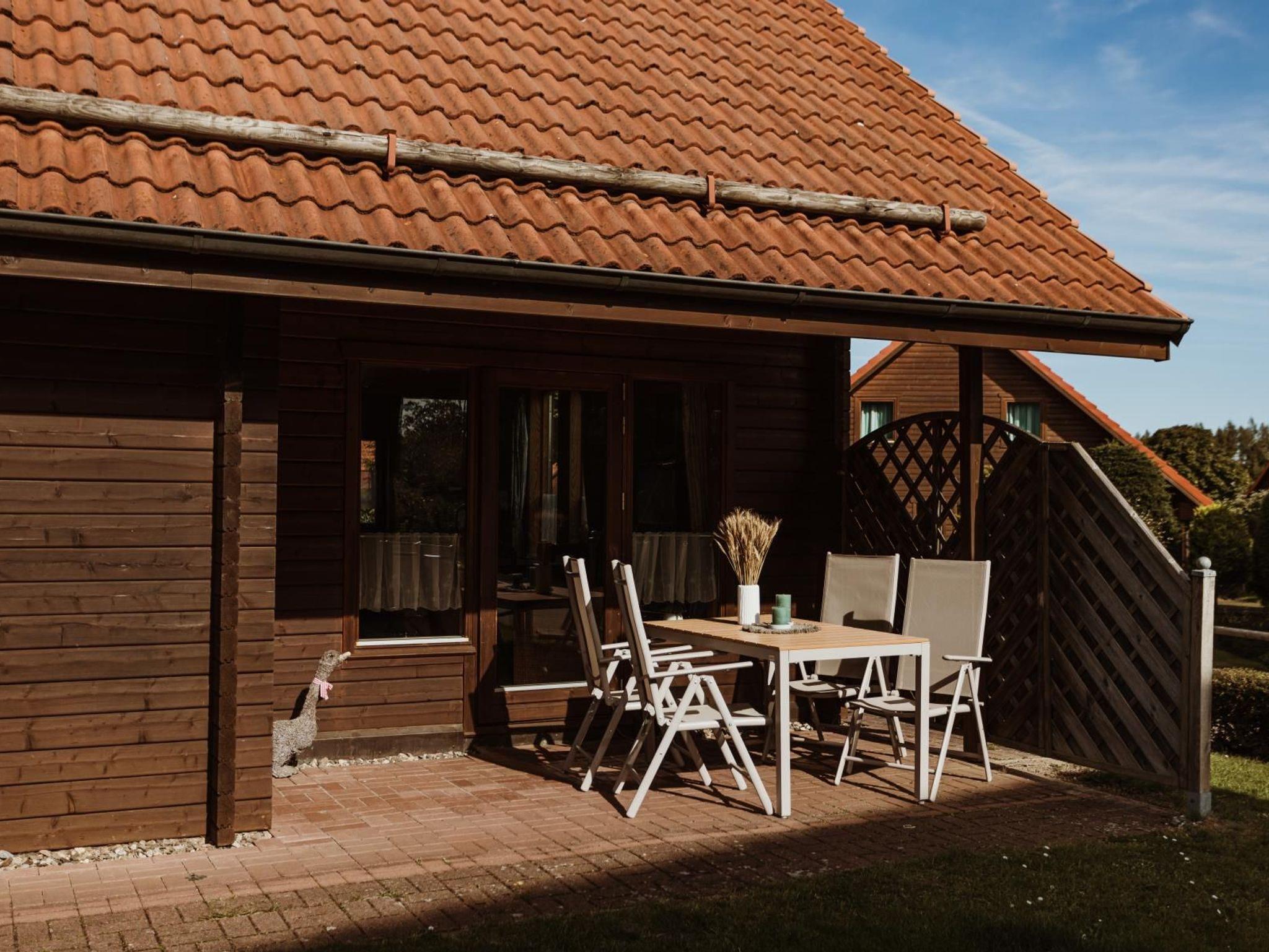Die 3-Zimmer-Doppelhaushälfte in Holzbauweise bietet auf ca. 65 m² Platz für bis zu 4 Personen. Im Erdgeschoss befindet sich ein geräumiger Wohnbereich mit SAT-TV, CD-Radio und separatem Essplatz. Die Küchenzeile ist vollständig ausgestattet und verfügt über einen Geschirrspüler. Zudem stehen ein Abstellraum und ein separates Gäste-WC zur Verfügung. Im Dachgeschoss befinden sich zwei Schlafzimmer mit je einem Doppelbett sowie ein Duschbad mit WC. Außen ergänzen eine weitgehend überdachte Terrasse mit Liegestühlen sowie ein abschließbarer Abstellraum das Angebot. Ein PKW-Stellplatz ist in der Anlage vorhanden.
