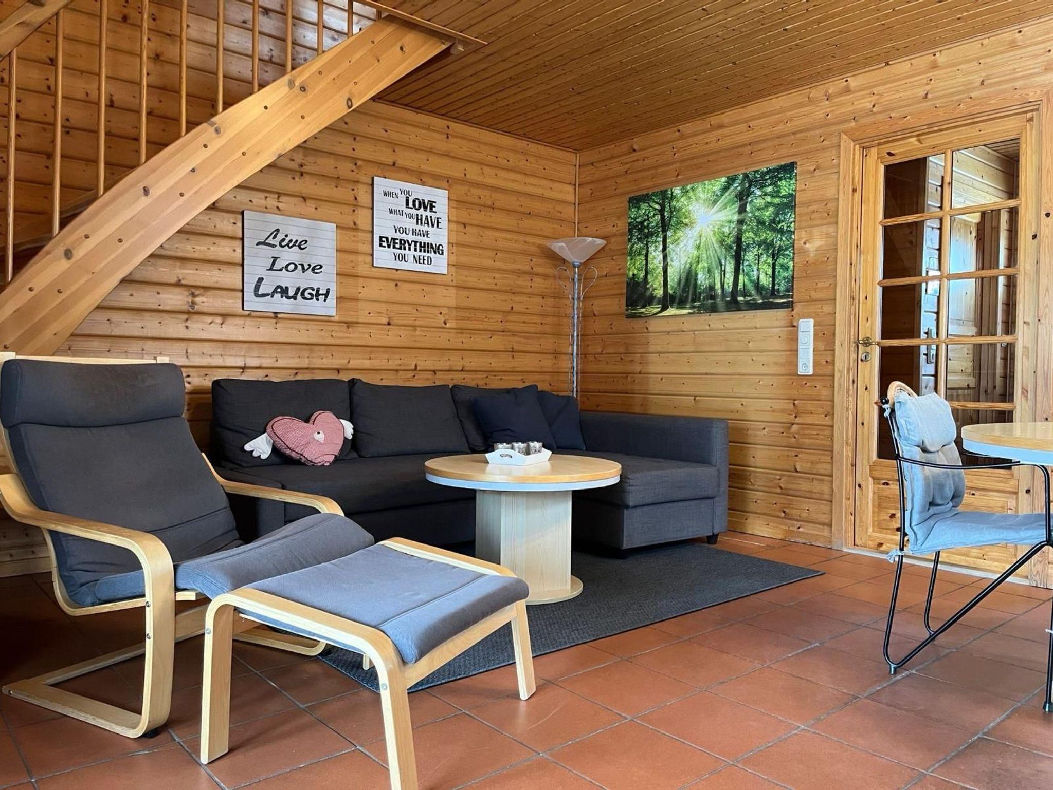 Die Doppelhaushälfte in Holzbauweise bietet auf rund 65 m² Wohnfläche Platz für vier Personen. Im Erdgeschoss befinden sich ein kleiner Flur mit Gäste-WC, Garderobe und Abstellkammer sowie ein Wohnbereich mit offener, vollständig ausgestatteter Küche (Kühlschrank, Herd, Geschirrspüler, Mikrowelle, Kaffeemaschine, Toaster, Eierkocher), Essplatz und Sofaecke. Vom Wohnbereich aus gelangt man auf die weitgehend überdachte Sonnenterrasse mit Tisch und Stühlen. Ein zusätzlicher, abschließbarer Abstellraum steht im Außenbereich zur Verfügung.