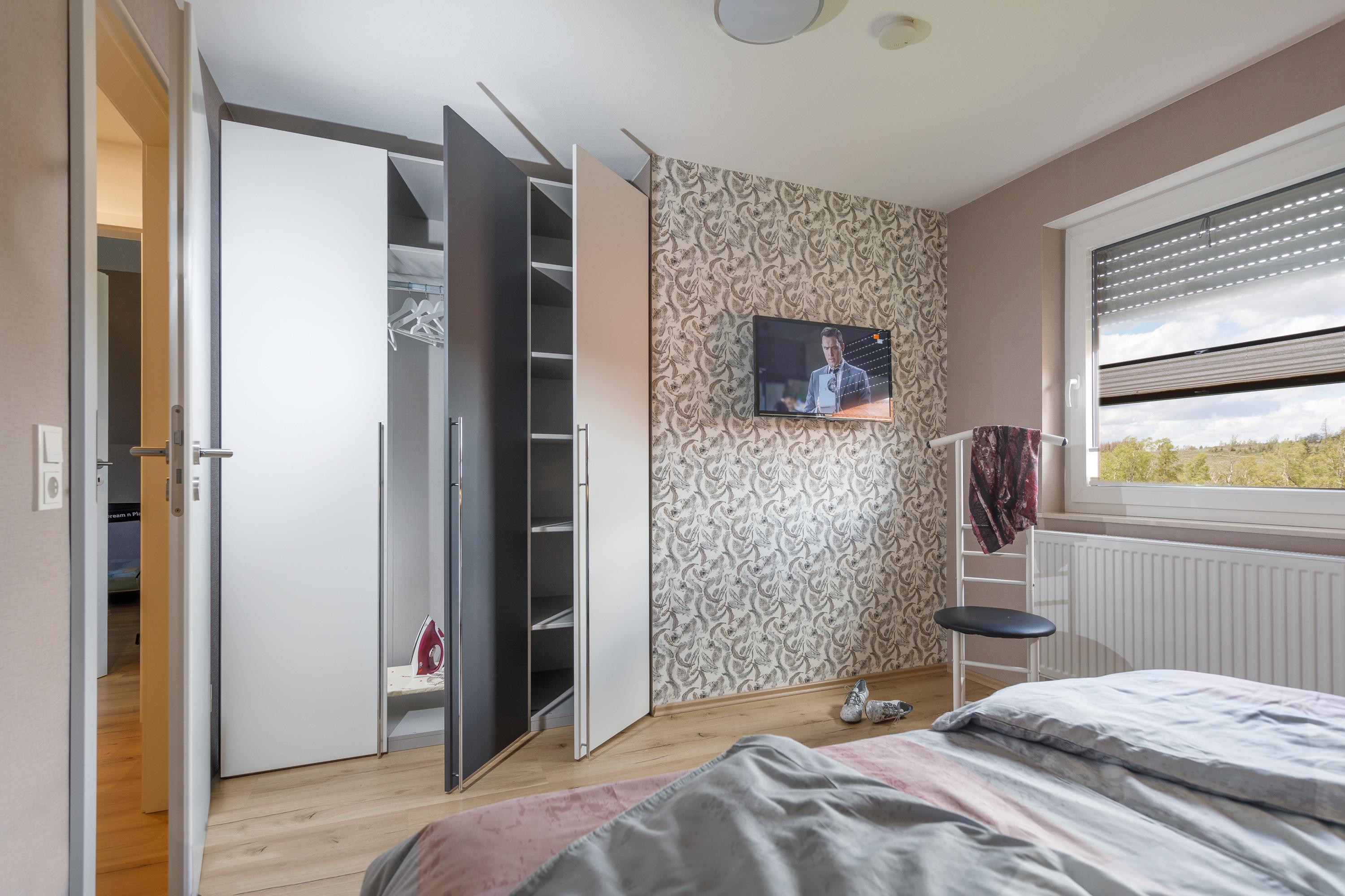 Doppelbett, Kleiderschrank, SAT-TV.