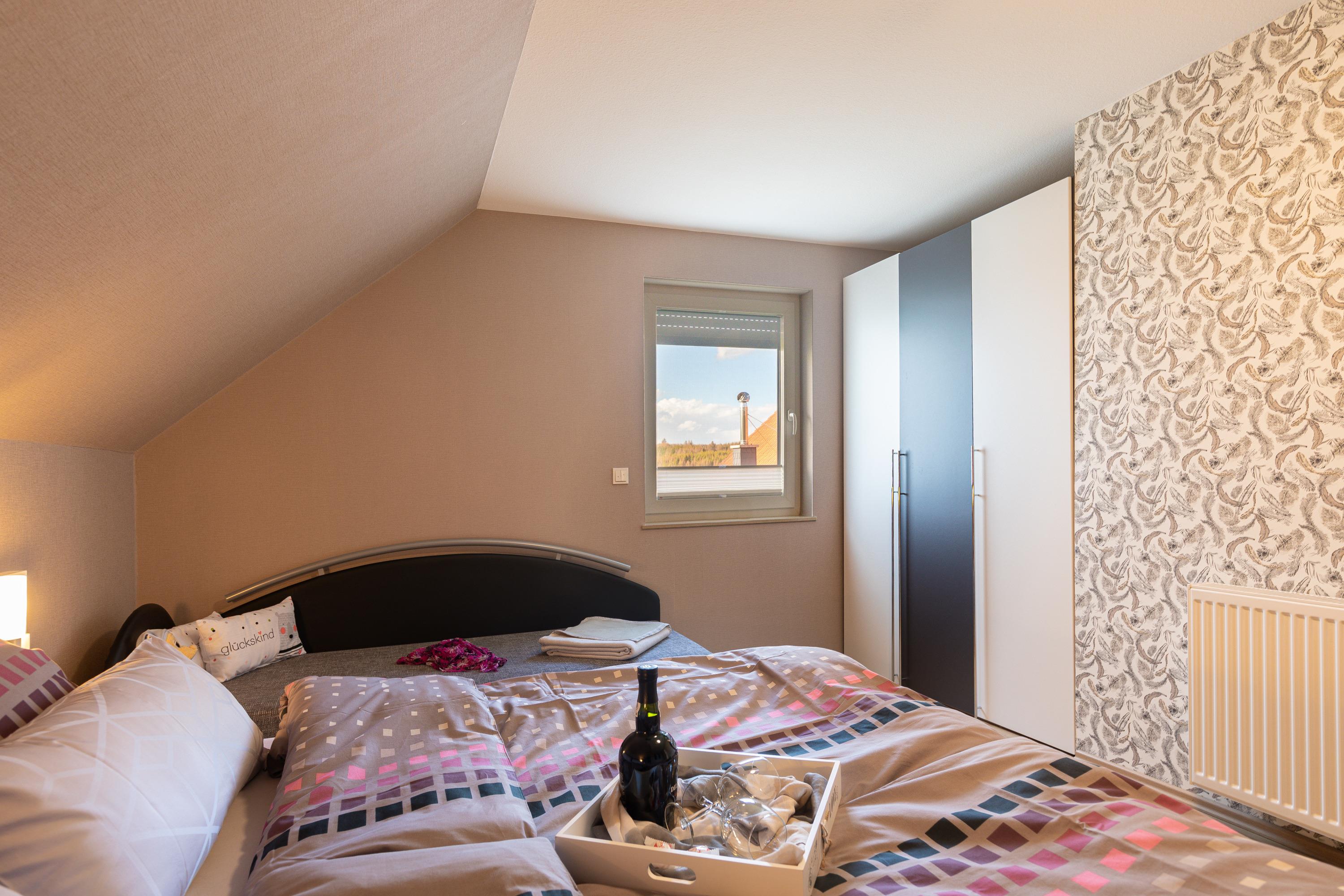 Doppelbett, zusätzliche Aufbettungsmöglichkeit, Kleiderschrank.