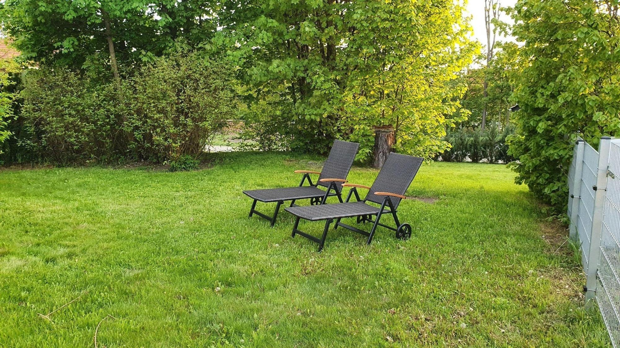 eine Terrasse mit Gartenmöbel, Sonnenschirm und 5 x Liegestühlen