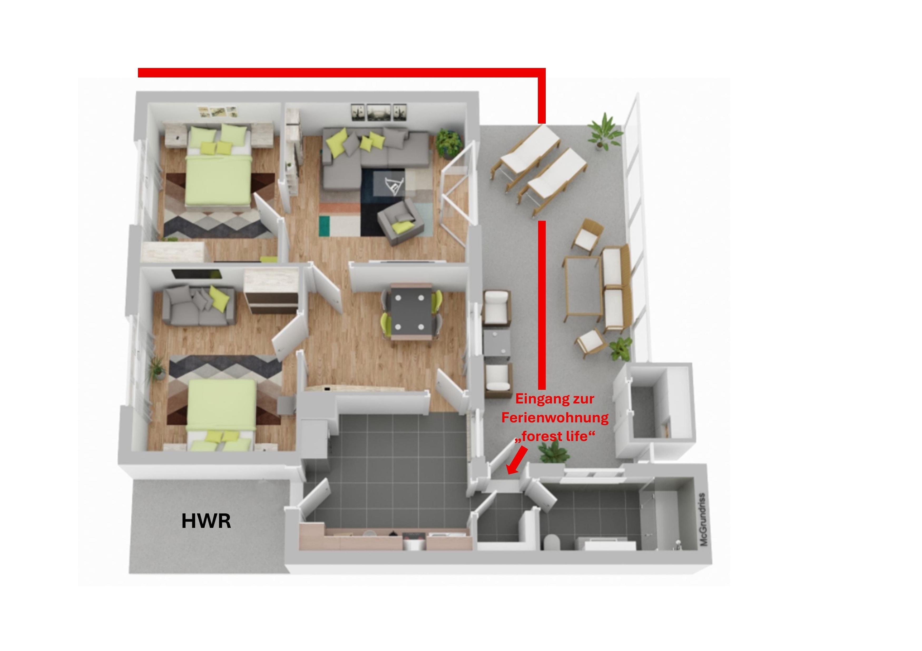 Auf etwa 75 m² bietet sie Platz für bis zu 5 Personen und lädt zum Entspannen im " forest life" ein.