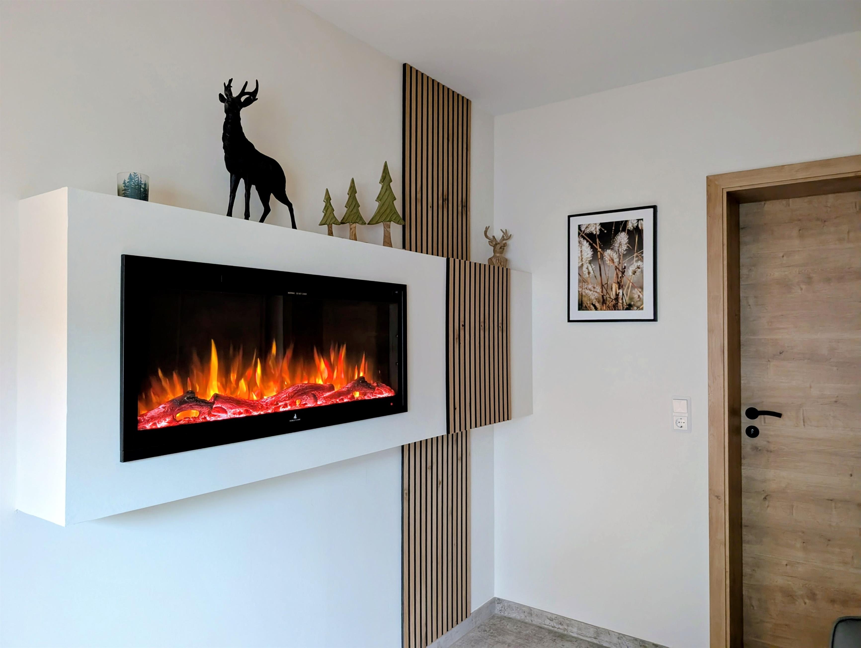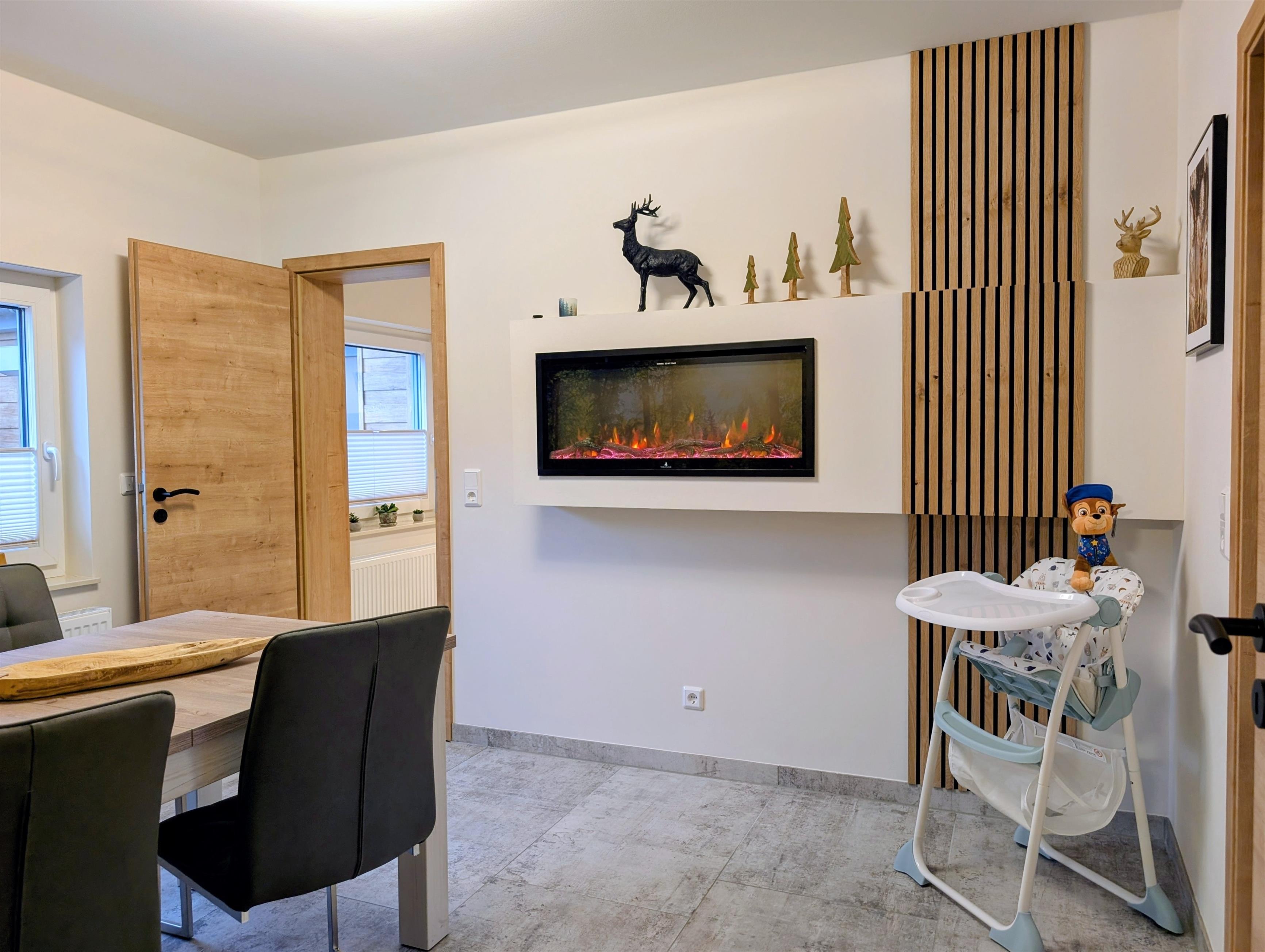Virtueller Kamin im Esszimmer mit Radio welches über Bluetooth anwählbar ist.