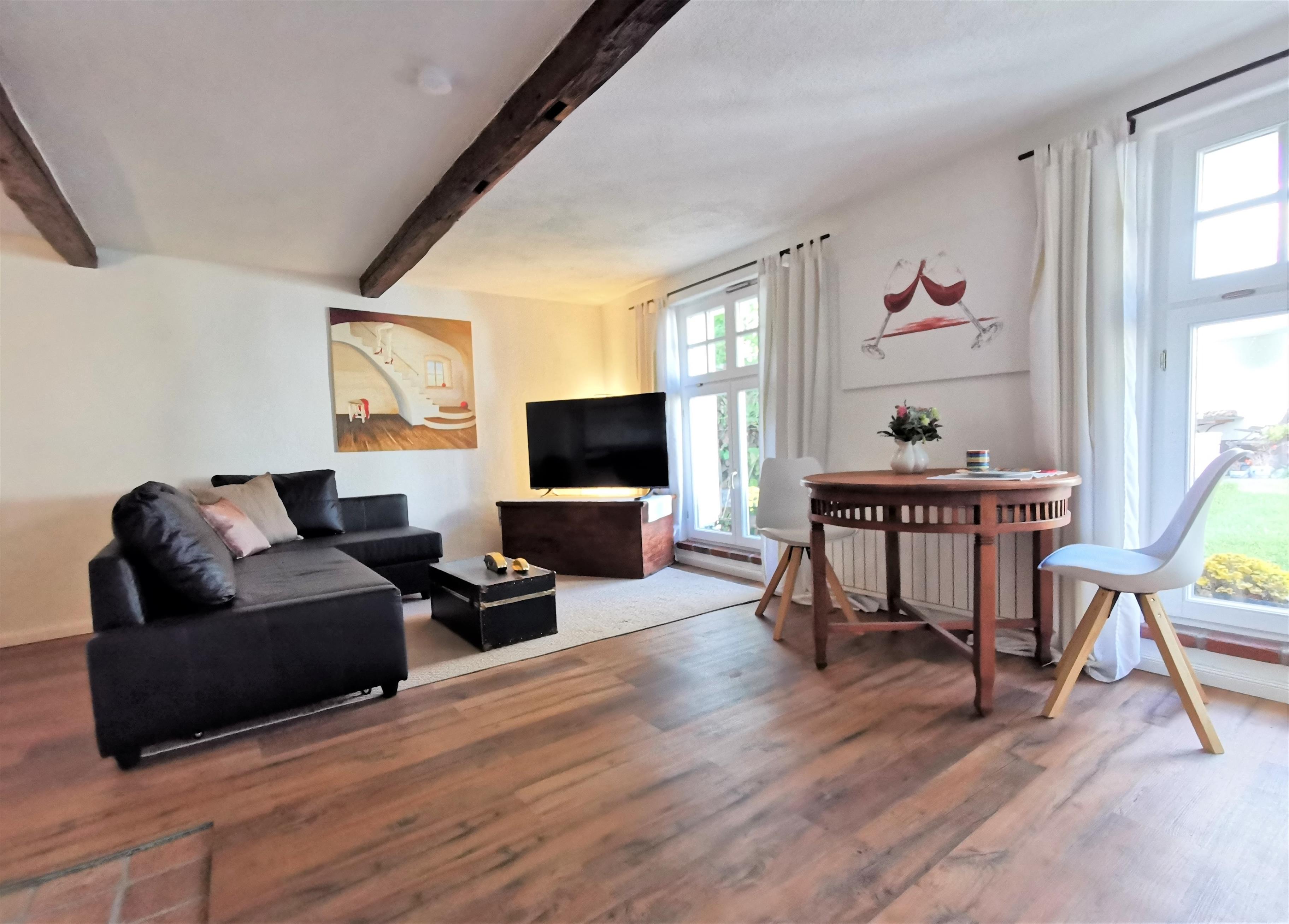 Im Erdgeschoss der Wohnung befindet sich der Wohnbereich, der mit einer bequemen Schlafcouch ausgestattet ist. Von dem Sofa haben sie einen schönen Blick in den kleinen Garten. Die Küchenzeile und der Essbereich sowie das Bad befindet sich ebenfalls im Erdgeschoss.