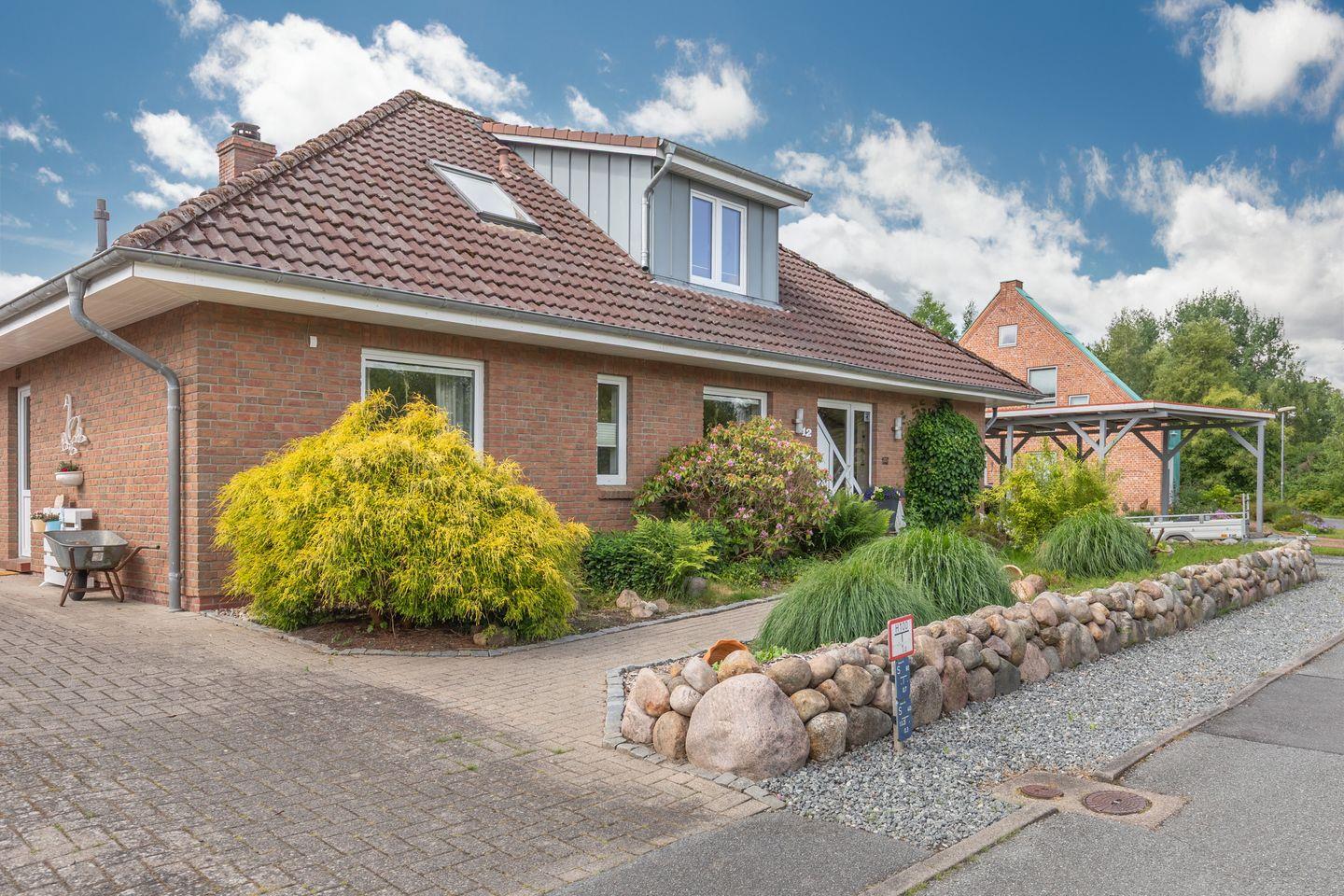 Die unmittelbare Umgebung ist geprägt von ruhigem Dorfcharakter. Einkaufsmöglichkeiten sind nur 300 Meter entfernt und somit schnell zu Fuß erreichbar. Die Nordsee mit dem nächsten Strand erreichen Sie nach etwa 3.000 Metern – optimal für Ausflüge ans Meer, ohne auf die Ruhe eines ländlichen Domizils zu verzichten. Durch die Lage im ersten Stock eines Hauses mit nur einer Etage genießen Sie einen geschützten Rückzugsort mit Blick ins Grüne.