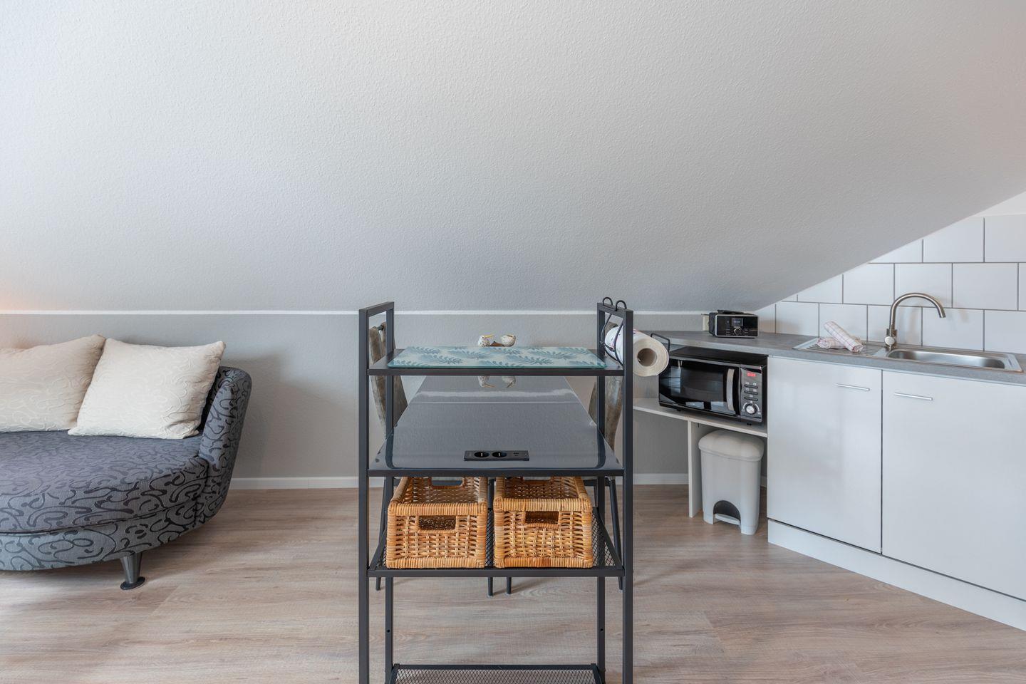 Die Küche ist voll ausgestattet und überzeugt mit Ceranherd, Mikrowelle, Kühlschrank, Gefrierfach, Wasserkocher, Espressokaffeemaschine, Eierkocher, Toaster sowie vielfältigem Kochzubehör. Geschirr, Besteck und Küchenutensilien gehören zur Ausstattung dazu.