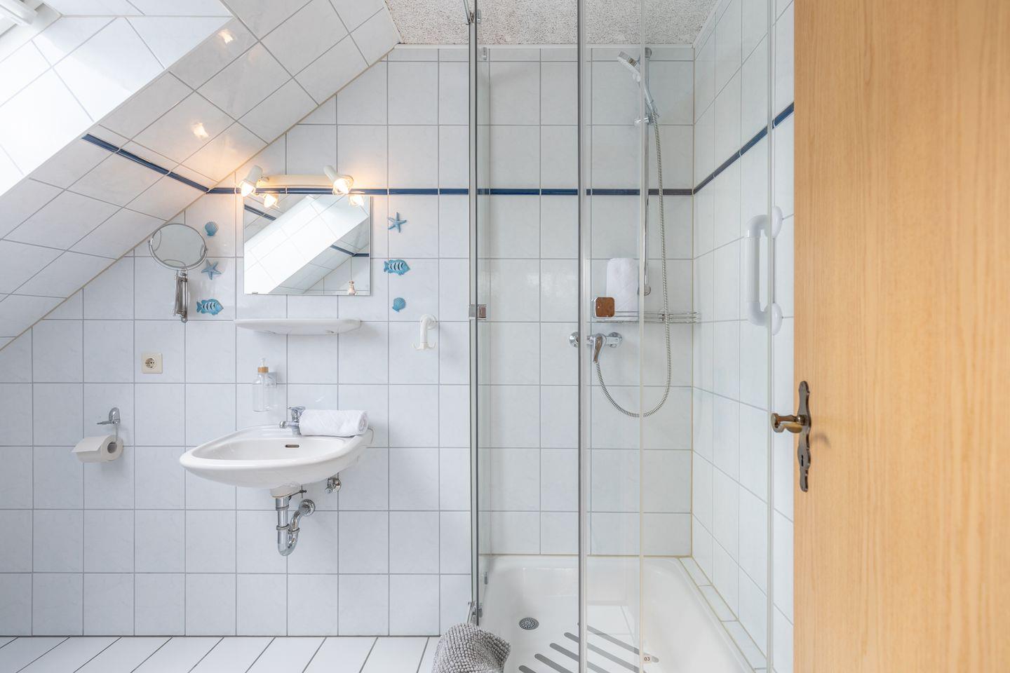 Die Küche ist vollständig ausgestattet und umfasst einen Ceranherd, Backofen, Kühlschrank mit Gefrierfach, Kaffeemaschine (Filtermaschine), Toaster, Wasserkocher, Eierkocher, Geschirr, Besteck sowie Küchenutensilien. Somit sind sowohl die Zubereitung kleinerer Snacks als auch vollwertiger Mahlzeiten problemlos möglich. Für den Komfort im Bad sorgen eine Dusche, ein Waschbecken, ein WC, ein Haartrockner sowie ein Kosmetikspiegel und Spiegel.