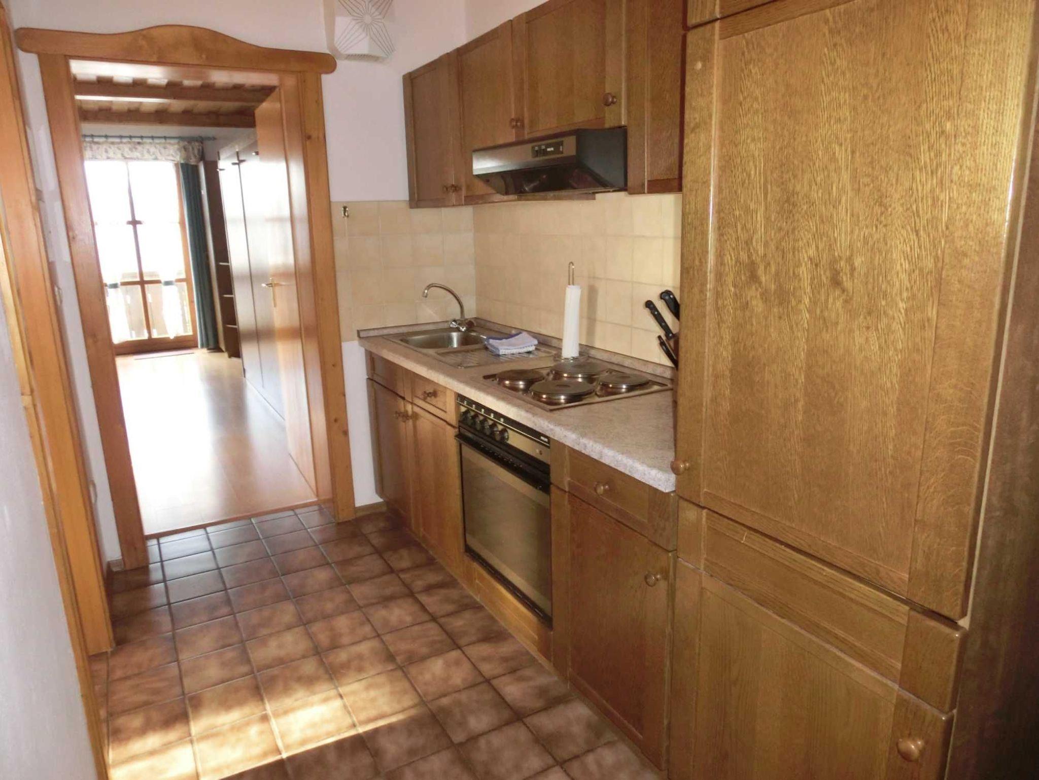 Die Nichtraucher - Ferienwohnung hat einen Flur mit einem offenen Küchenbereich. Die Küchenzeile ist ausgestattet mit einem E-Herd mit 4 Platten und einem Backofen, Kühlschrank mit kleinem Gefrierfach, Filterkaffeemaschine, Wasserkocher, Toaster, Geschirr für 4 Personen.
