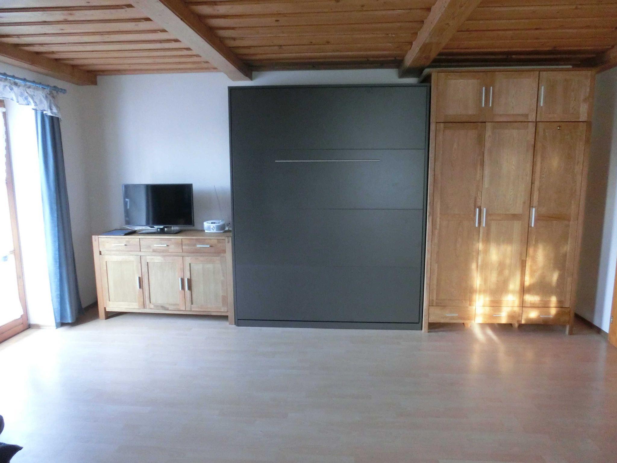 Im großen Wohnzimmer finden Sie eine Essecke mit Sitzbank und zwei Stühlen, sowie eine Sitzgarnitur mit zwei Sesseln. Ferner steht ein großer Kleiderschrank und ein ausklappbares Schrankwandbett (Matratze 160 x 200) zur Verfügung. Ein TV-Flachbild ist vorhanden und das WLAN Netz steht kostenlos zur Verfügung.
