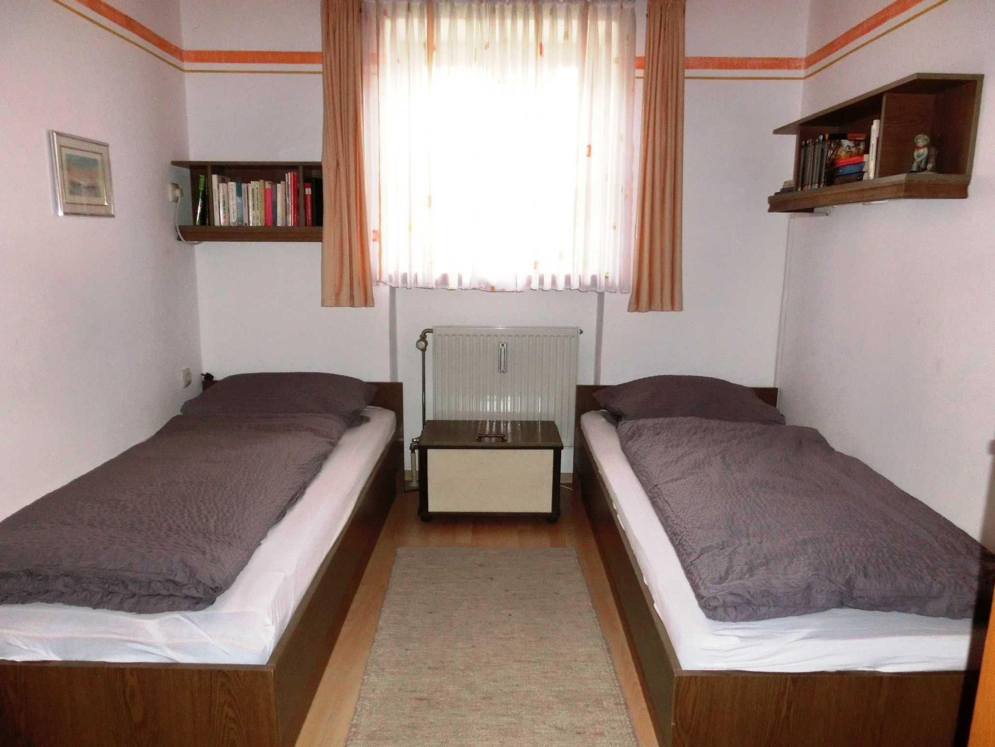 Im Schlafzimmer befinden sich zwei getrennt stehende Einzelbetten (90x190), ein Kleiderschrank und ein Tisch mit zwei Stühlen.