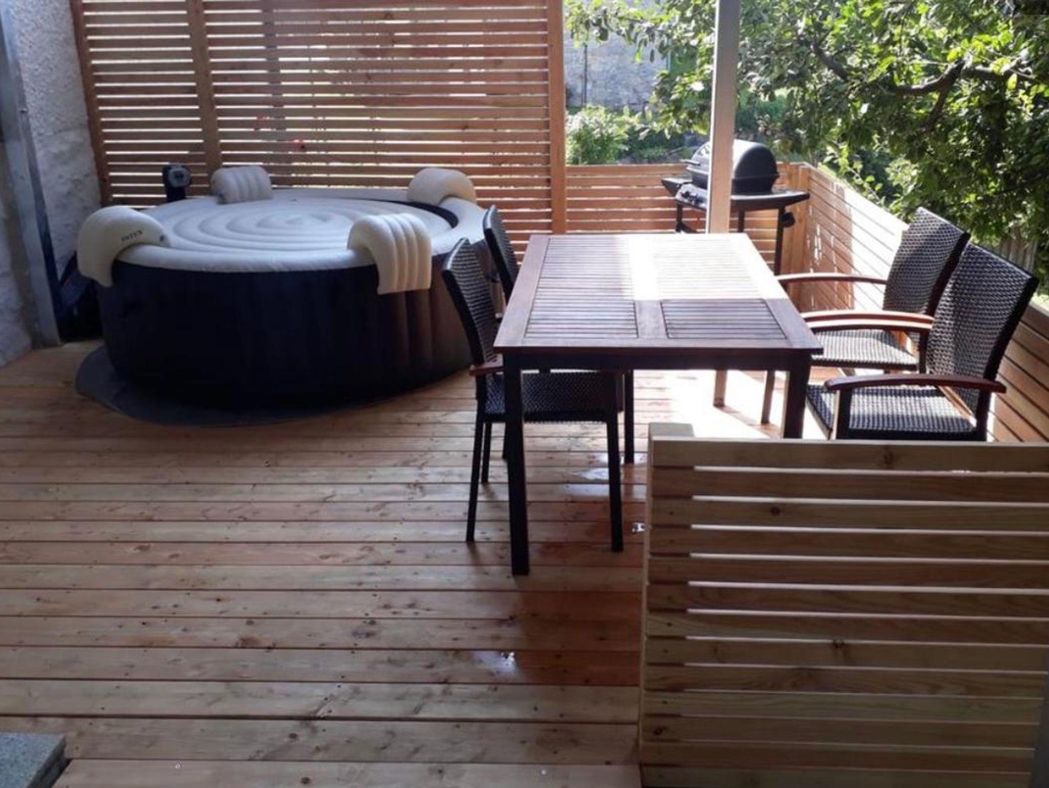 Ein Schlafbereich mit Boxspringbett, Zimmer mit Schlafsofa , Bad mit Dusch , extra WC und eigener Terrasse mit Whirlpool und direktem Zugang zum Garten.