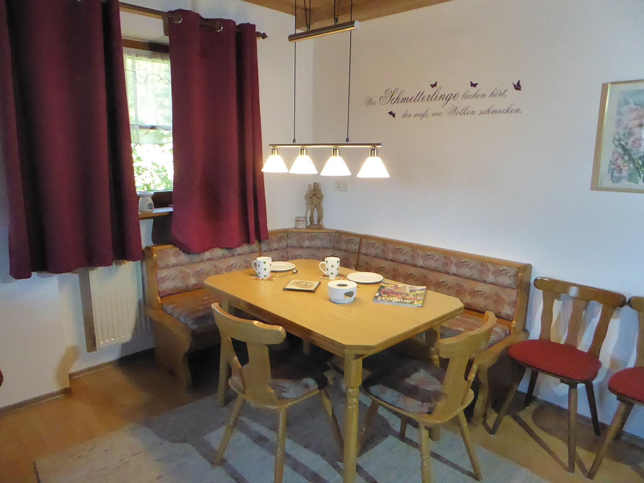 Essecke mit Eckbank und 6 Stühlen, Couchgarnitur, TV, Kabel, Radio und einen Balkon mit herrlicher Aussicht.