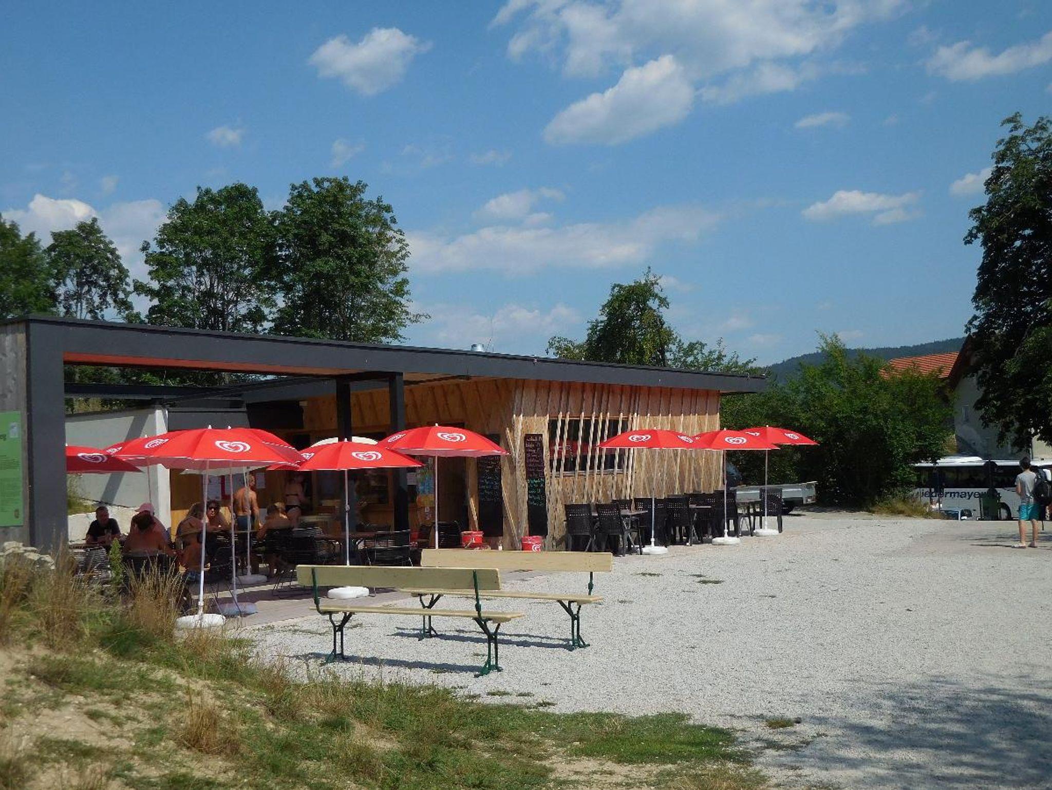 Freibad mit Liegewiese in der Anlage. Ein Badesee liegt in ca, 500 m Entfernung.
