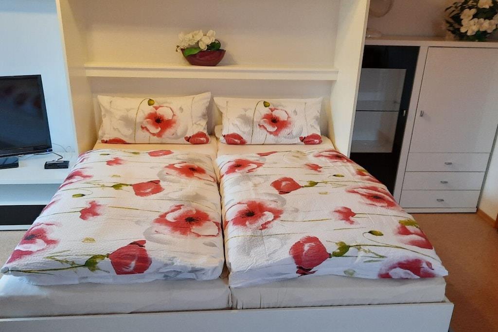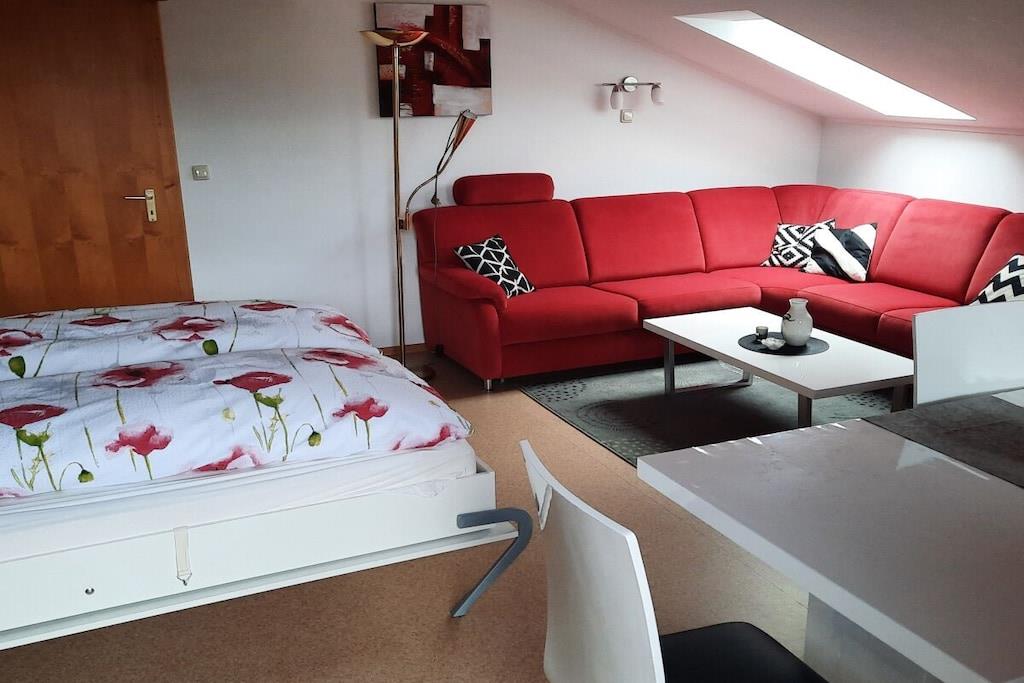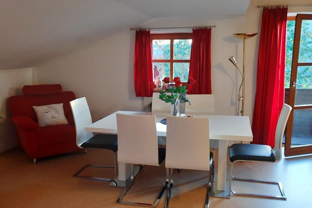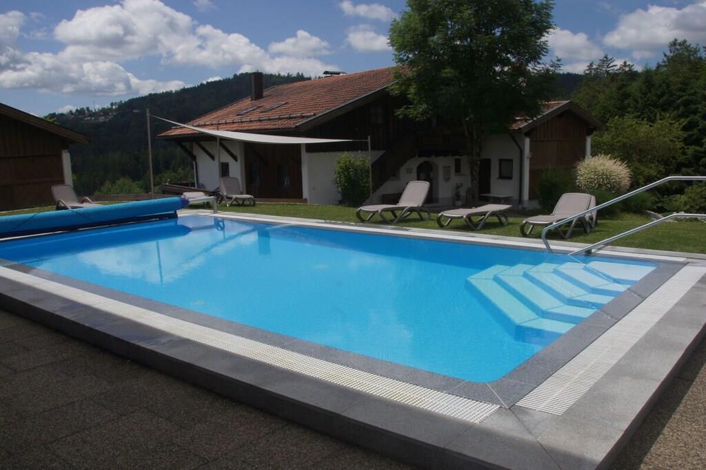 Die südlich gelegene komfortable Dachgeschoßwohnung mit traumhaftem Balkonblick auf Hauzenberg u. Umgebung, mit hauseigenem Hallenbad , Sauna u. Freibad lassen keine Wünsche übrig. Eigener Parkplatz vor dem Haus, Grillmöglichkeiten, Spielplatz (ideal für Kinder) steht Ihnen zur Verfügung. Die Wohnung ist für 4 Personen mit vollwertigen Betten ausgestattet, für Kleinkind kann ein Kinderreisebett u. Kinderstuhl bereit gestellt werden. Geräumiges Wohnzimmer mit Essbereich u. Sitzecke, Doppelbett (Schrankbett) Fernseher, Radiogerät u. WLAN, weiteres Schlafzimmer für 2 Pers. eine moderne volleingerichtete Küche mit Backofen, Microwelle, Kühlschrank u. vielem mehr., modernes Bad mit Dusche u. Toilette.
